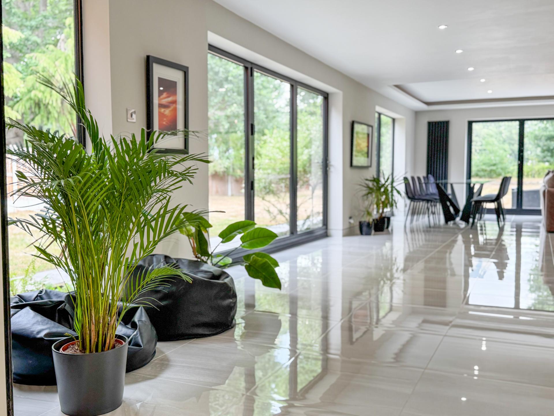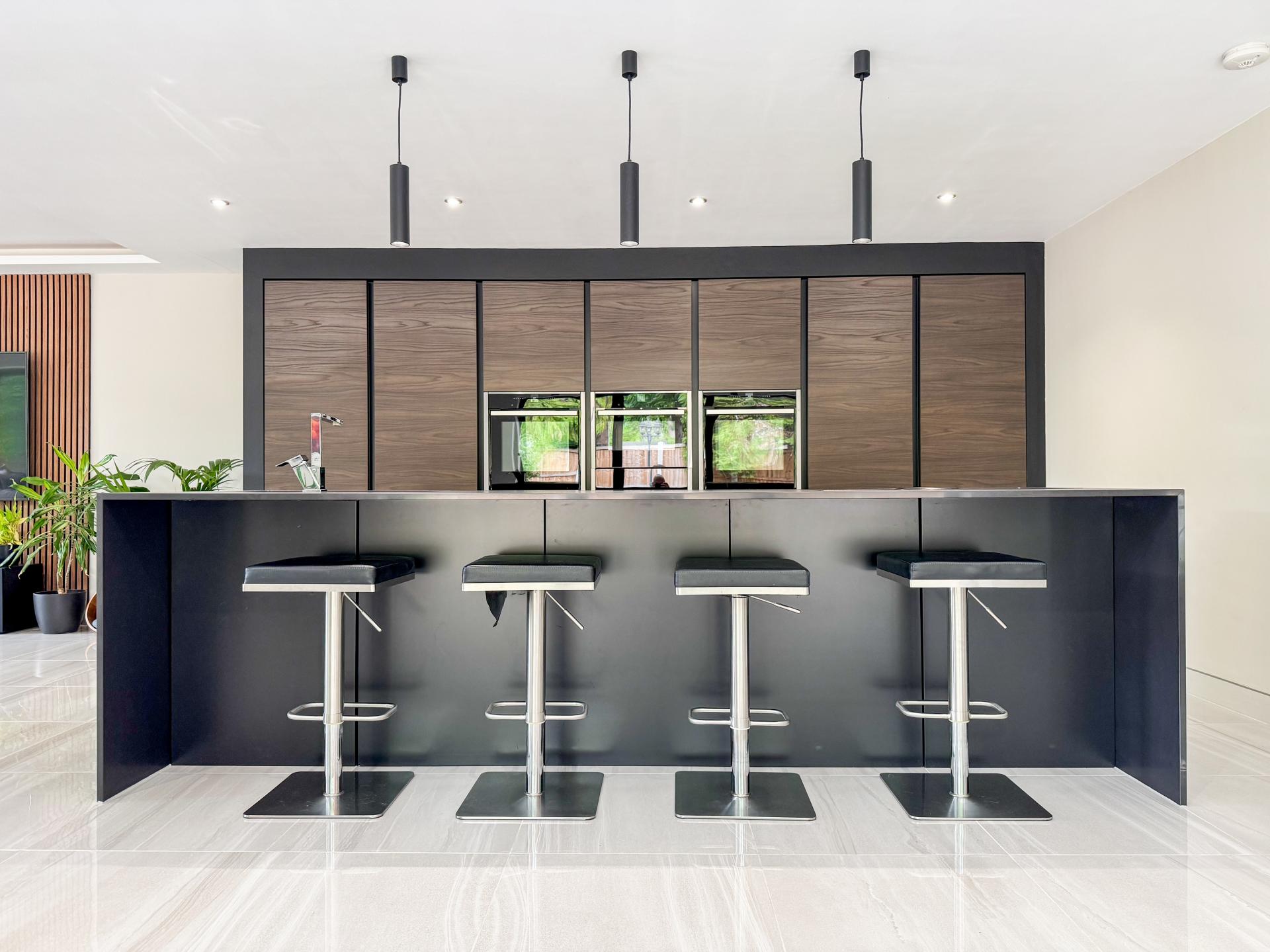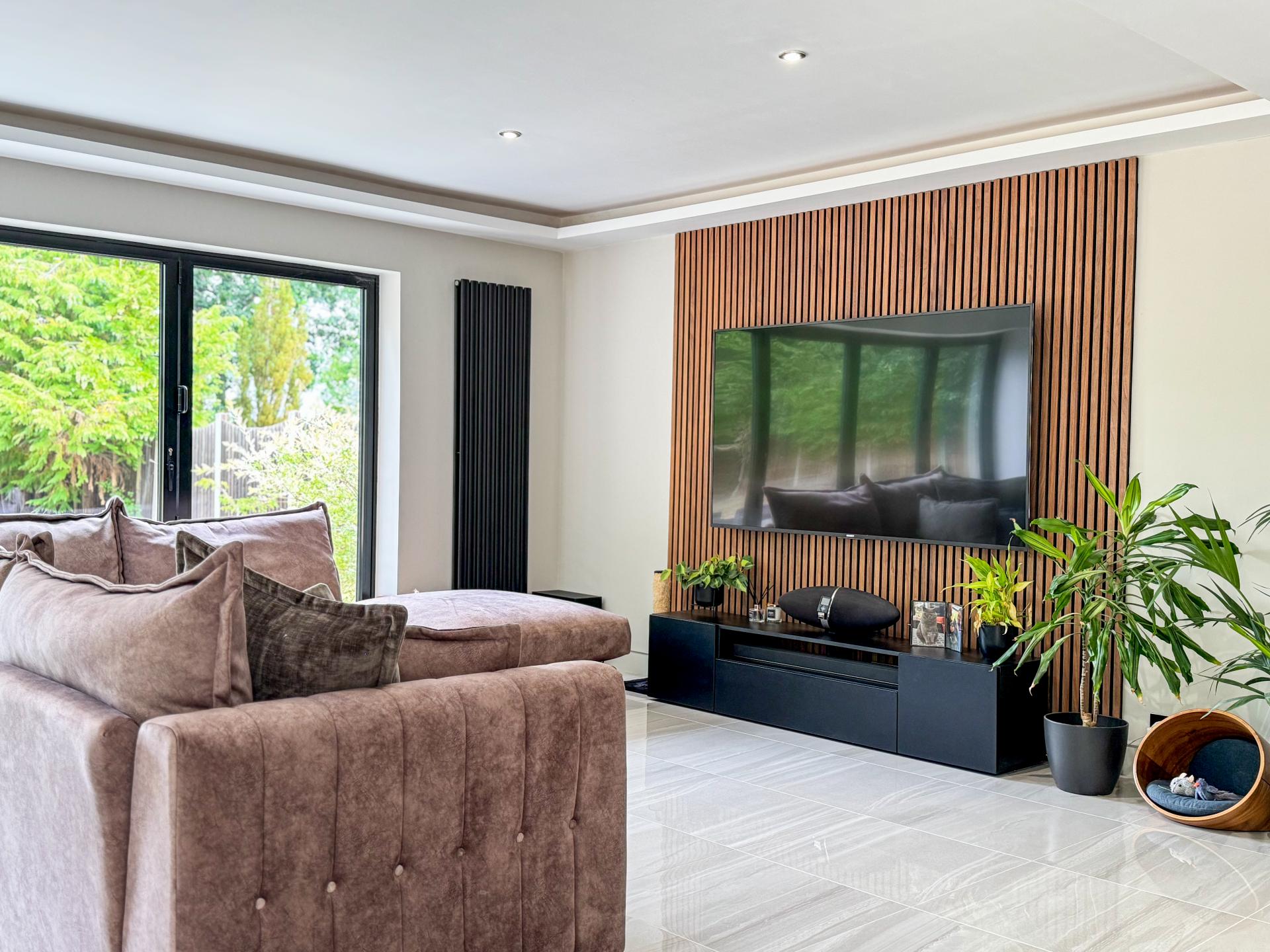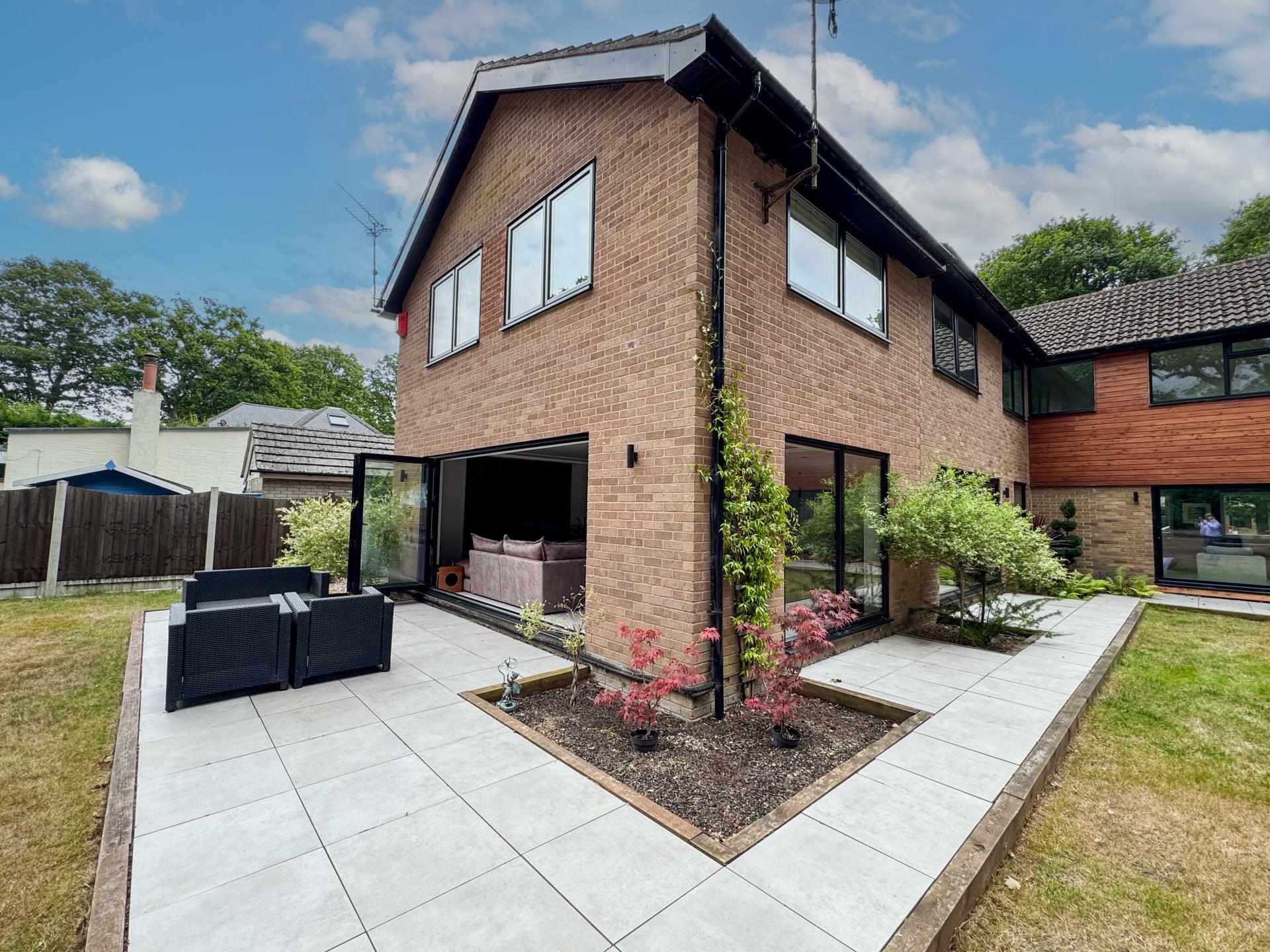 Adjacent is the striking kitchen/dining family room. The high-specification kitchen includes an Elica induction hob and extractor fan, a Neff double hide-and-slide oven, a microwave combi, and a warming drawer, as well as zonal underfloor heating. The open-plan layout encourages fluidity and interaction, with the bifold doors creating the perfect indoor-outdoor environment.