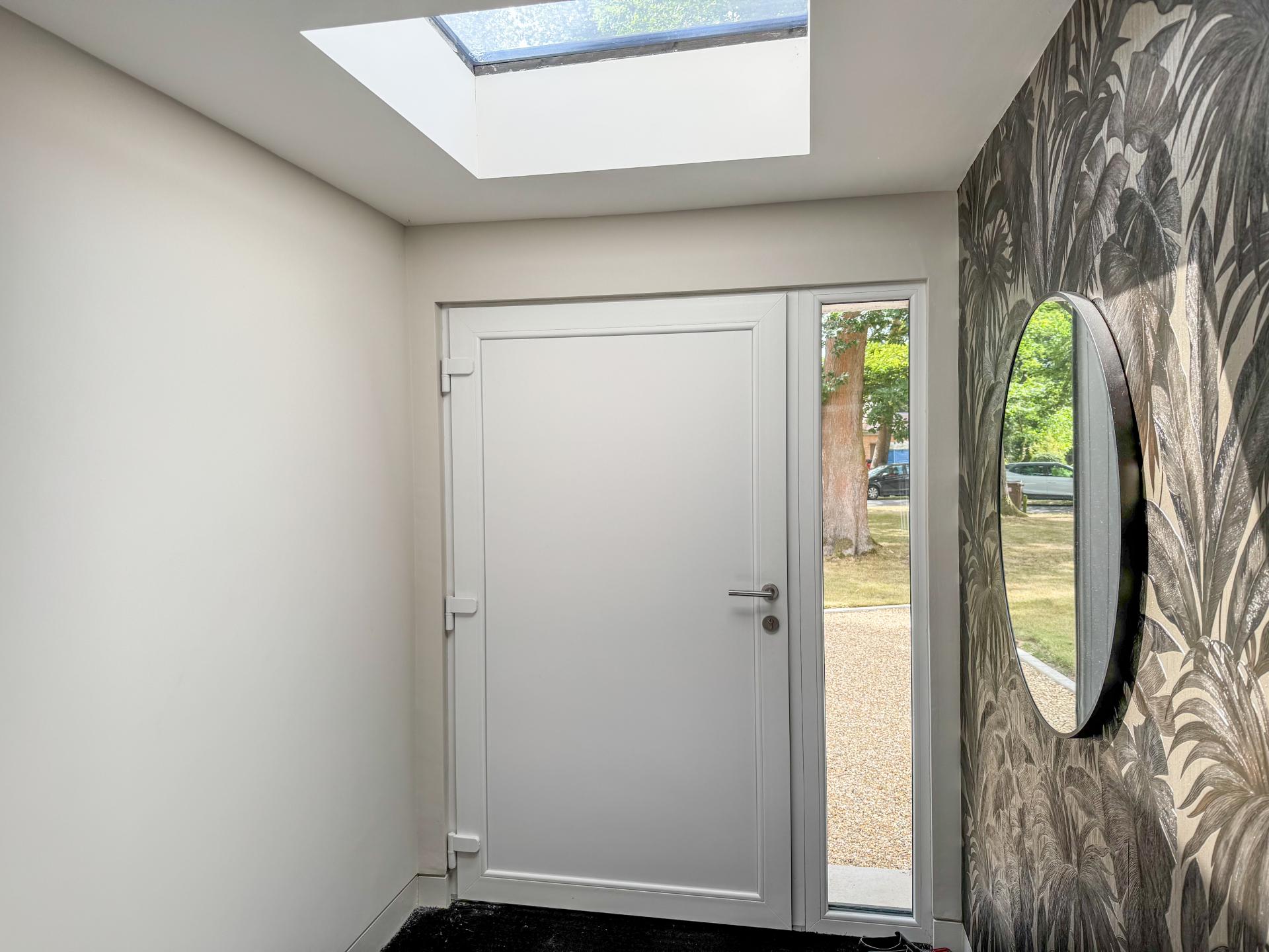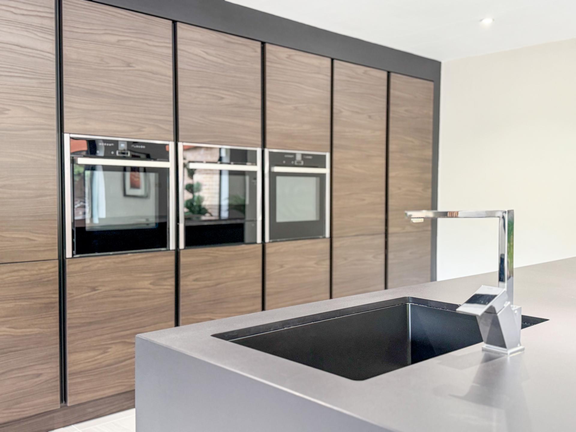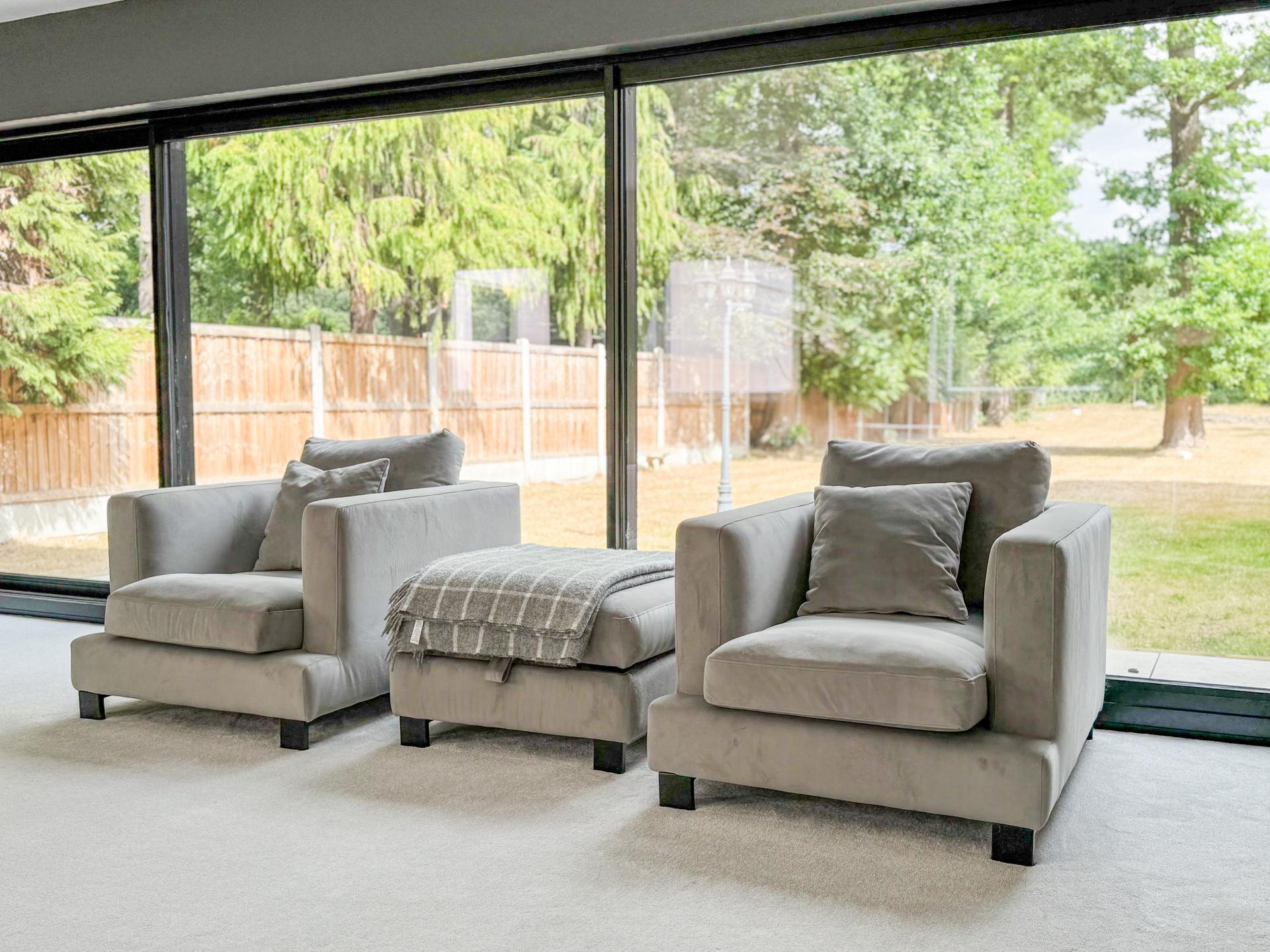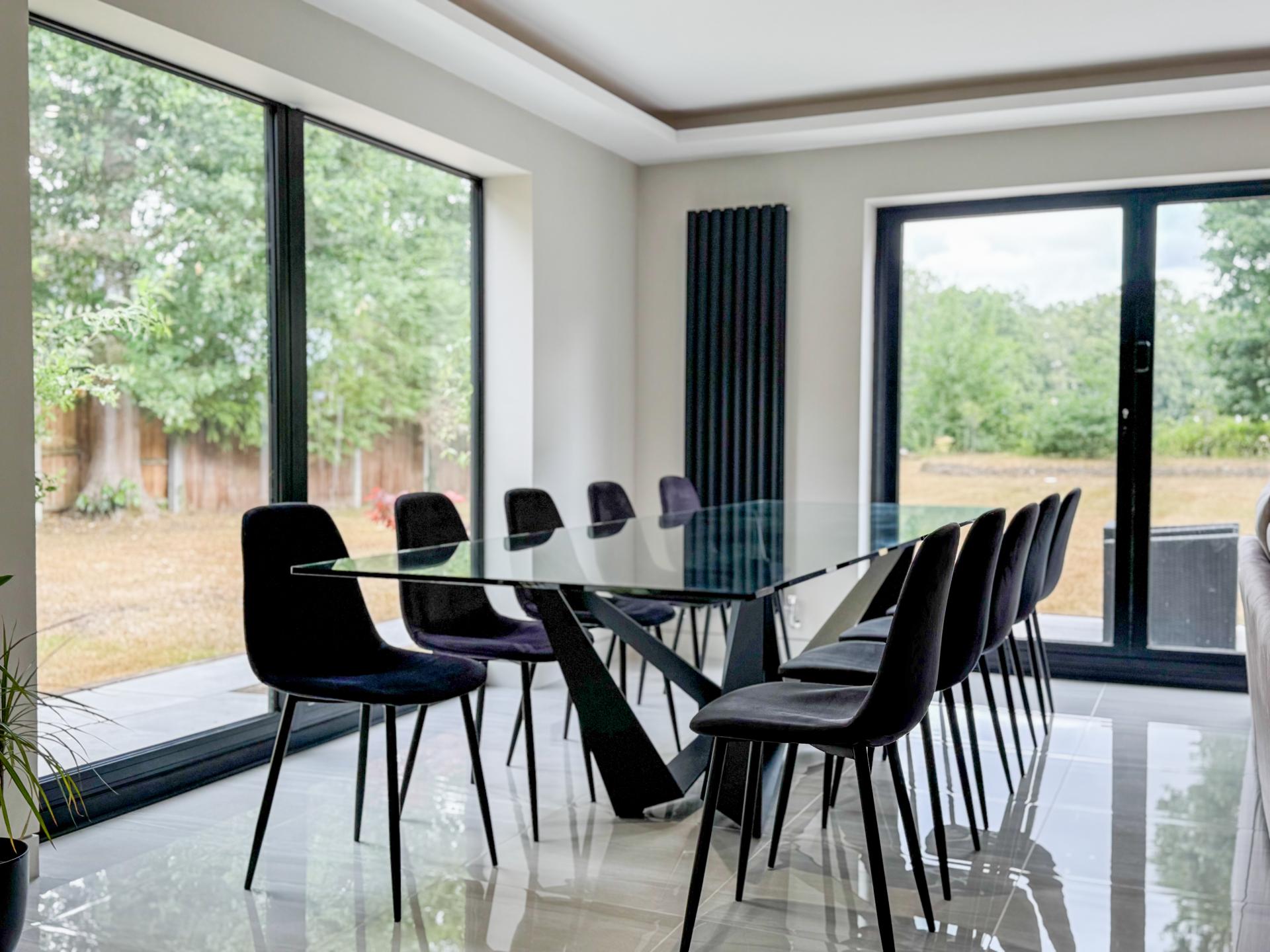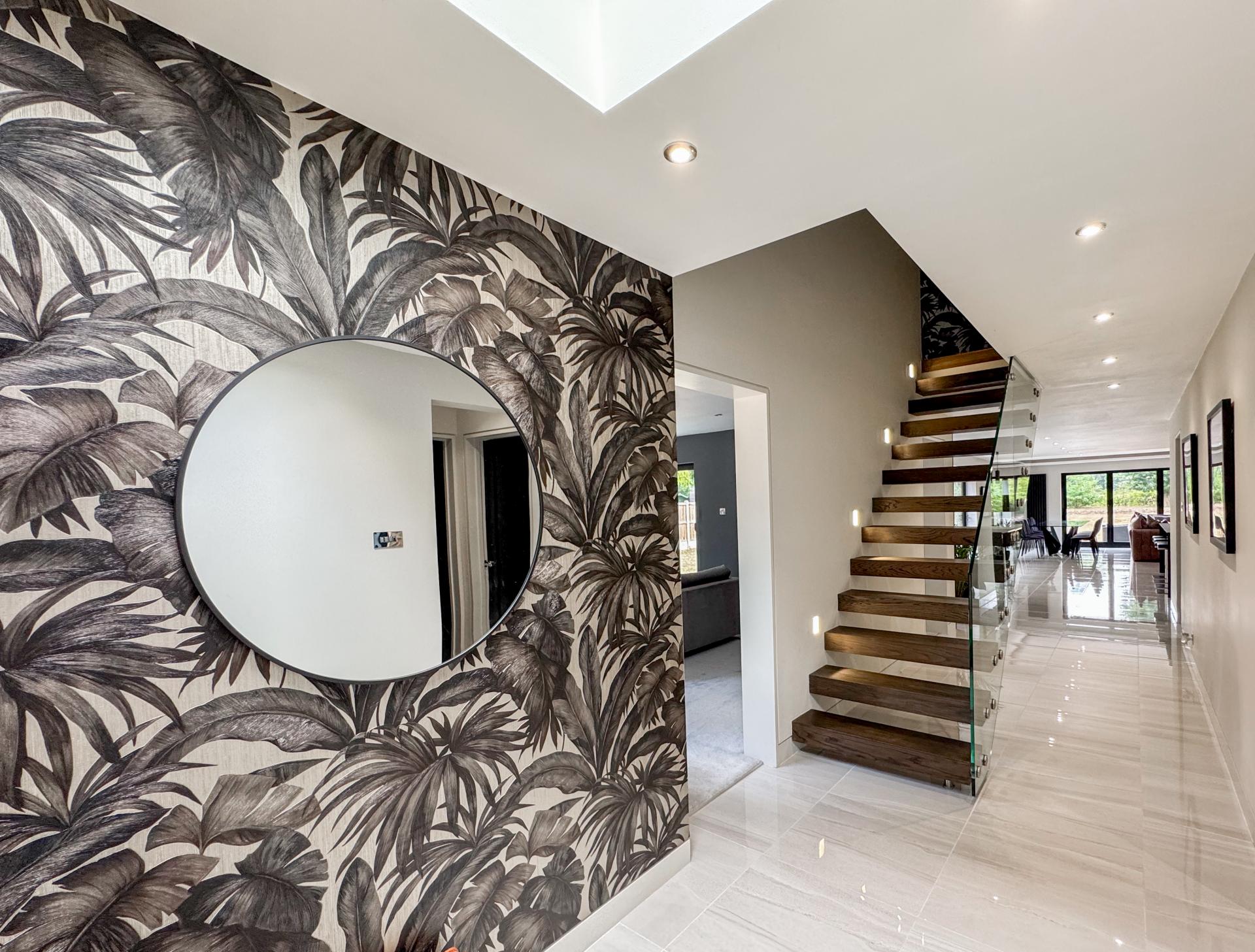 Adjacent is the striking kitchen/dining family room. The high-specification kitchen includes an Elica induction hob and extractor fan, a Neff double hide-and-slide oven, a microwave combi, and a warming drawer, as well as zonal underfloor heating. The open-plan layout encourages fluidity and interaction, with the bifold doors creating the perfect indoor-outdoor environment.