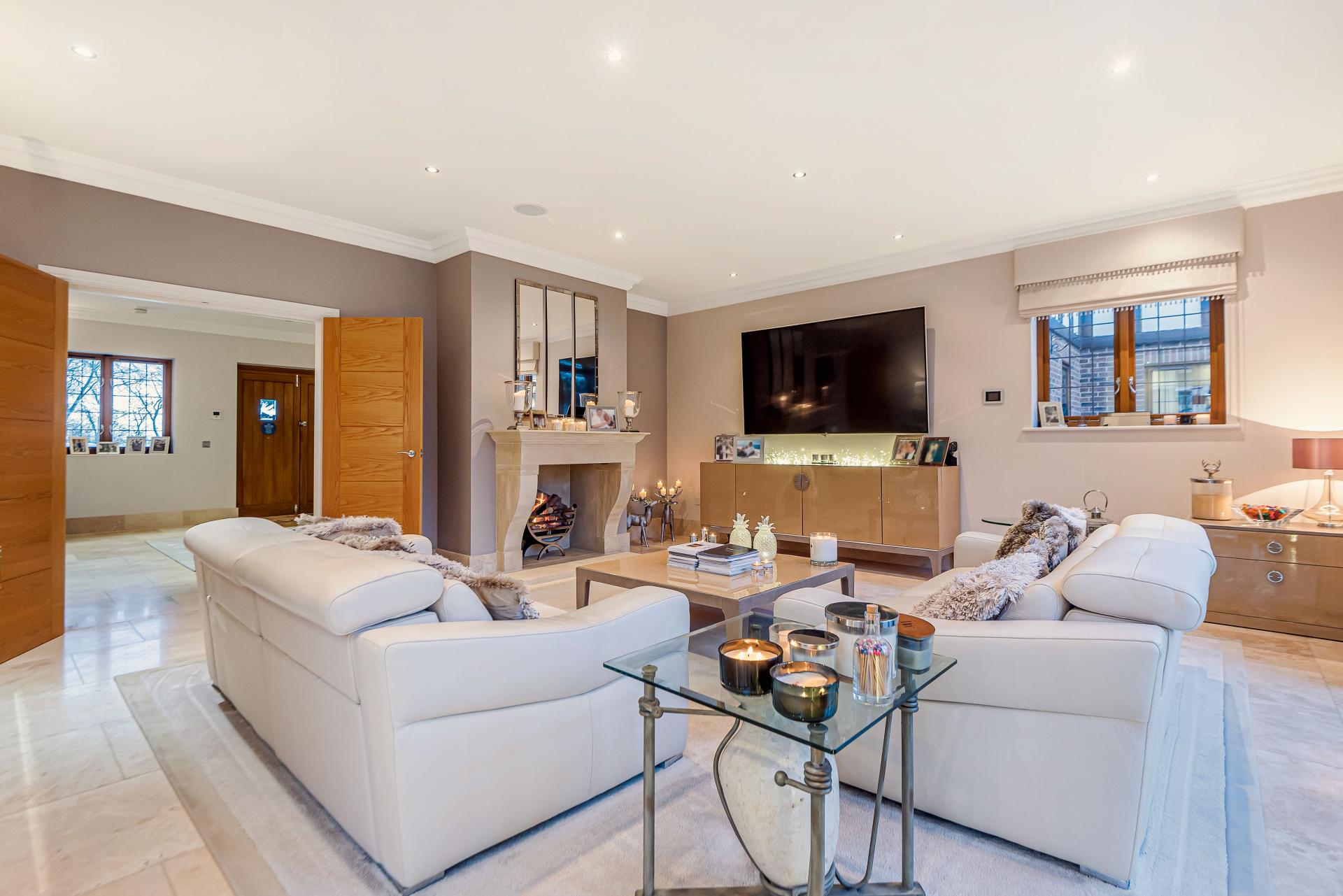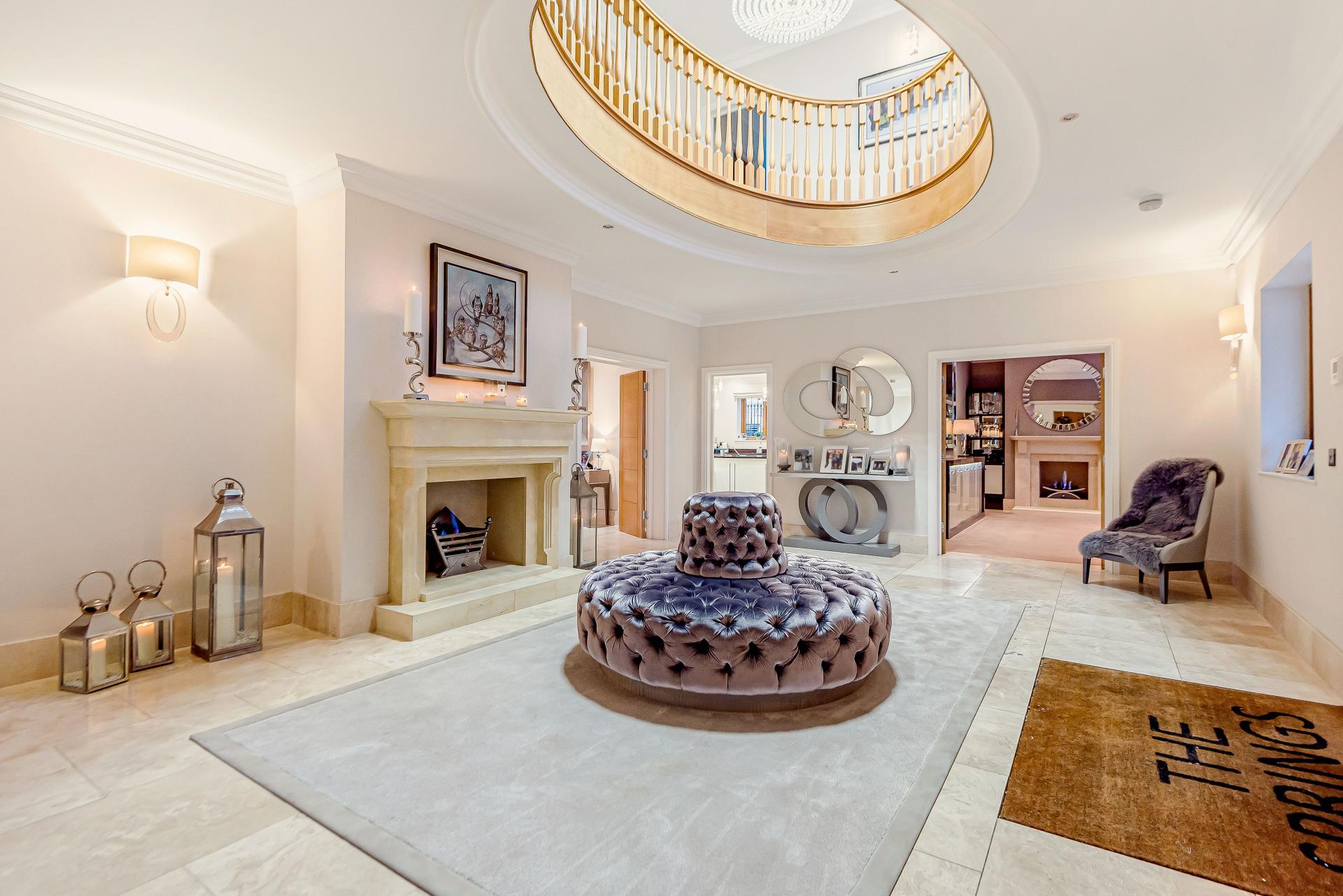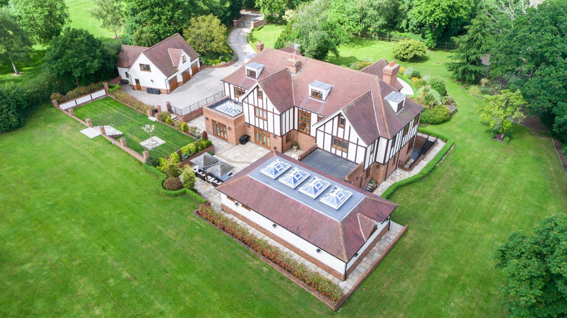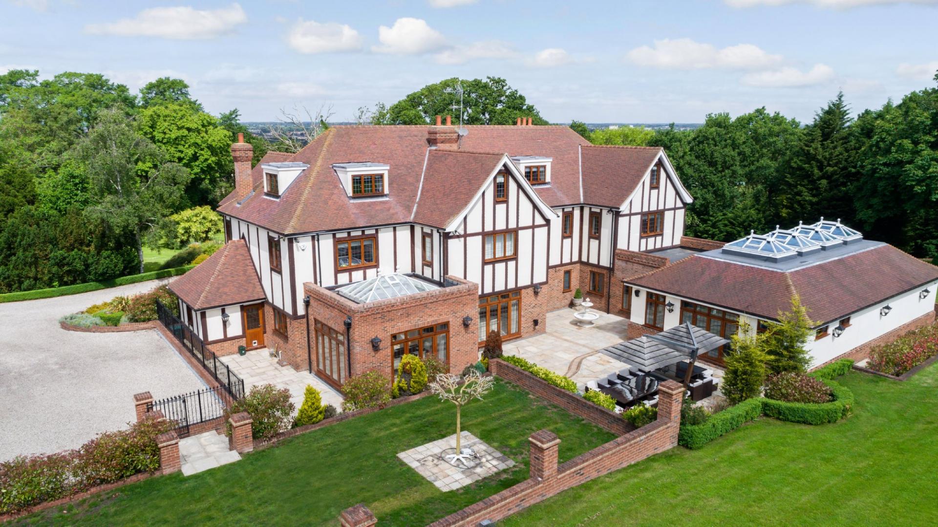THE PROPERTY Bought off plan by the current owners, we are delighted to offer for sale this beautiful house offering space in excess of 11000 square feet. This iconic brick built family home has timber framed rendered panel outer layer which give it a classic Elizabethan look and is ideal for those looking for a little more than your standard home comforts. From the grand entrance, stunning living rooms and seven ensuite bedrooms to your cinema room, snooker room and indoor swimming complex, everything has been designed and finished to an exacting standard including bespoke open plan fitted kitchen with stylish centre island and the ornate carved fireplaces.