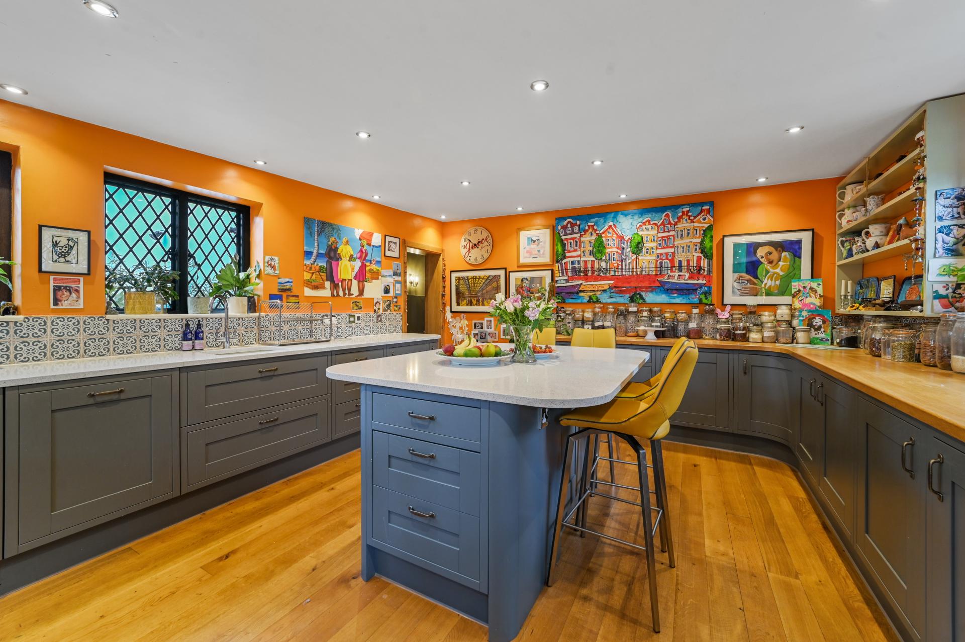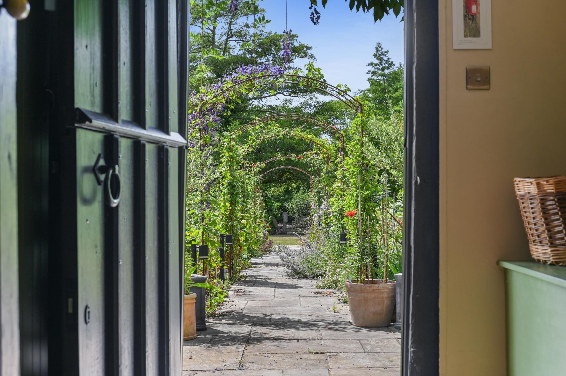 STEP OUTSIDE The expansive landscaped grounds boast an array of features, including inviting patio areas, a charming walled herb garden, a greenhouse, and a versatile workshop. You'll also find an allotment, an orchard, a swimming pool, a play area, and lawn.