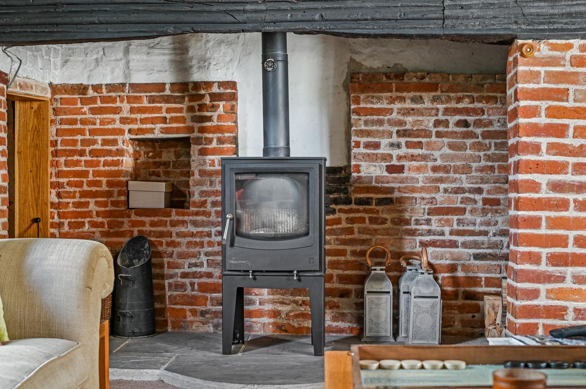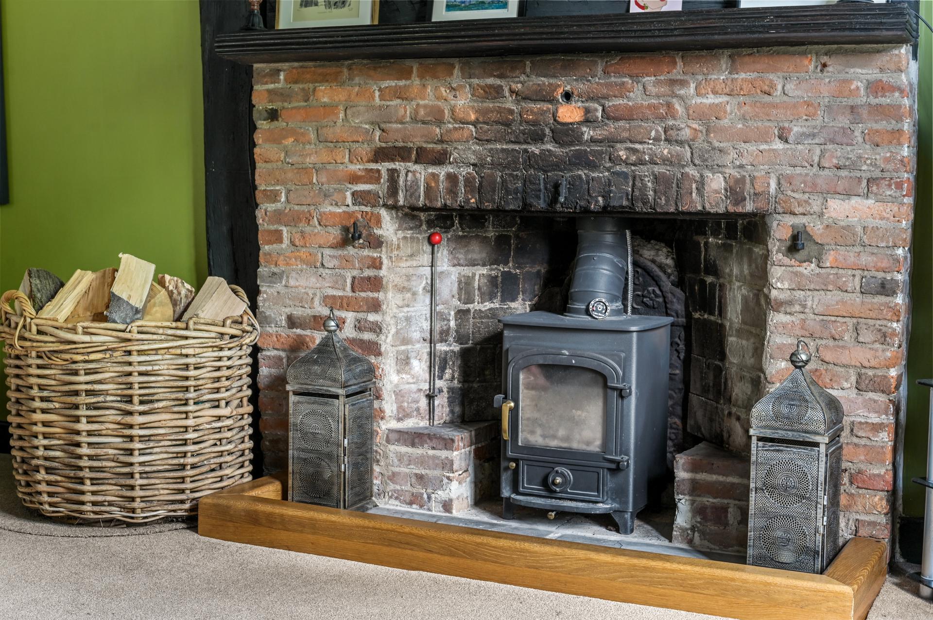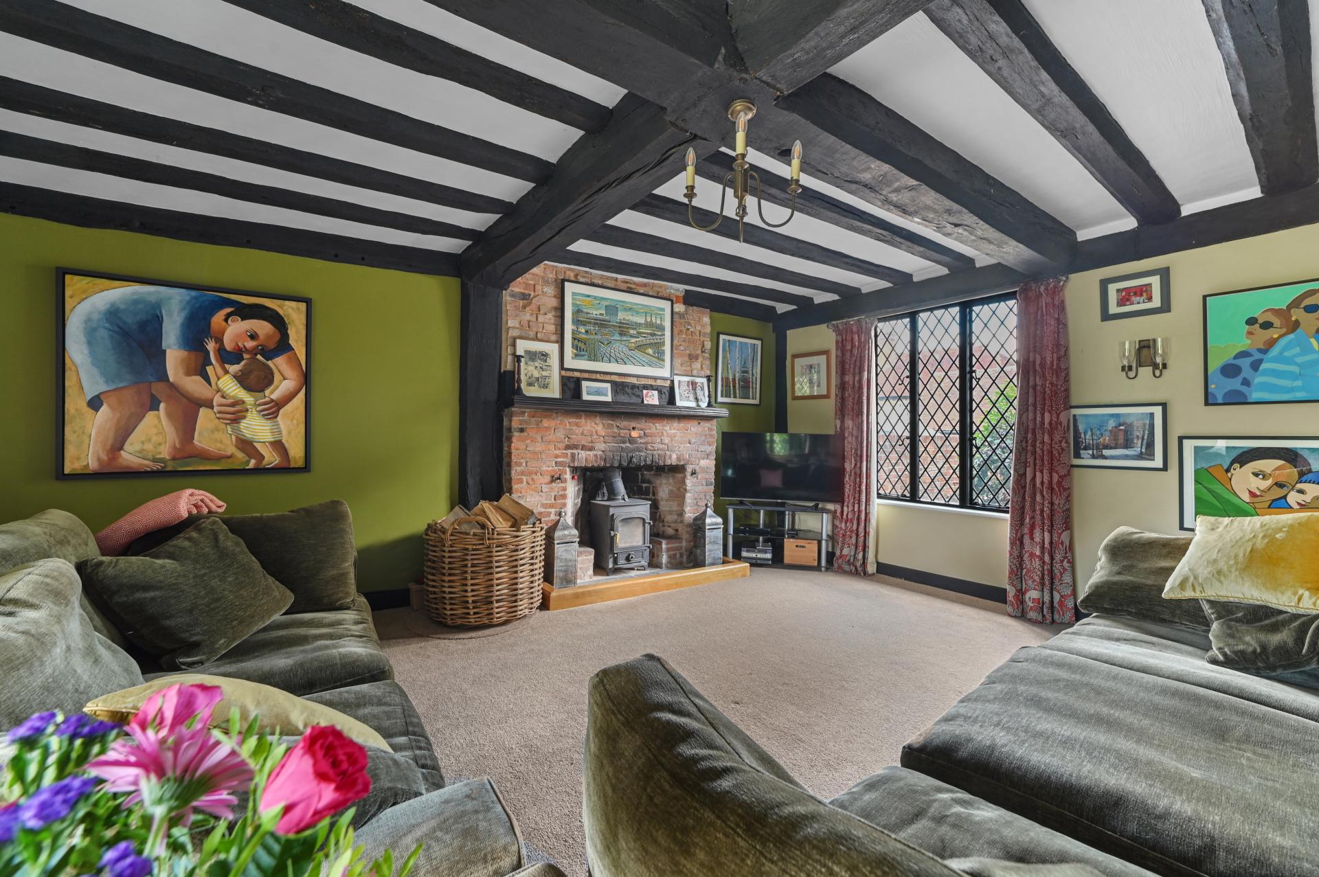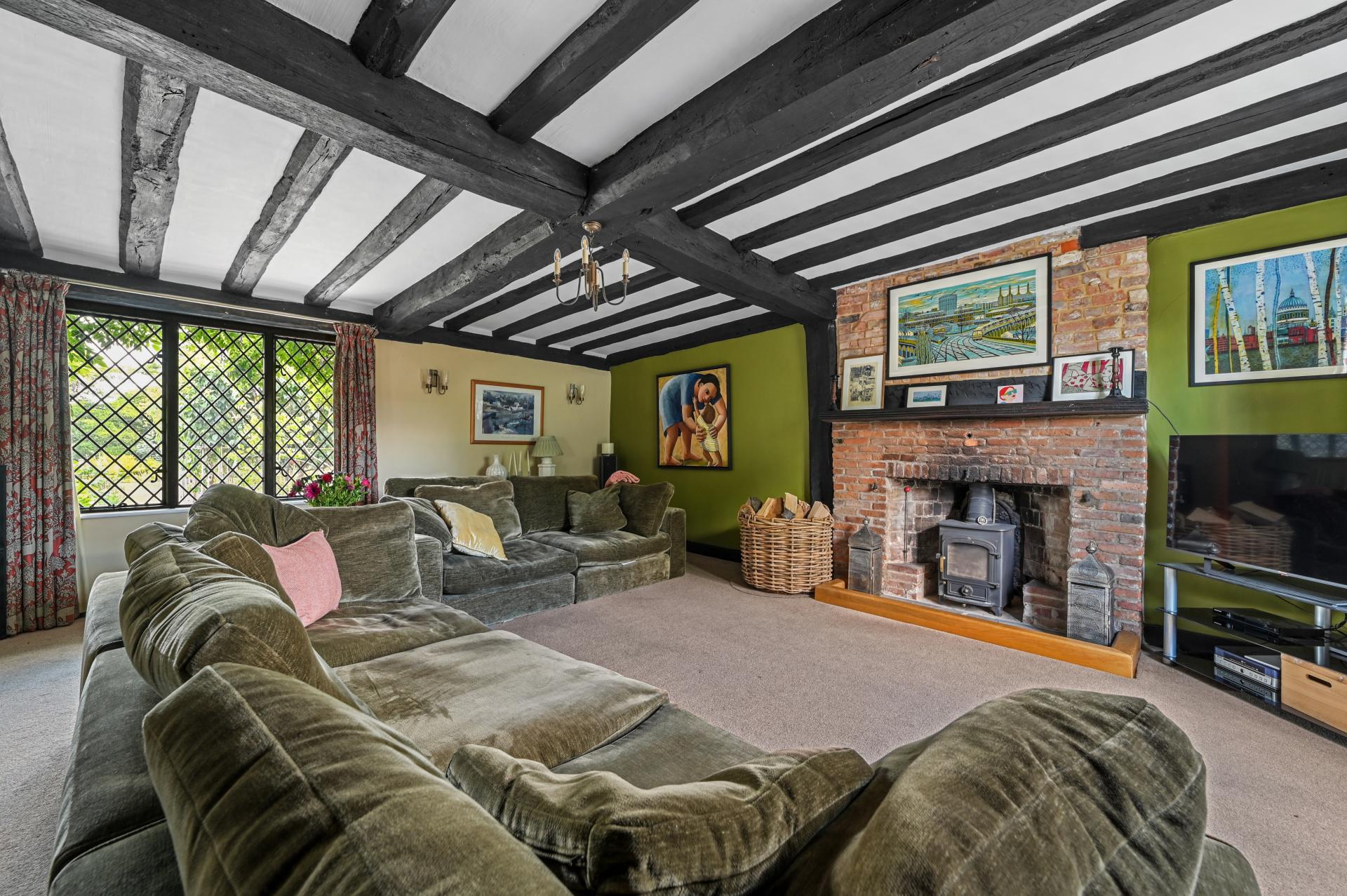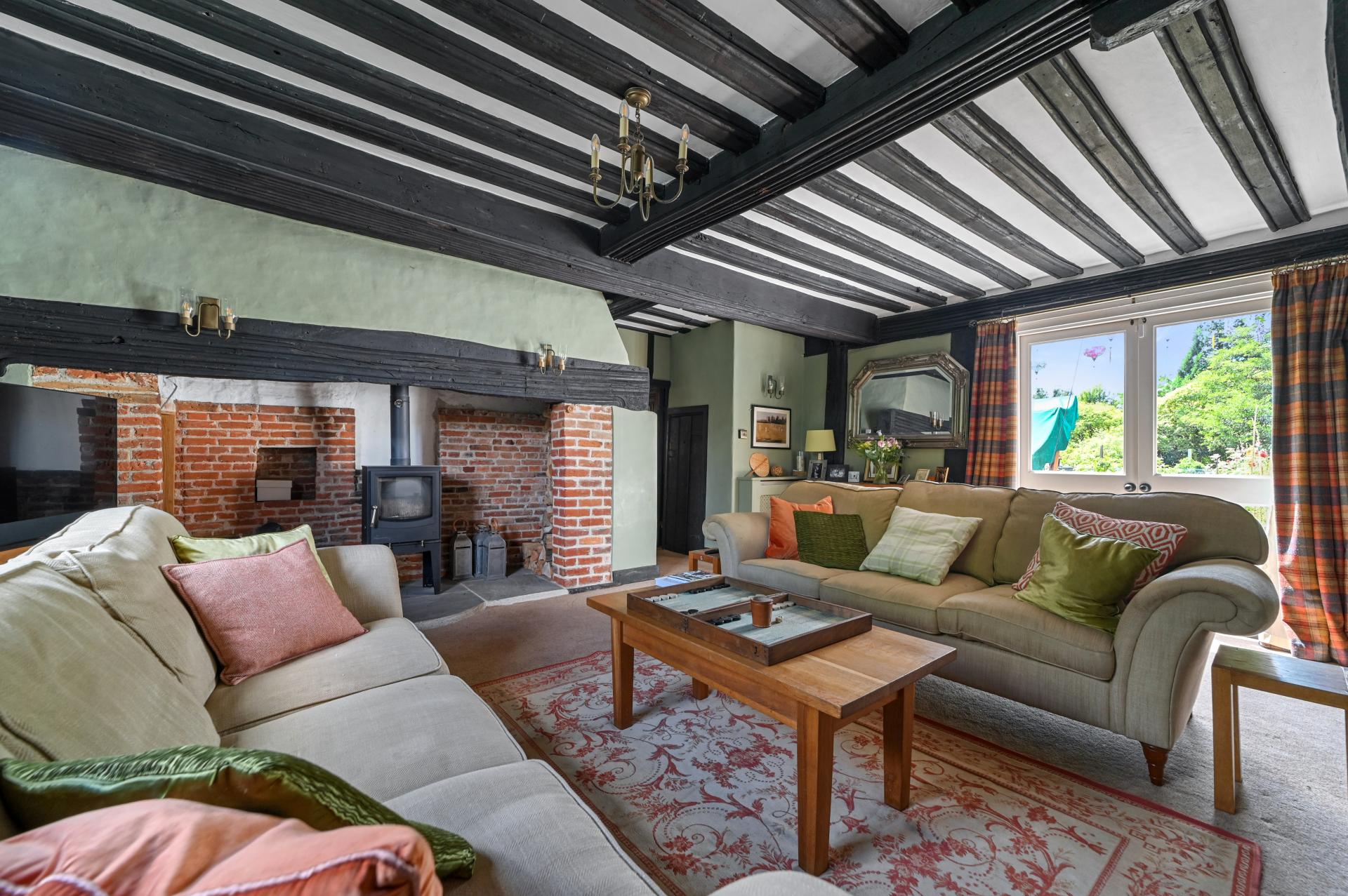 STEP INSIDE Immerse yourself in a realm of sophistication as you enter the original hallway, featuring exposed beams and an entrance to the drawing room with a brick-built inglenook fireplace complete with a log burner. Double doors open into the garden, offering the perfect spot for a summer or winter's evening.