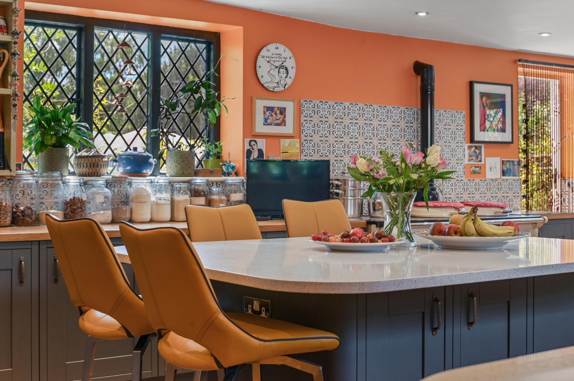 In the gardens the swimming pool has been a terrific addition, and our family often uses it throughout the day. The gardens themselves consist of 1.2 acres – big enough to be spectacular but not so big that they become a burden. We have focused on creating a low maintenance garden with five elements: a woodland with paths winding through the trees which are underplanted with thousands of woodland plants; the pond which is nearly 1,000 square meters, and full of wildlife, from frogs to herons, swans and moorhens with the occasional woodpecker; the formal gardens with lawns, cottage garden borders and a parterre ringed with pleached cherry trees; the growing garden with large greenhouse, vegetable garden, walled kitchen garden and orchard and finally the relaxing garden with sunny patios and shady corners and space for barbecues and dining al fresco.