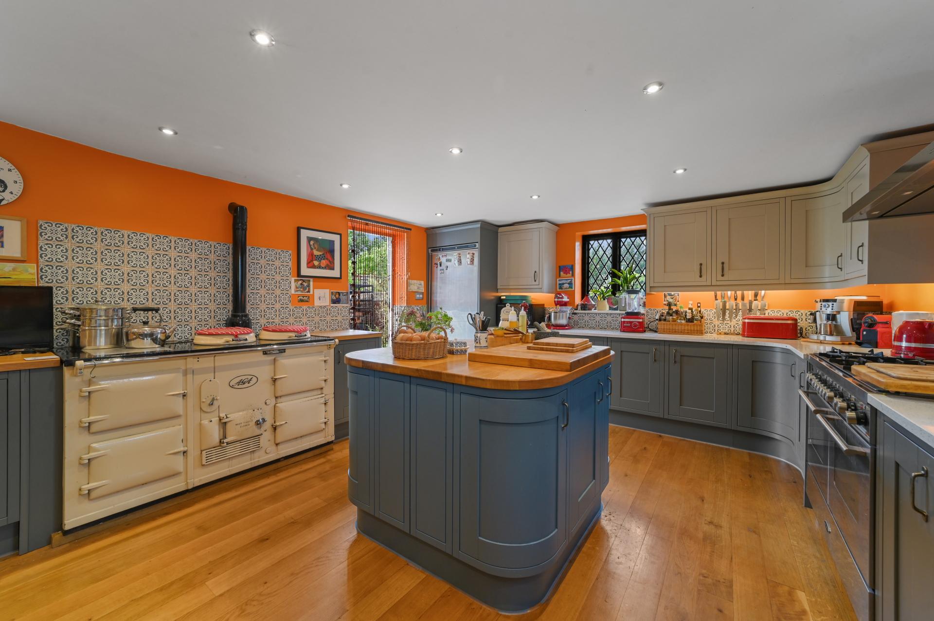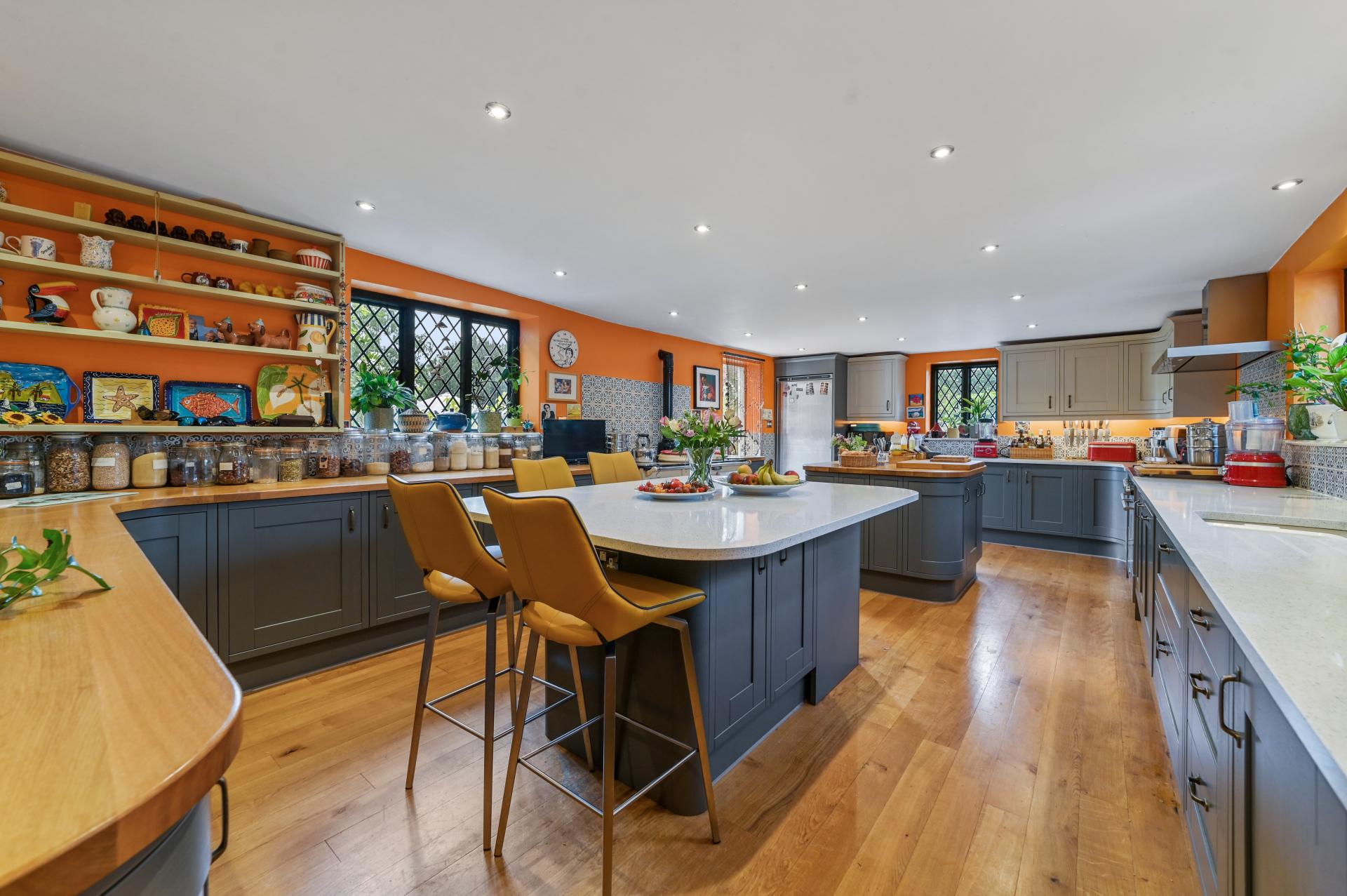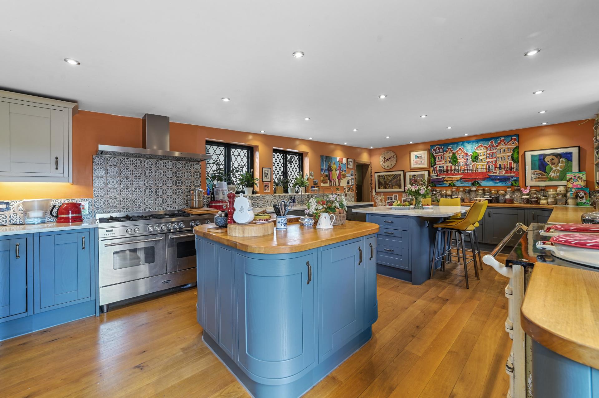 The elegant sitting room is complete with a brick-built fireplace. Delight in culinary creations within the expansive kitchen/breakfast room, boasting both a double oven range and a four oven Aga, alongside a breakfast bar and butcher's block with storage, offering generous space for family life. The study serves as a tranquil retreat, ideal for quiet reflection or work.