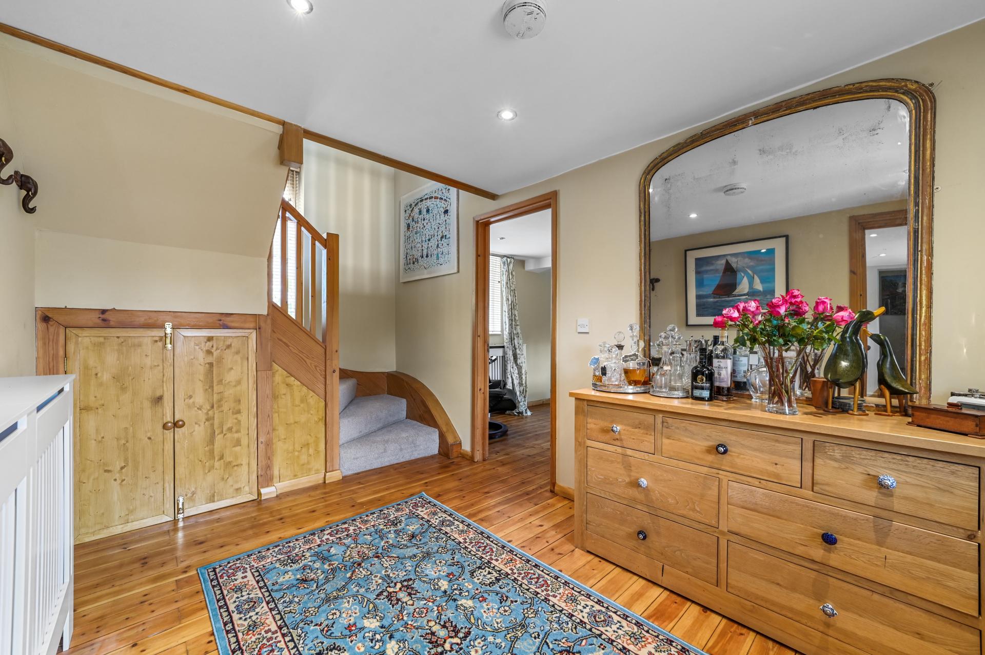 The stable conversion features a well-appointed pantry that leads you into the cosy dining room, which opens into a second hallway leading into a second living room. For added convenience, two cloakrooms are also located on the ground floor.