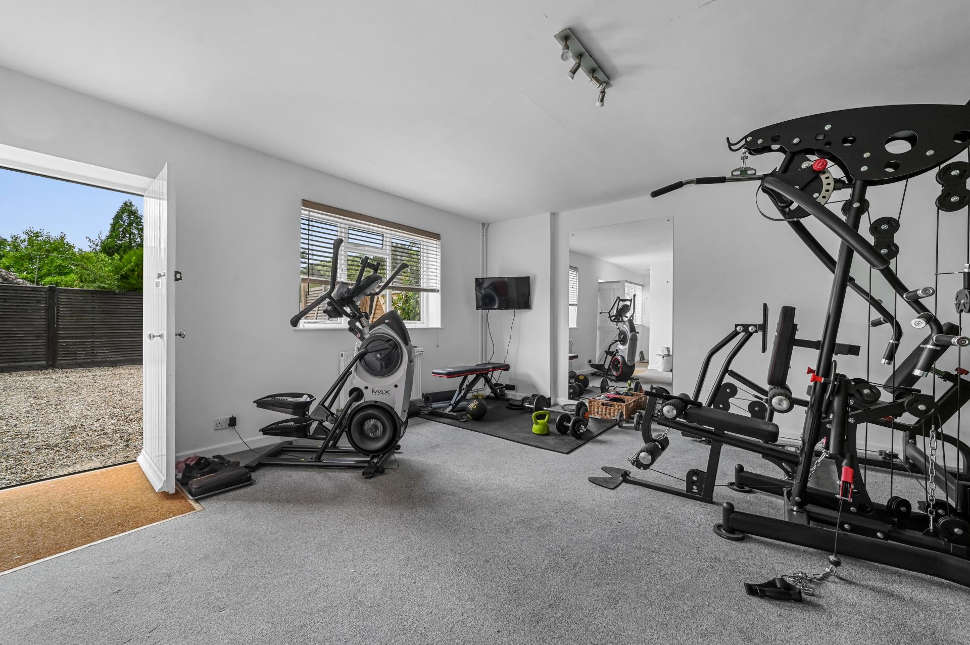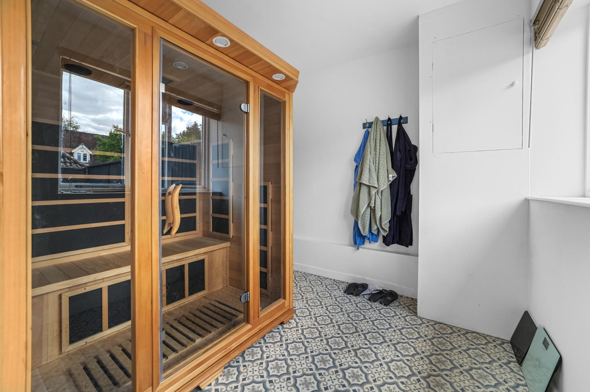 Accessed from an external door, the ground floor includes a gym complex including a shower and sauna room with a large gym. This area could easily be used as a studio apartment.