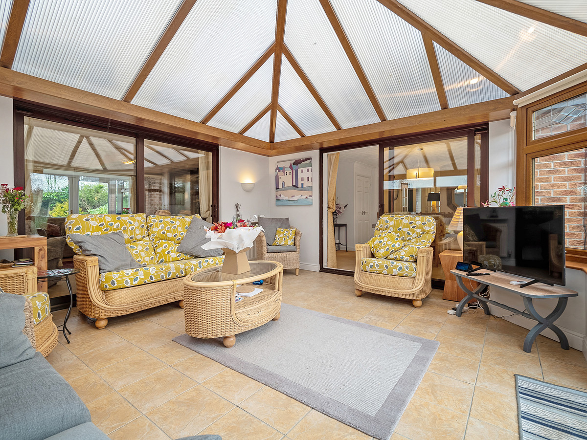 - Inviting lounge overlooking the garden, featuring a cozy wood burner for ambiance, and seamlessly connected to a tranquil conservatory with garden vistas.