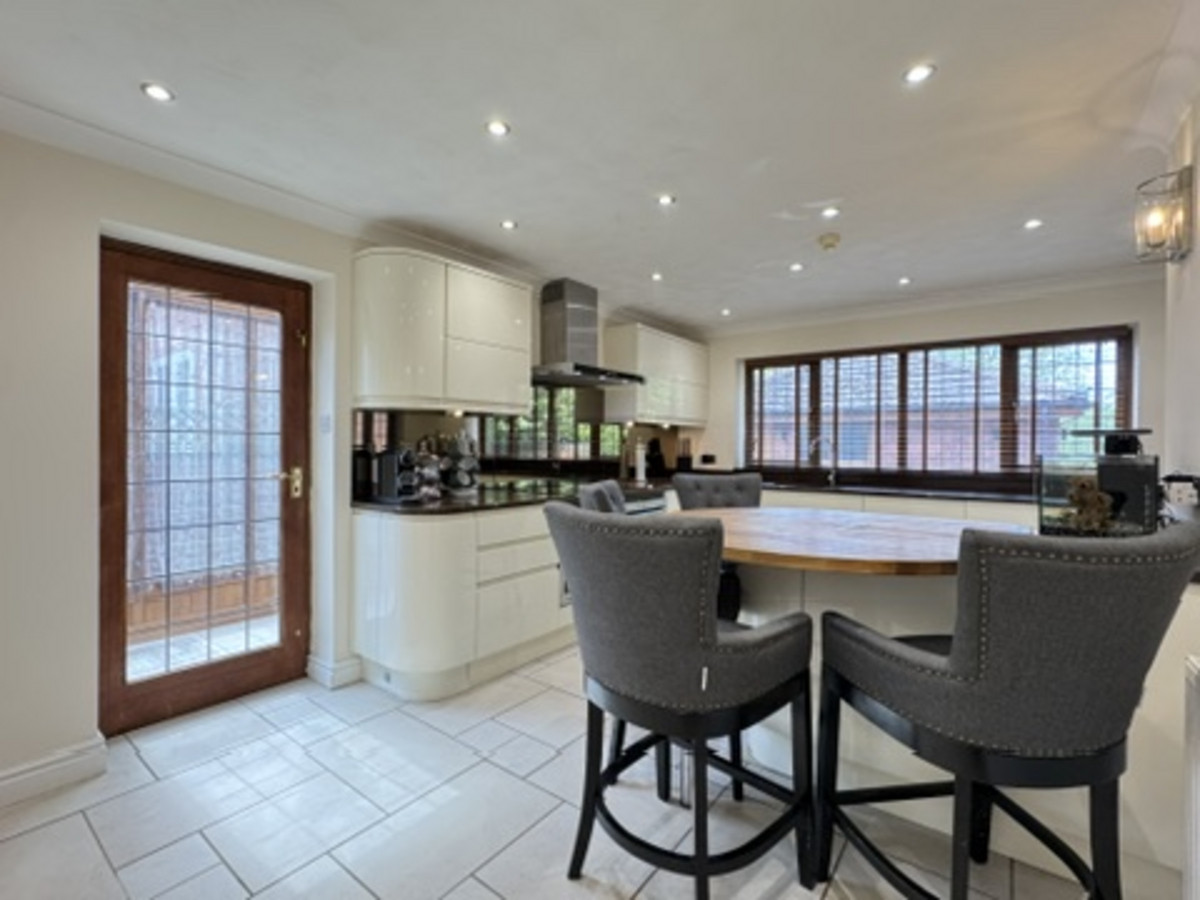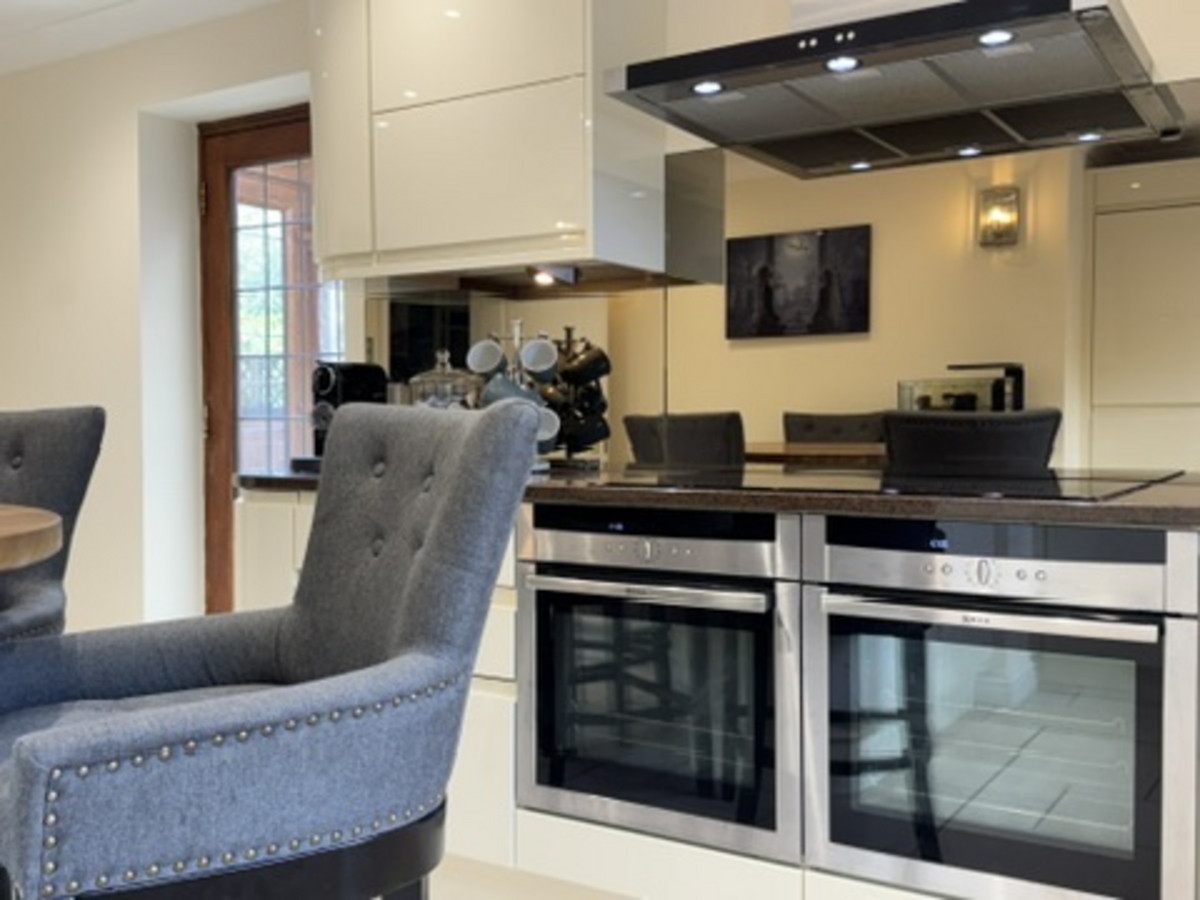 - Granite kitchen with integrated appliances and a breakfast bar for four.