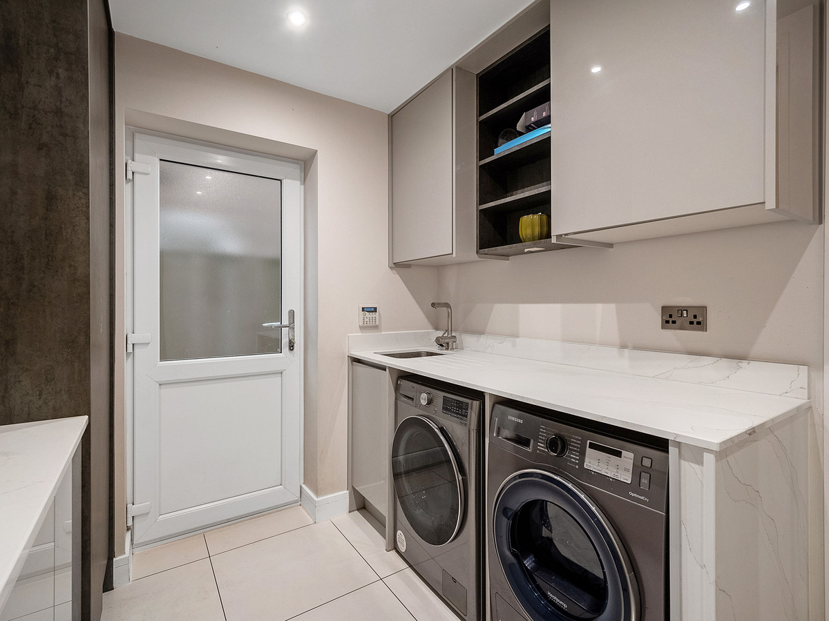 The heart of the home is the impressive kitchen, boasting sleek granite worktops and top-of-the-line integrated appliances, making it a culinary dream come true. Adjoining the kitchen, the versatile dining room features double French doors that open to a beautifully landscaped garden, perfect for entertaining or relaxing with loved ones.