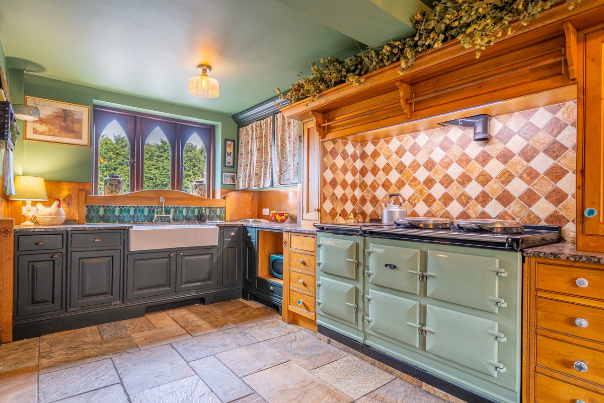 - Stunning kitchen/family room with AGA, granite worktops, copper accents, and French doors to the garden