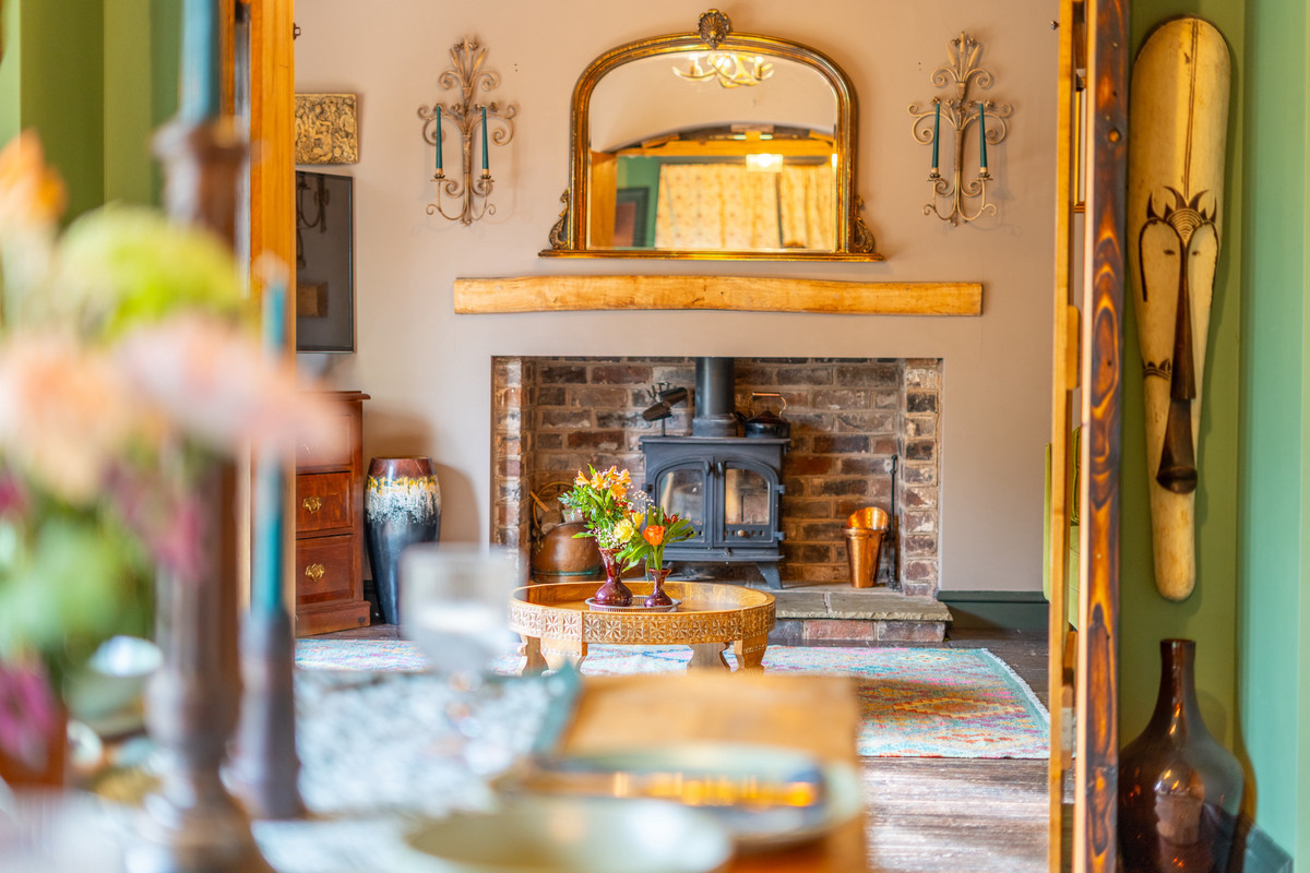 Just beyond the kitchen, the snug offers a warm and inviting retreat, complete with a wood-burning stove, exposed brickwork, and rustic timber flooring—perfect for cosy winter evenings. The generous main lounge features parquet flooring, high ceilings with decorative coving, and a bay window overlooking the gardens, all centred around a handsome fireplace.