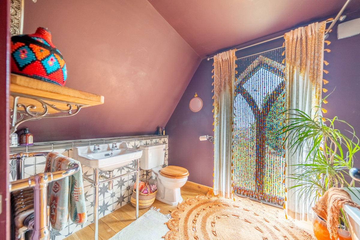 Below, a cellar provides practical utility space or the ideal environment for wine storage. Upstairs, the galleried landing leads to four generous double bedrooms, each rich in original character, with fireplaces and views across the grounds. The family bathroom is traditional yet indulgent, featuring flagstone floors, a high-level flush WC, walk-in shower, and a freestanding roll-top bath that completes this timeless scene.