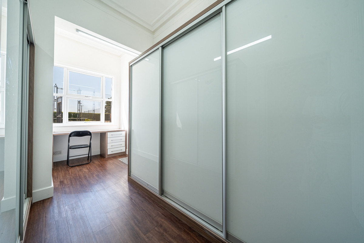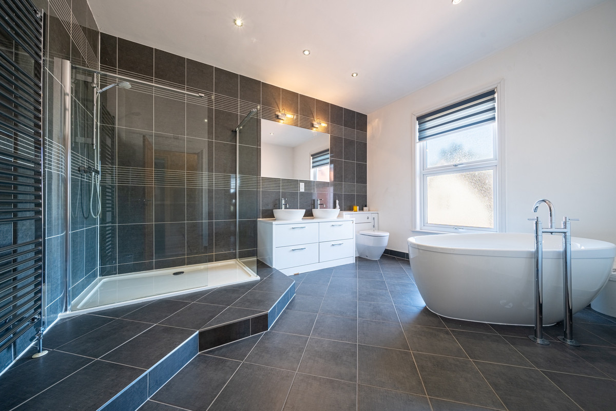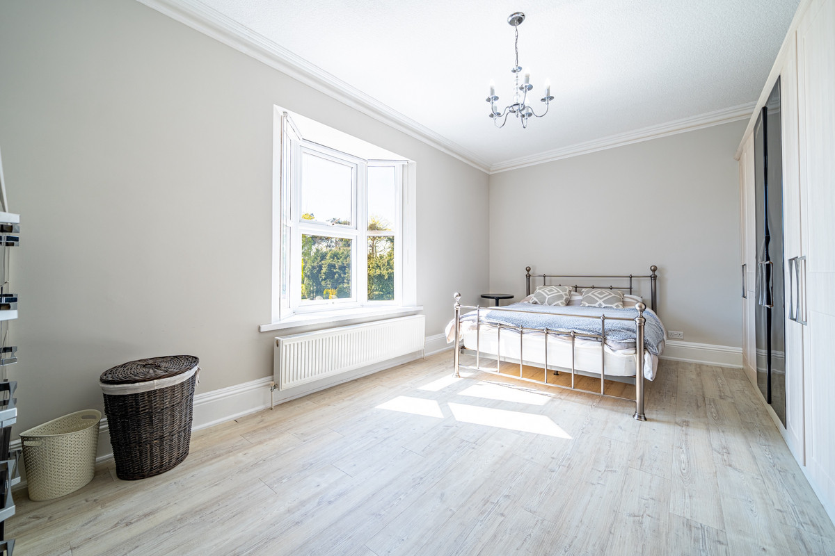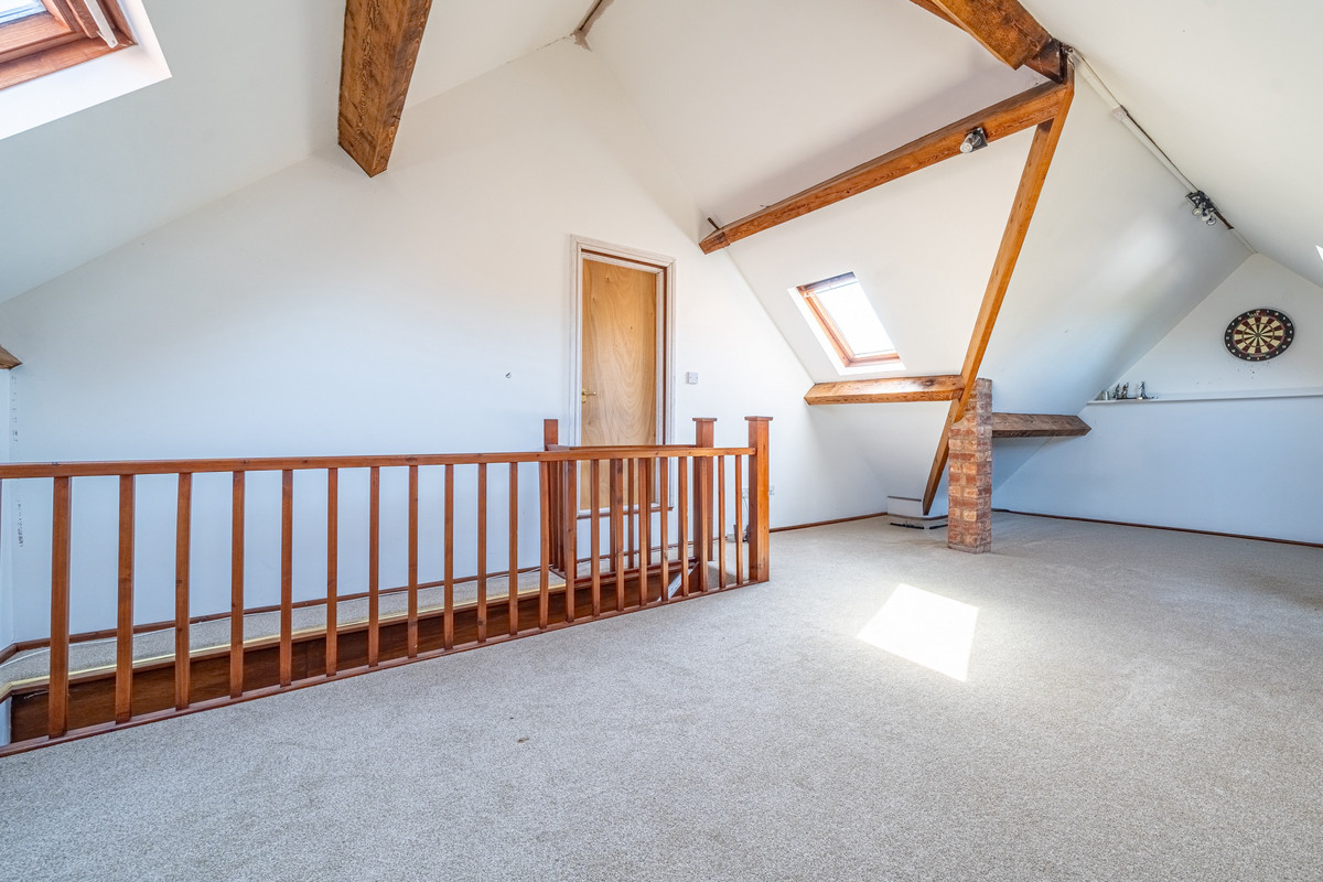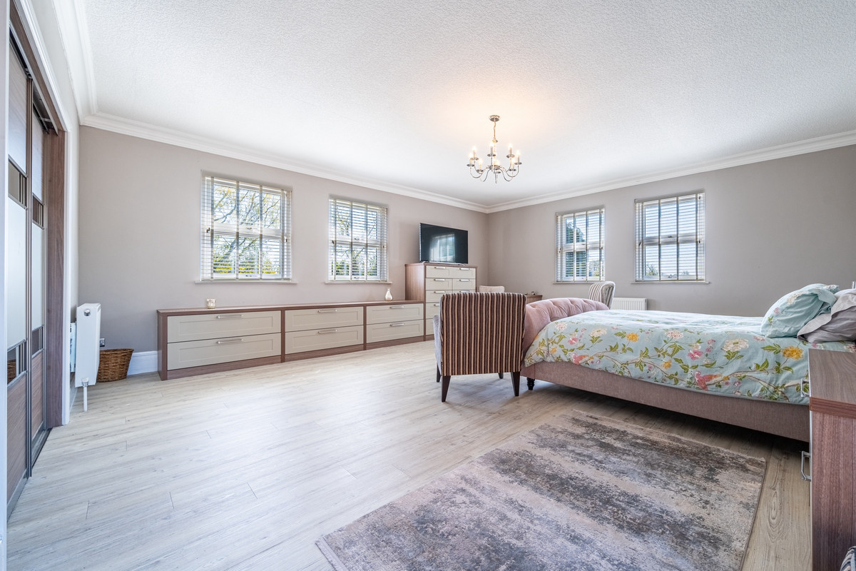 Upstairs, the principal suite is a private sanctuary. With its own hallway, dressing room, high ceilings, and a luxurious en suite with twin sinks and a freestanding bath, it also opens onto a private balcony overlooking the gardens and tennis court — a view to wake up for. Four further double bedrooms (two with en suites) and a large, beautifully fitted family bathroom ensure space and comfort for every member of the family. A top-floor playroom with skylights offers the perfect teen hangout or creative retreat.