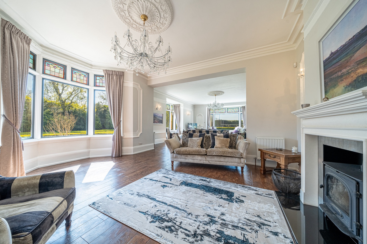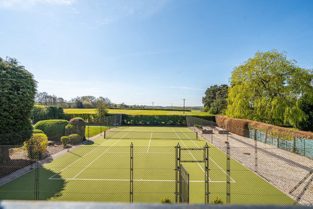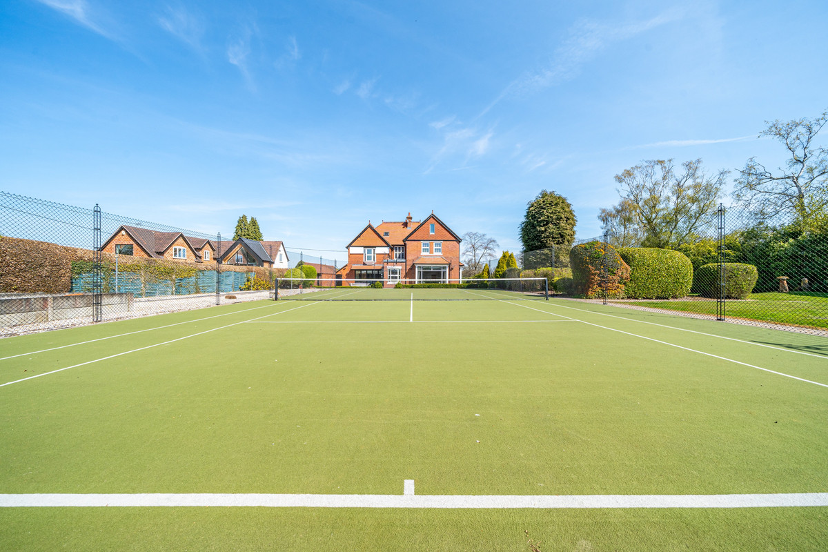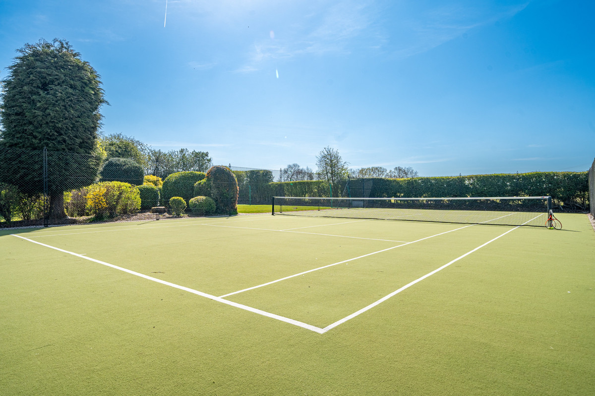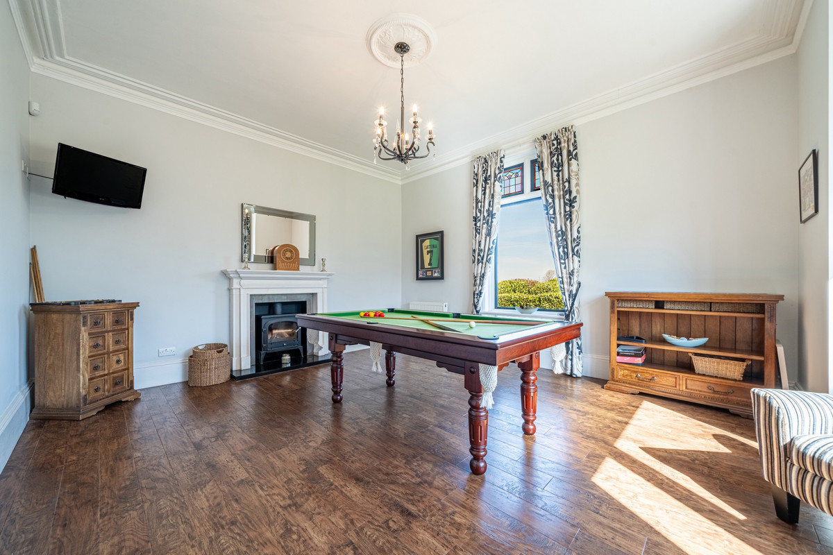 The reception rooms are generous and character-filled. A formal lounge, complete with stained-glass bay windows and glorious views over your very own private, Wimbledon-worthy tennis court, offers a magnificent space to unwind or entertain. A second reception — with a log burner and billiard table — creates a more relaxed, yet equally grand, atmosphere. There’s also a dedicated office with views across the grounds, making work-from-home days something to savour.