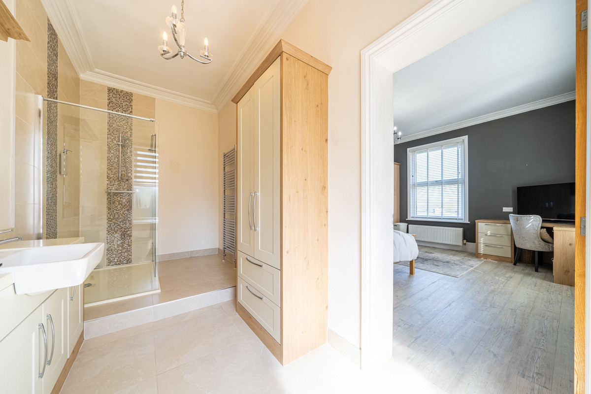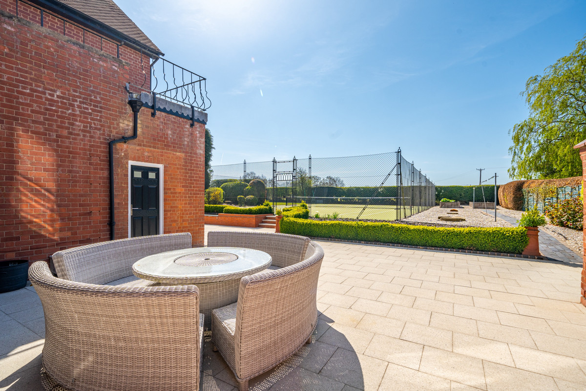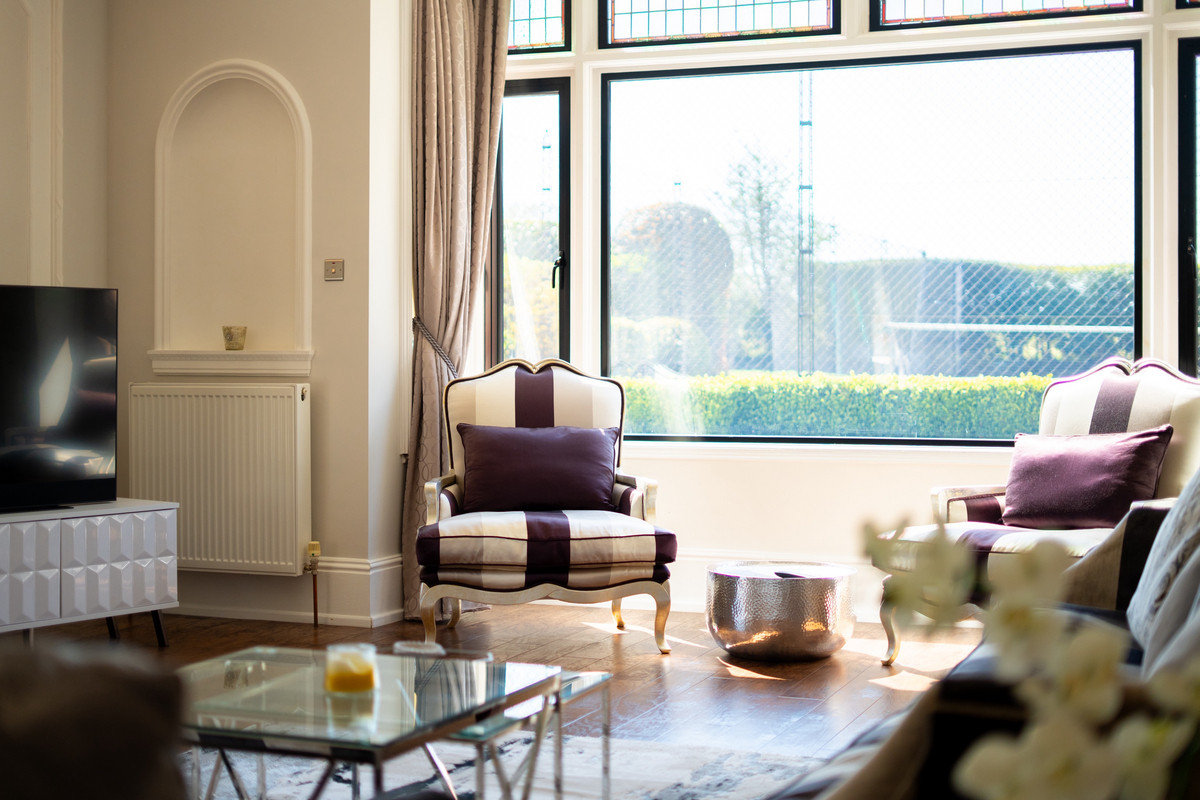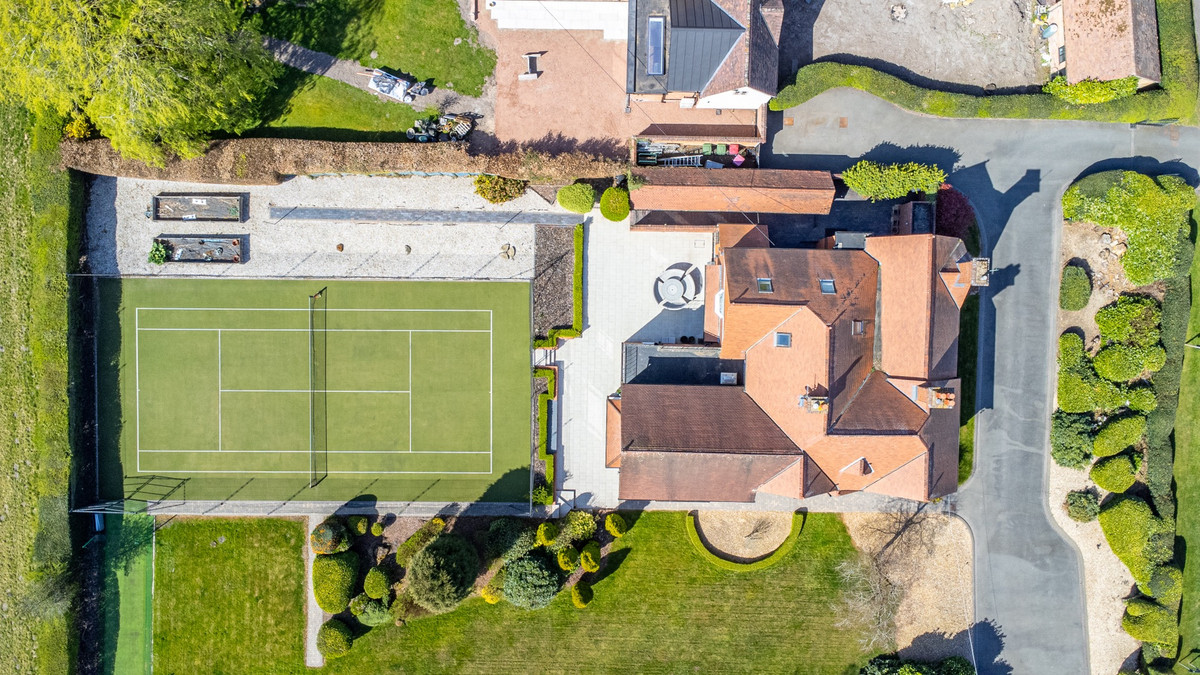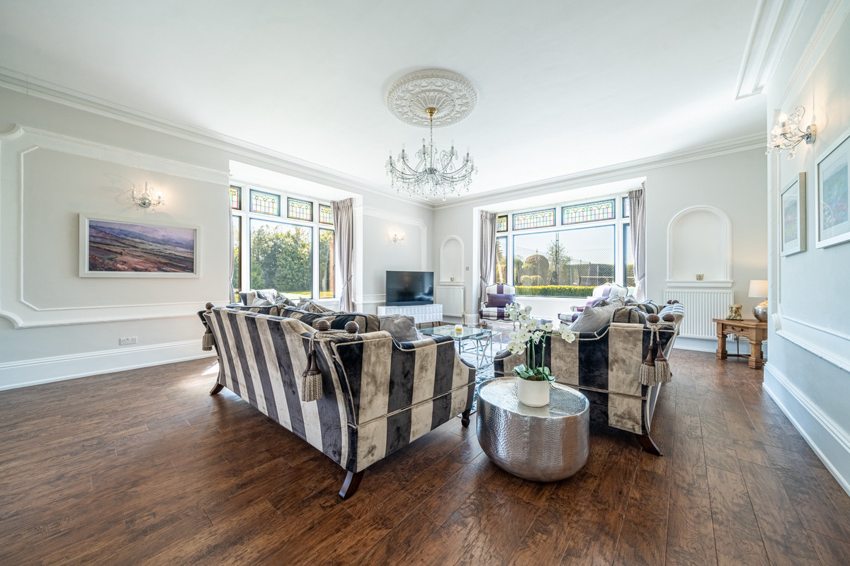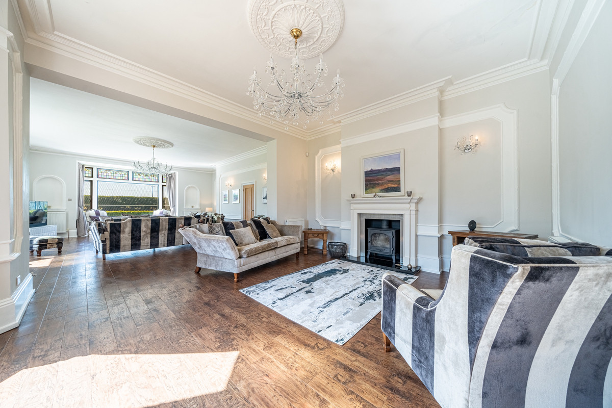 The reception rooms are generous and character-filled. A formal lounge, complete with stained-glass bay windows and glorious views over your very own private, Wimbledon-worthy tennis court, offers a magnificent space to unwind or entertain. A second reception — with a log burner and billiard table — creates a more relaxed, yet equally grand, atmosphere. There’s also a dedicated office with views across the grounds, making work-from-home days something to savour.