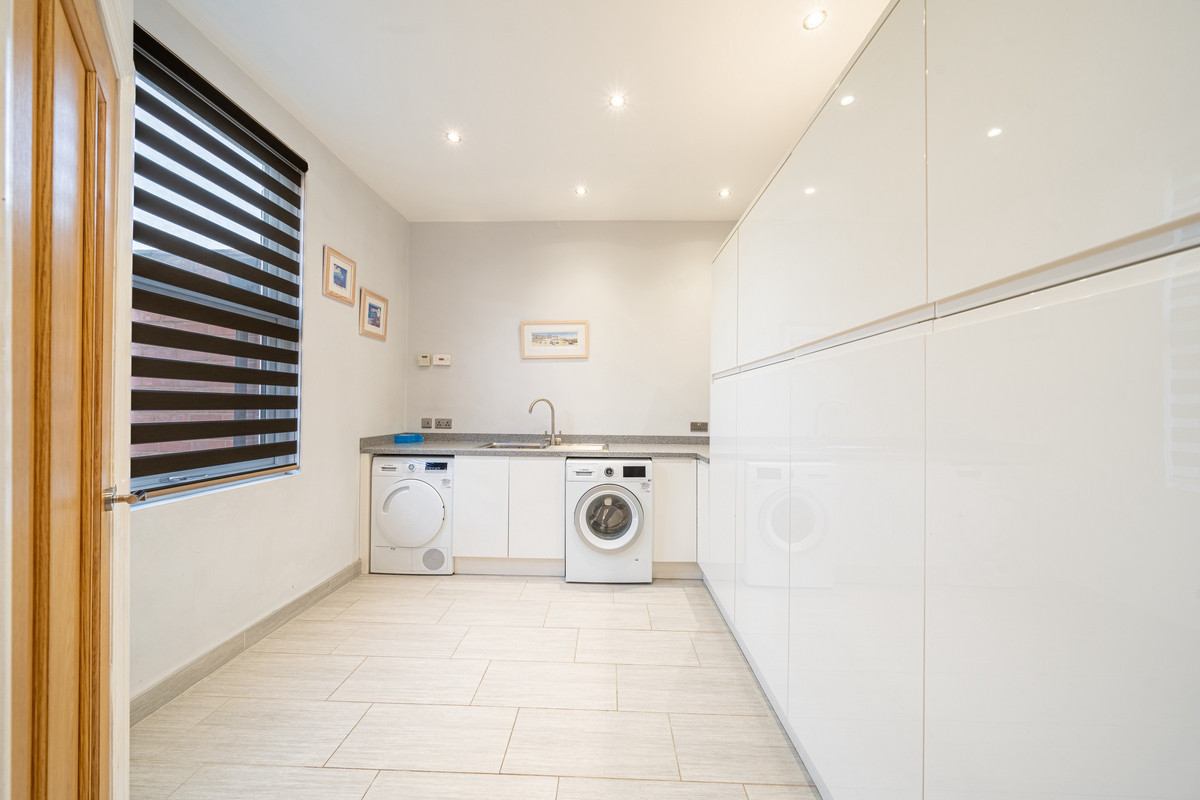 At its heart is the spectacular open-plan kitchen, breakfast, and family room — beautifully appointed with granite worktops, twin ovens, gas and induction hobs, integrated appliances including a coffee machine, and a central island for casual dining. Bi-fold doors open out to the terrace, making al fresco entertaining effortless. A separate utility and laundry area keeps the day-to-day running smooth and organised.