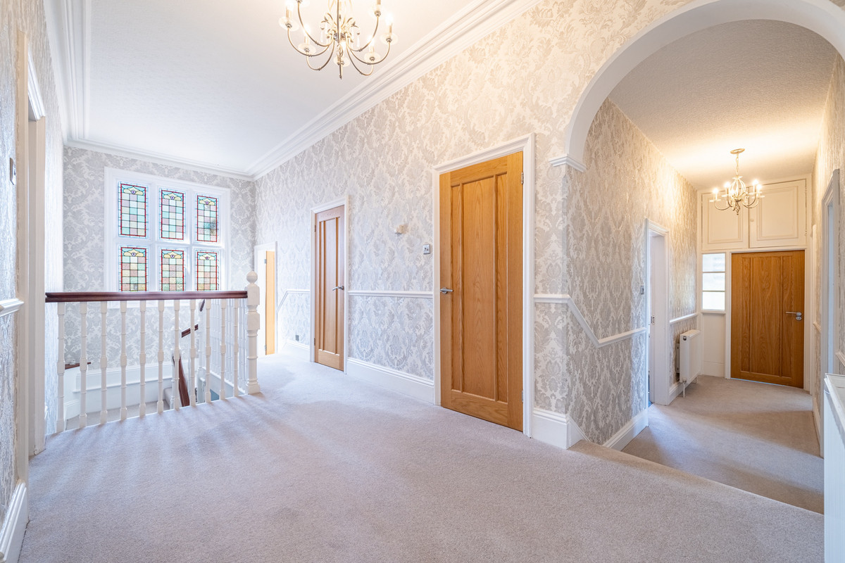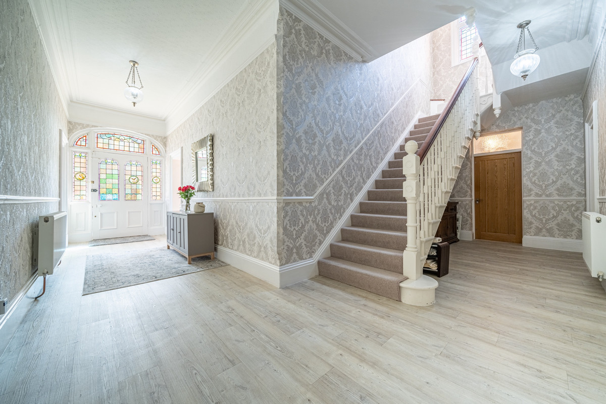 From the moment you step onto the stone porch — framed by stained-glass windows, high arched doors, and original brickwork — the home reveals its timeless charm. Inside, the entrance hall makes a striking first impression, with soaring ceilings, picture and dado rails, rich wood flooring, and a sense of space and light that flows throughout.