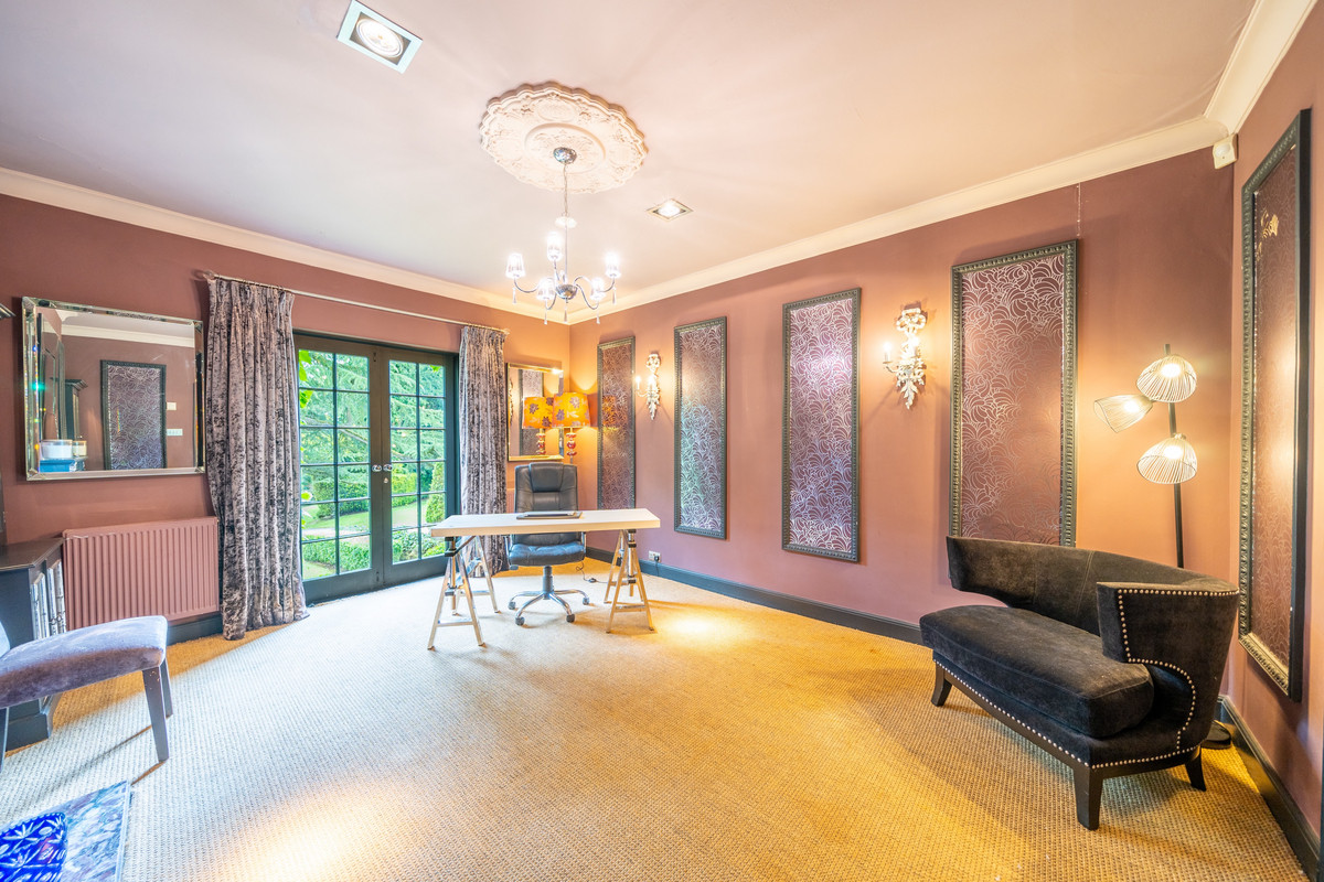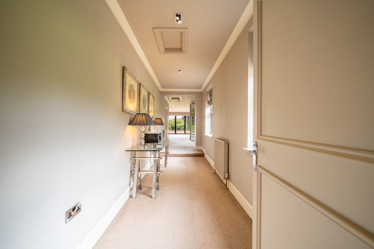 Adjacent to the hallway, an inner corridor leads to a downstairs cloakroom fitted with an English Heritage suite and a cloakroom wardrobe. This corridor also provides access to a practical storage room and a spacious study.