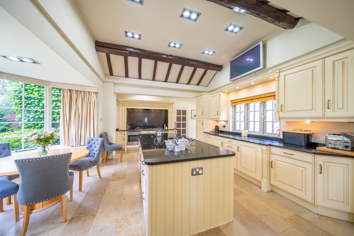 The breakfast kitchen boasts high-specification finishes, including limestone flooring and a range of hand-painted cream cabinetry topped with polished granite worktops. At its heart is a central island featuring NEFF integrated appliances. A charming bay window area offers the perfect spot for a dining table with lovely garden views. Steps lead down to a larder and through to a separate utility room.