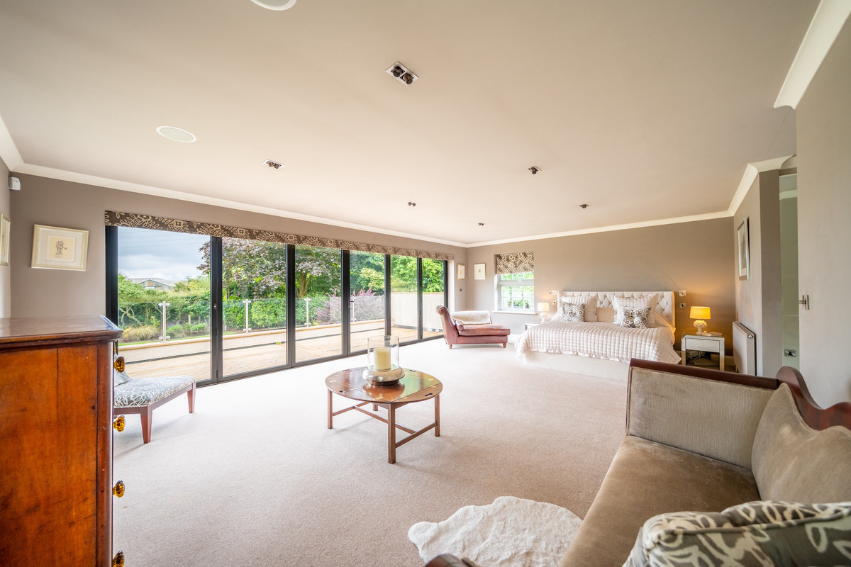 On the first floor, an expansive landing leads to five bedrooms. The master suite is designed as a tranquil retreat, offering sweeping countryside views through full-width bi-folding doors that open onto a spacious balcony. Adjacent to the landing, a fully equipped dressing area with ample wardrobes connects to a luxurious en suite, which includes a walk-in double-width shower, dual vanity units, a Villeroy & Boch freestanding bath, and elegant marble tiling with underfloor heating.