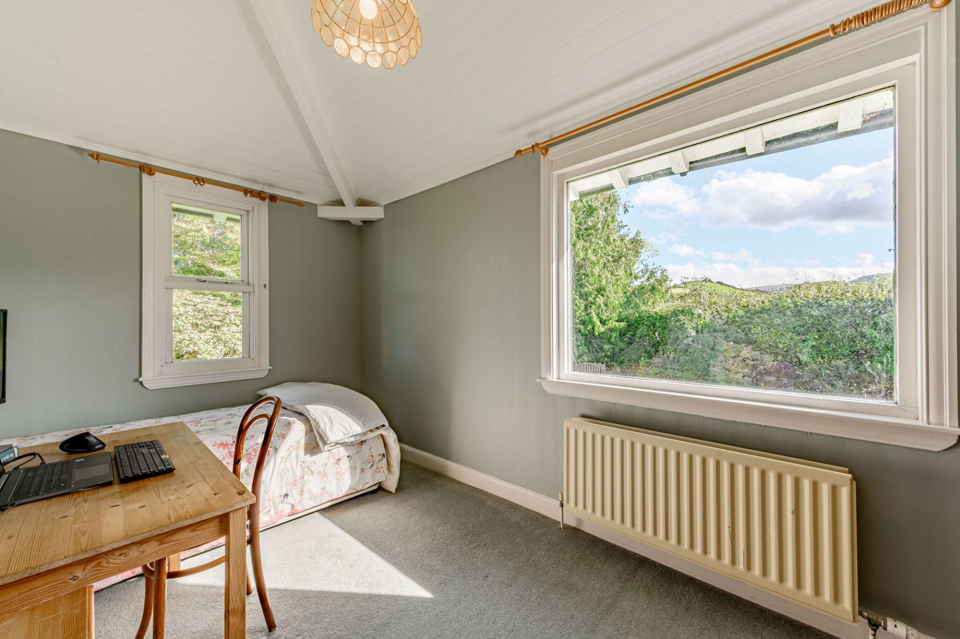A generous living room offers plenty of natural light having a large expanse of windows on both external walls. A glazed door also offers access to the veranda. The original fireplace remains a focal point but is currently unused. An electric, gas or log burning stove could easily be installed here for additional heat. A semi pitched ceiling adds character and its beautifully detailed.