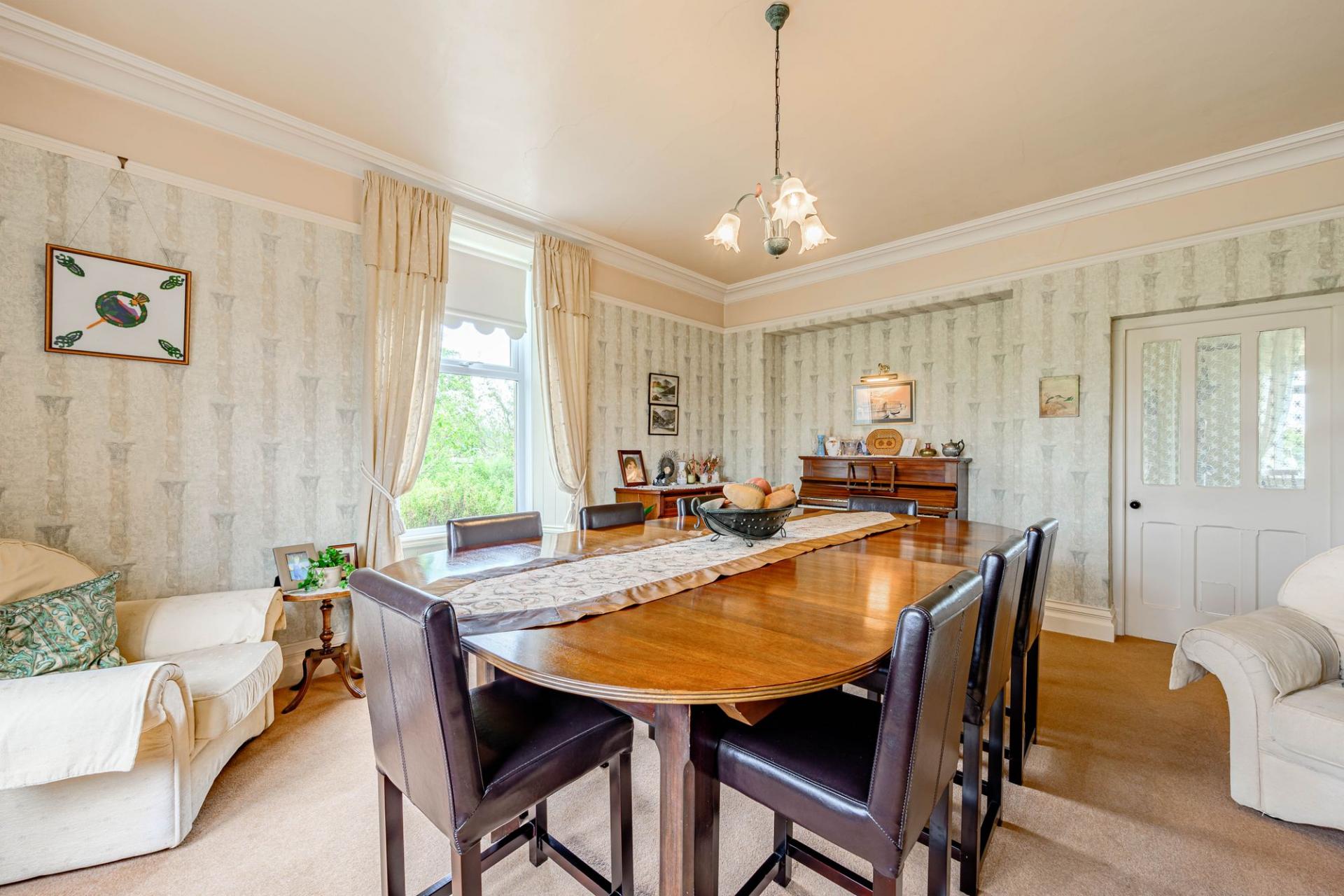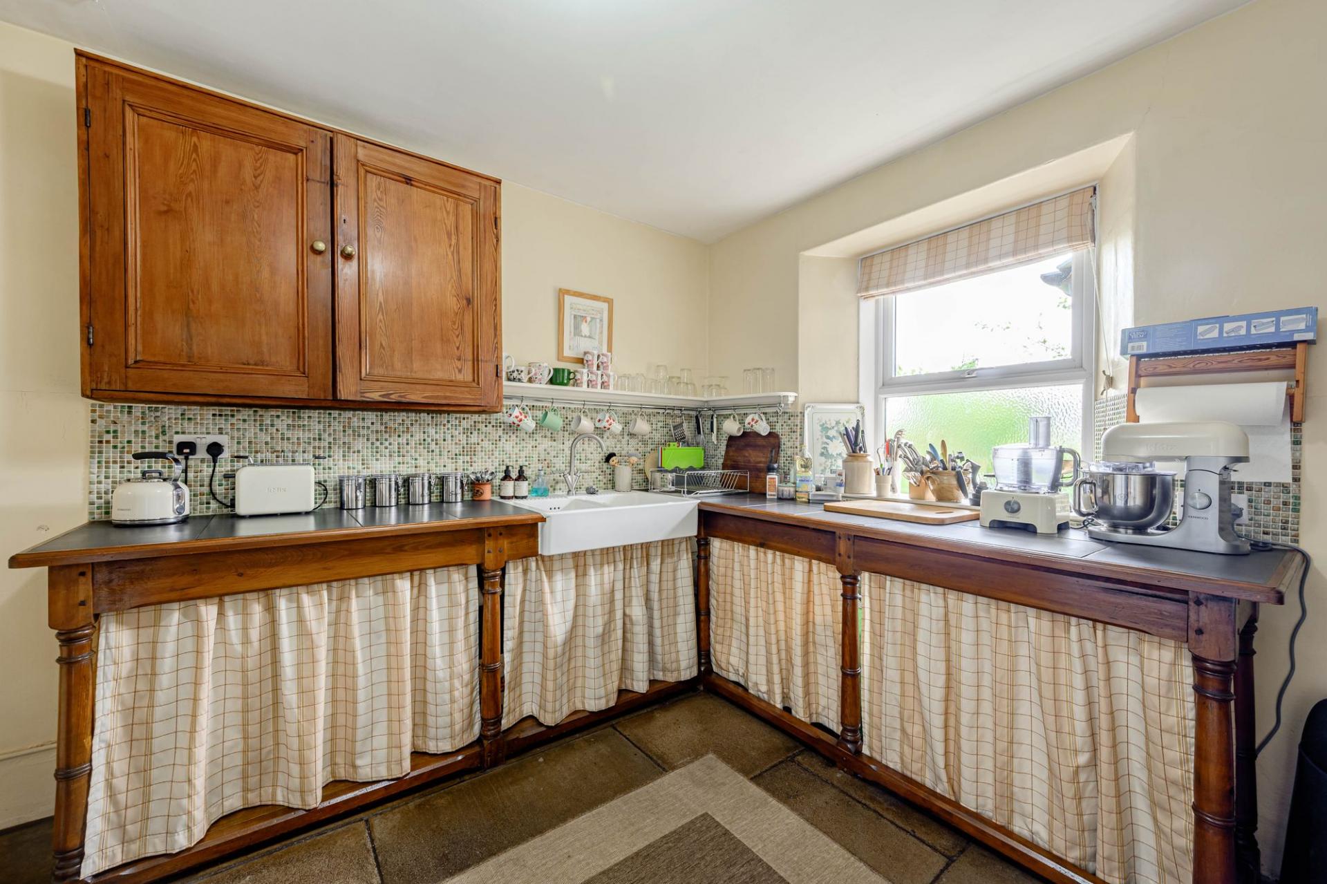 The dining room is a generous, bright, dual aspect room with an open fire in a cast iron surround. It has picture rails and coving, and window seats to take in those views. The family dining kitchen has traditional free standing pitch pine cupboards, a large original press cupboard and plate rack. There is a Rangemaster electric stove with a five-ring induction hob and two ovens, and an original stone flagged floor. From here is the original scullery, it has built in open floor cabinetry and worktops with pretty mosaic splashbacks and a double Belfast sink. There is also a useful pantry with stone floor, original sconces and a frosted window.