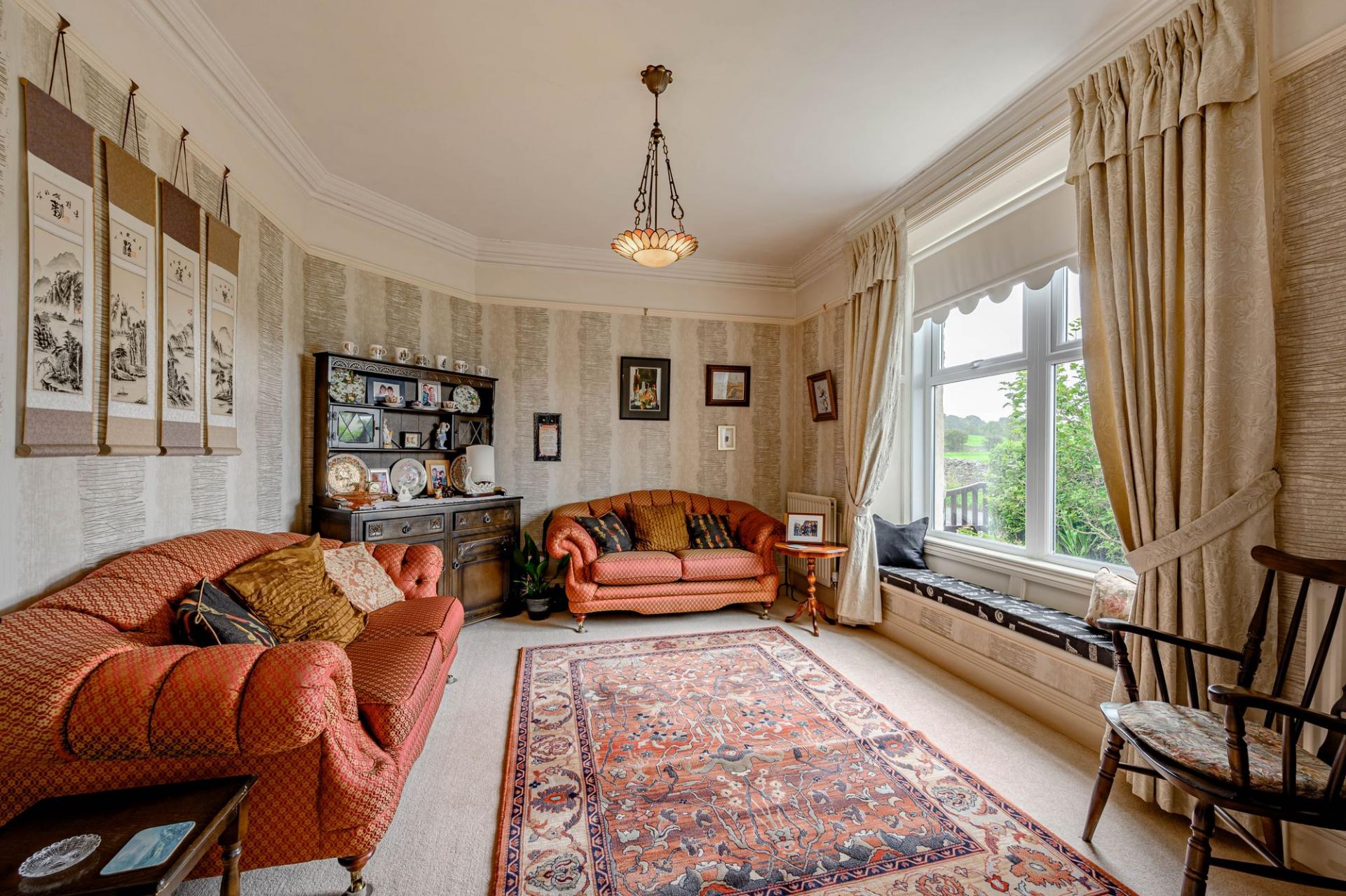 The property is entered via a bespoke oak front door with stained glass surround into a generous light hallway with seating. This leads through to the inner hall where there is a useful cloaks cupboard, and an impressive original turned staircase and wood panelling. There is a charming reception room currently used as an office, also with wood panelling and views onto the garden. From the elegant hallway are two reception rooms one with a marble fireplace and a wood burner stove. Separated by an archway the second reception room has its own door both of these spaces have delightful south facing open views of the fields and onto the Howgills and Green Bell, both have window seats, picture rails and coving.