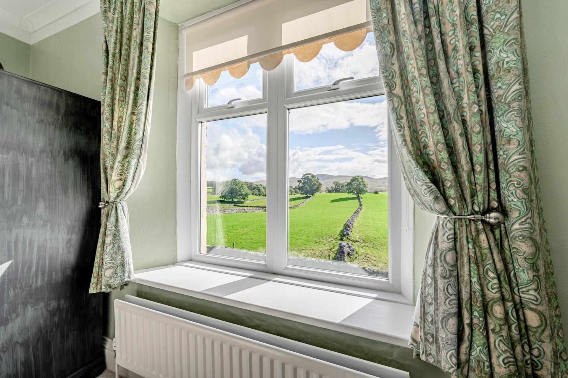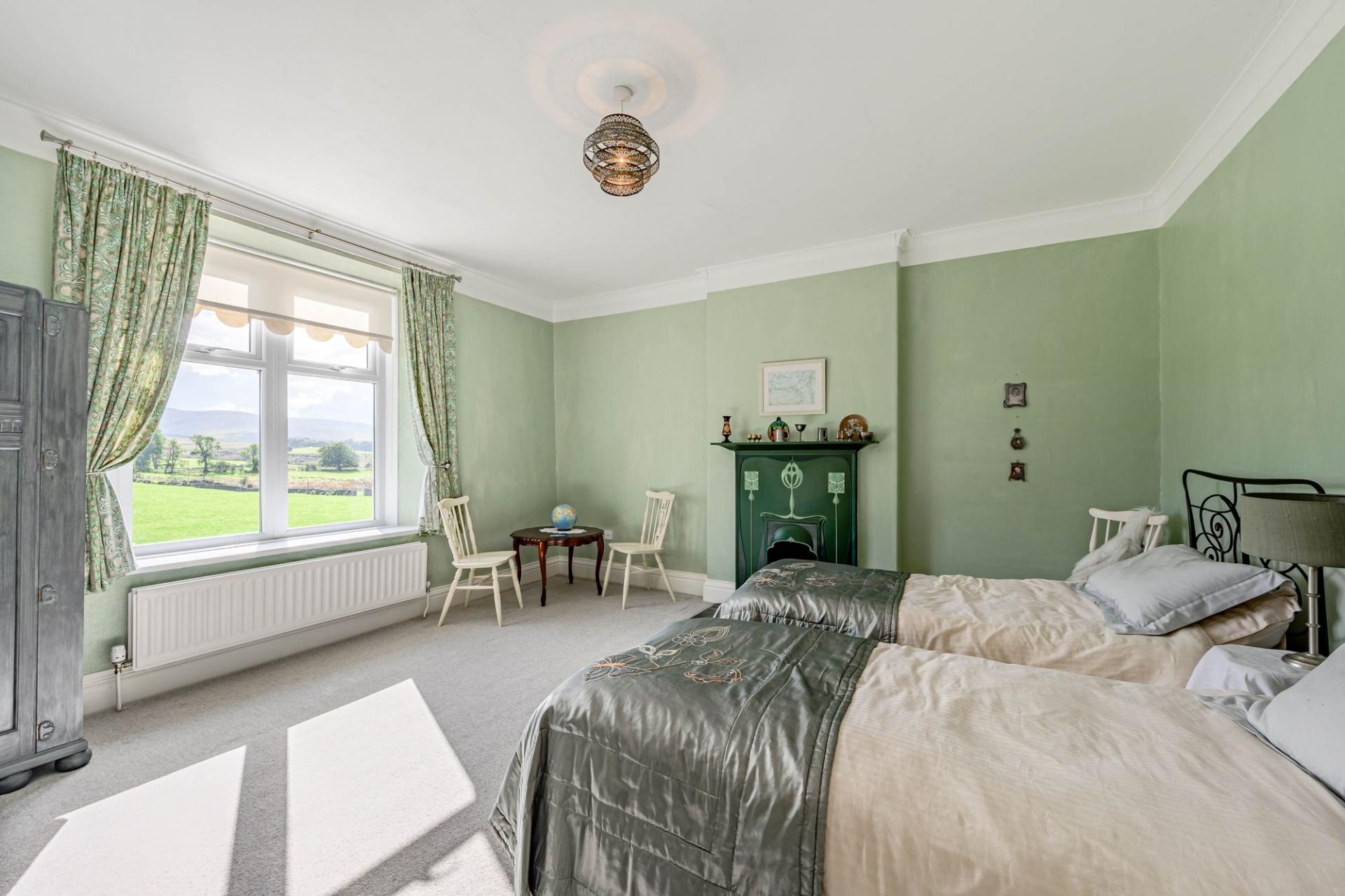 Thehallway and landing are spacious and elegant. There is a generous airing cupboard here and the main family bathroom. A sizeable room with electric underfloor heating, bath, shower, traditional WC, sink, bidet. There are four, large double bedrooms on this floor, all of which have fireplaces, two being period fireplaces and they all enjoy stunning views of the surrounding scenery, towards Wild Boar Fell and Green Bell. There is a second family bathroom, with mains shower and bath, WC, and sink.