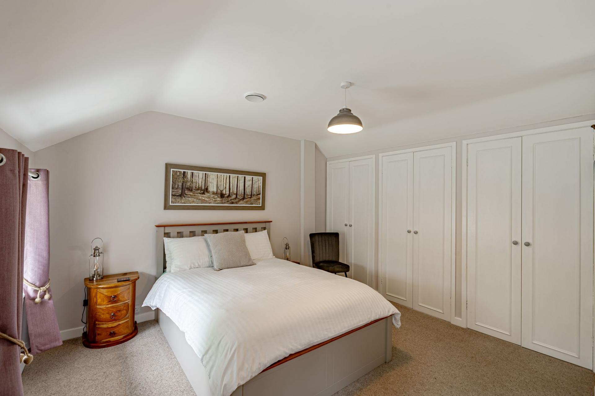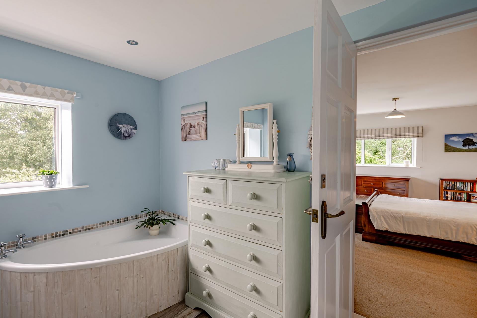 Upstairs consists of three generous double bedrooms. The master bedroom is dual aspect with walk-in wardrobe. The ensuite has a large corner bath, separate shower, sink and WC. There is also a separate family bathroom with large shower cubicle, sink and WC. The two additional double bedrooms are south facing, filled with light and both have generous fitted wardrobes.