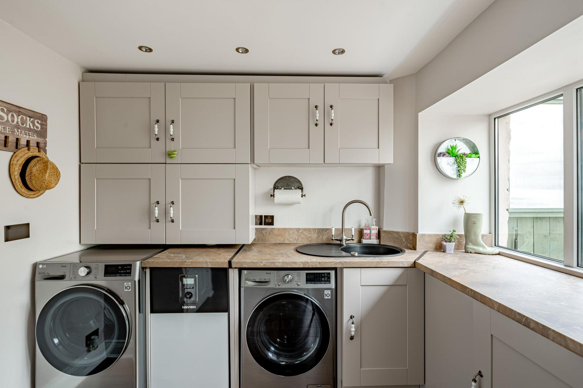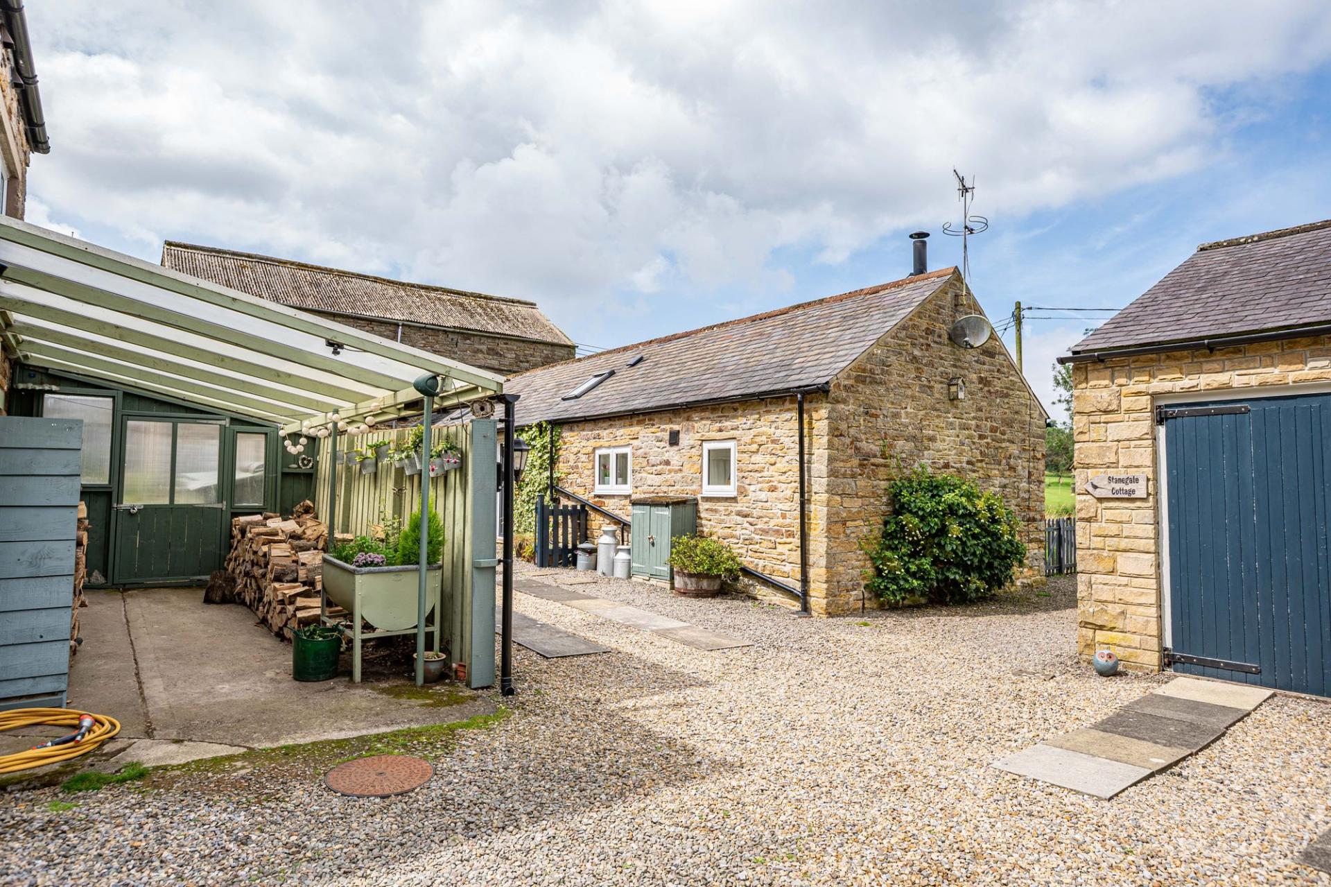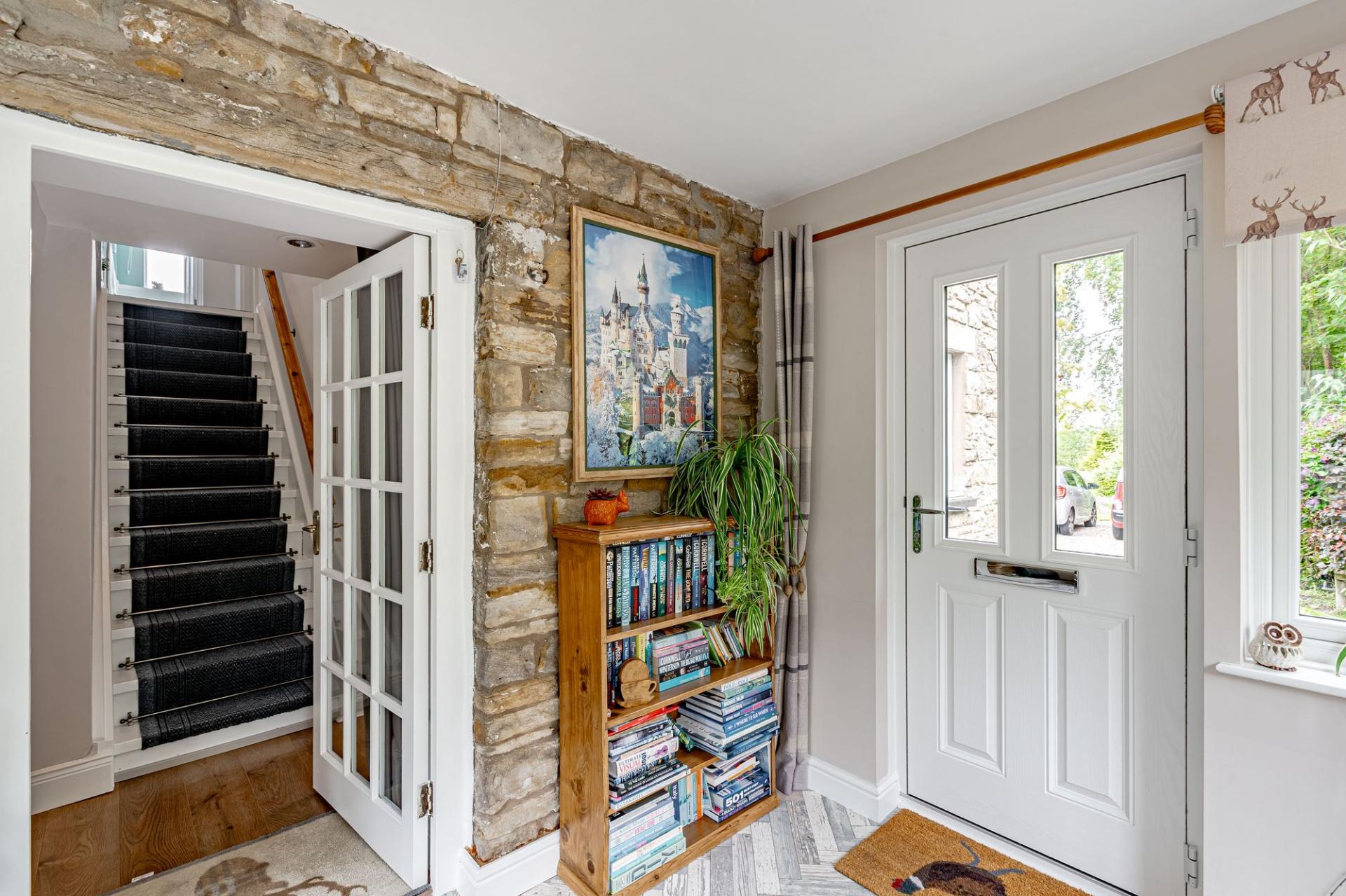 The main property is a semi-detached three bedroomed stone cottage that has benefitted from being extensively updated by the current owners. The property is entered from a gravel drive into the entrance hallway, where there is a generous boot room with ample storage. From here is the well positioned and sizeable utility room which is fitted with a good range of Shaker style wall and base units, there is also a window, sink and space for white goods. In this area is the three year old Navien oil boiler and consumer unit for the property and Stanegate Cottage. Within the utility room is a ground floor WC.