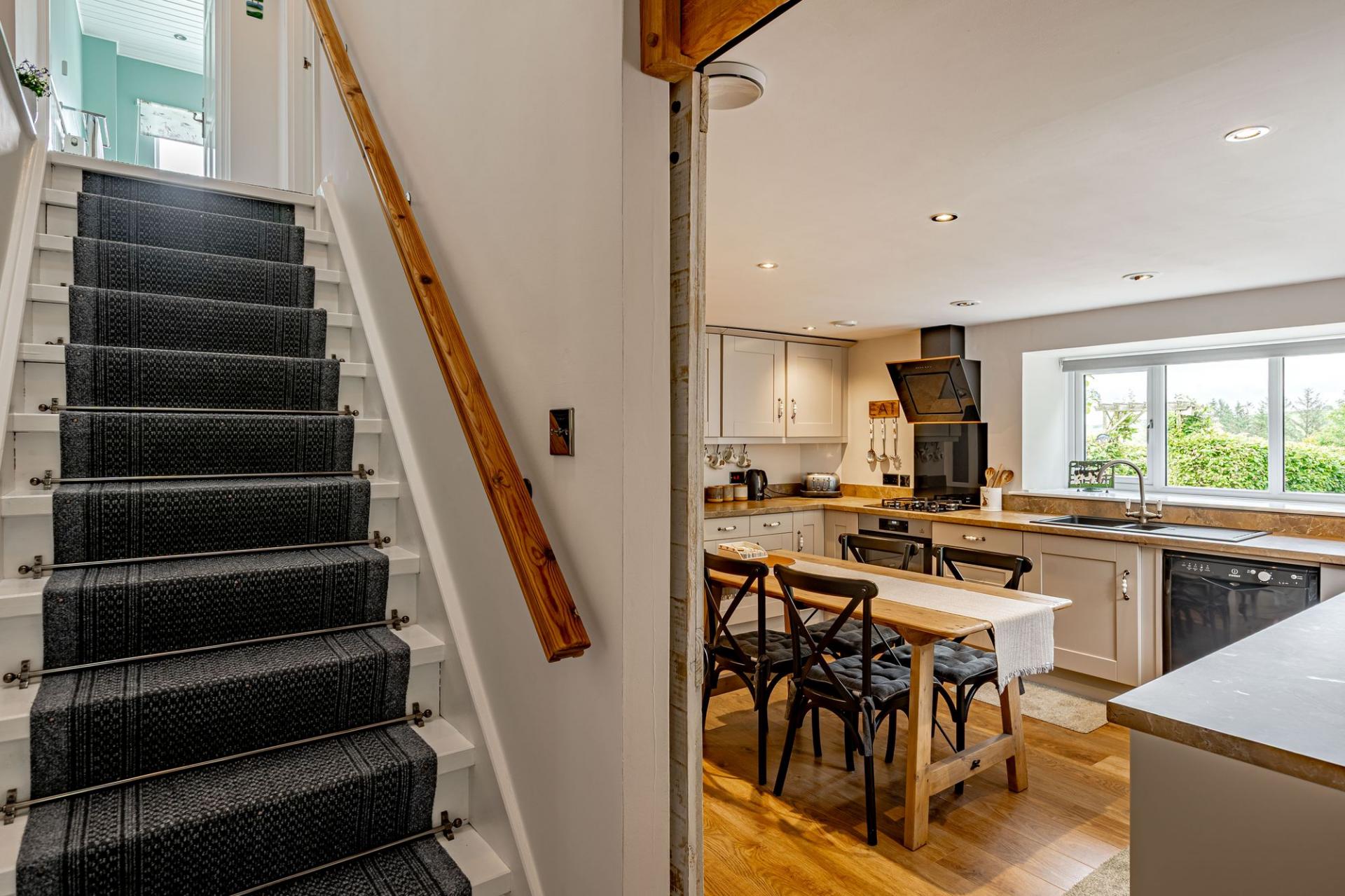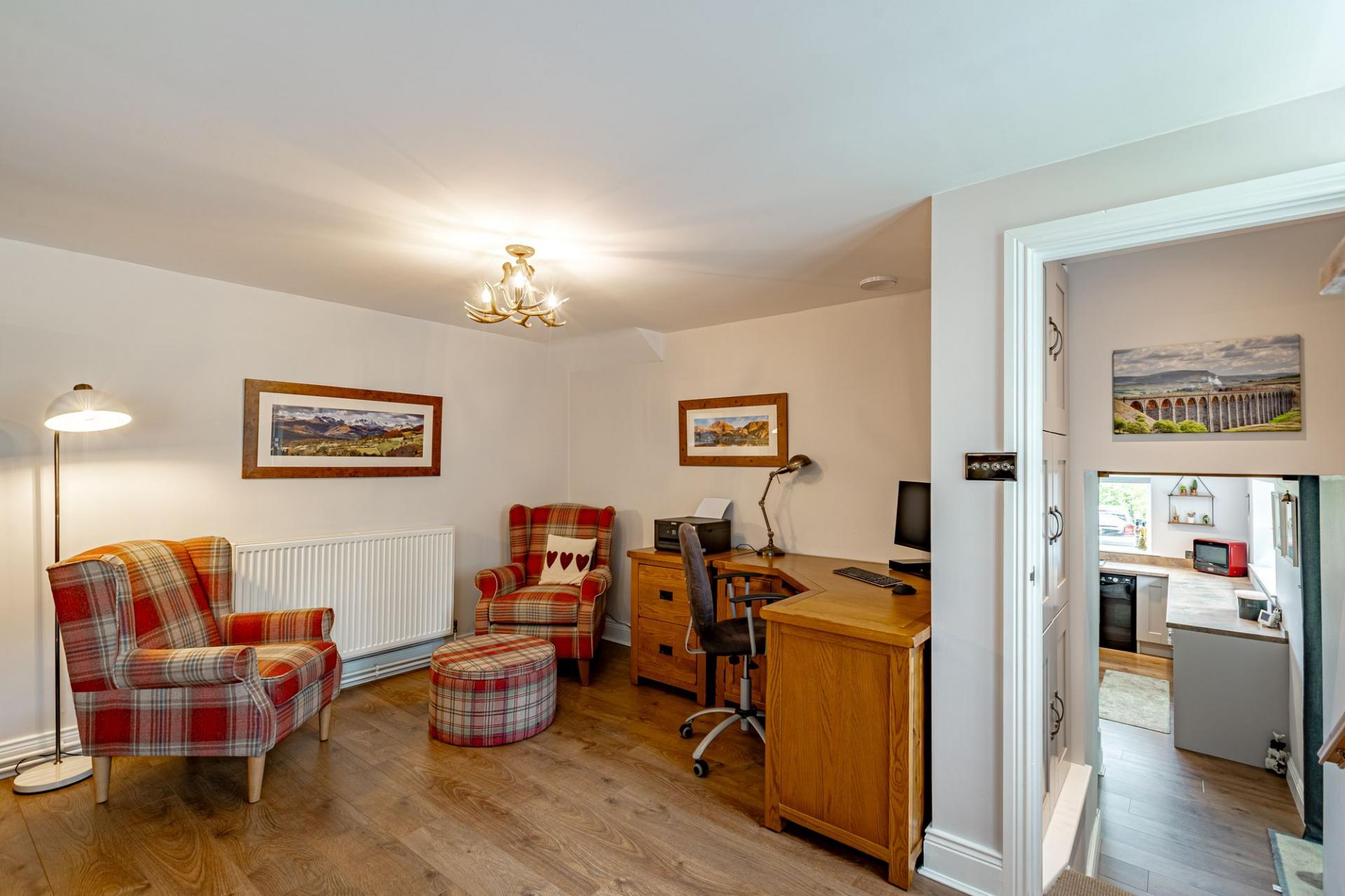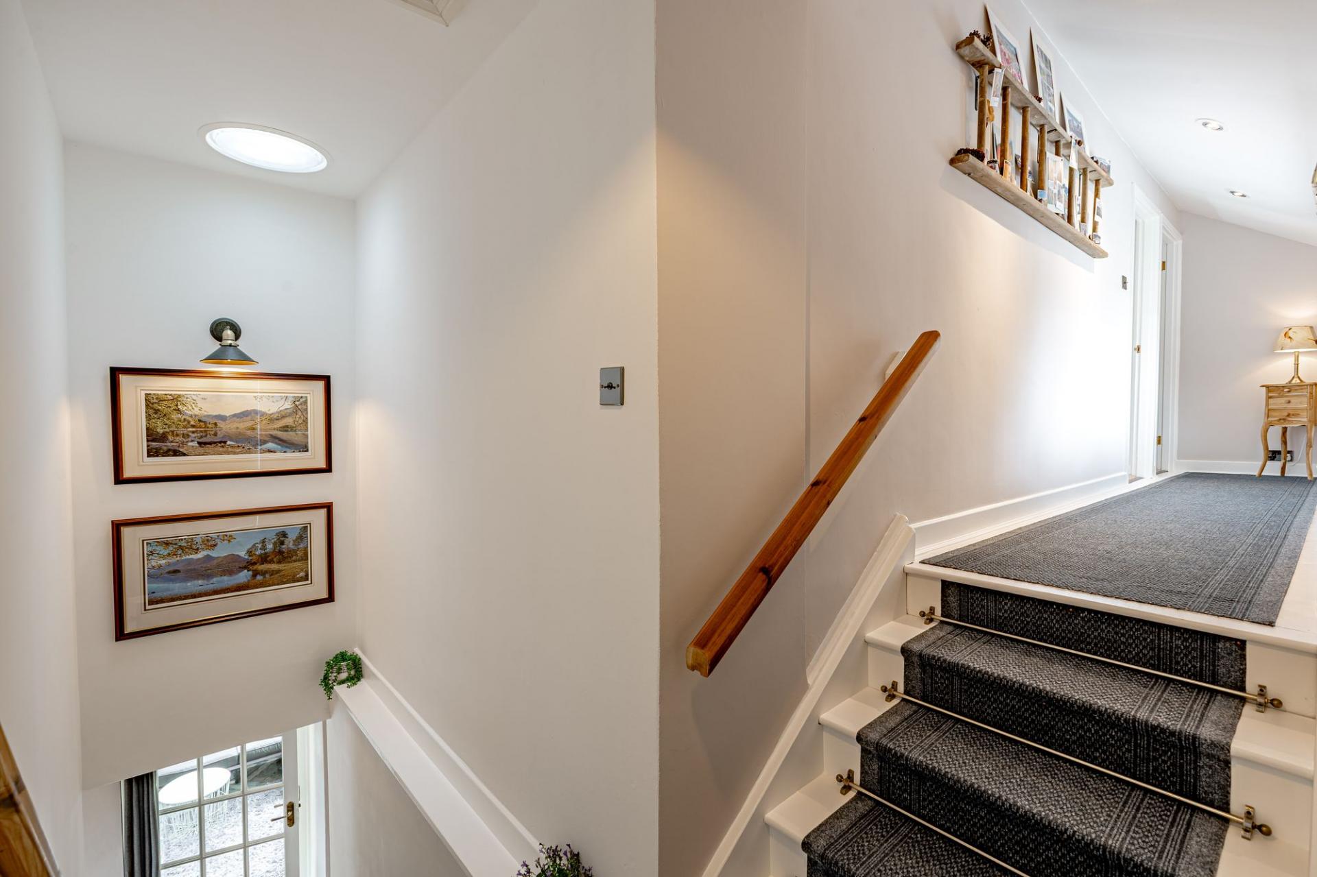 The main property is a semi-detached three bedroomed stone cottage that has benefitted from being extensively updated by the current owners. The property is entered from a gravel drive into the entrance hallway, where there is a generous boot room with ample storage. From here is the well positioned and sizeable utility room which is fitted with a good range of Shaker style wall and base units, there is also a window, sink and space for white goods. In this area is the three year old Navien oil boiler and consumer unit for the property and Stanegate Cottage. Within the utility room is a ground floor WC.