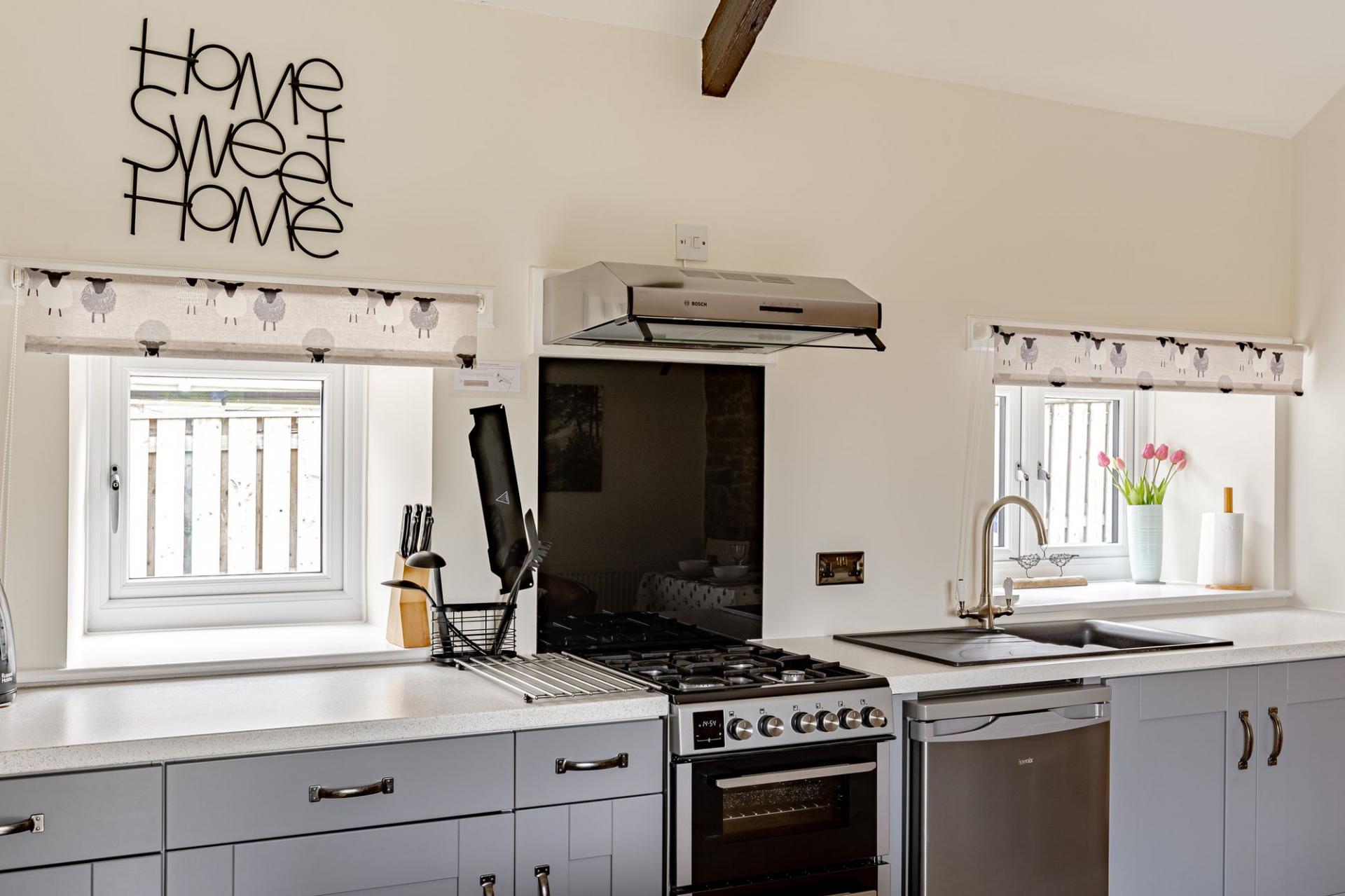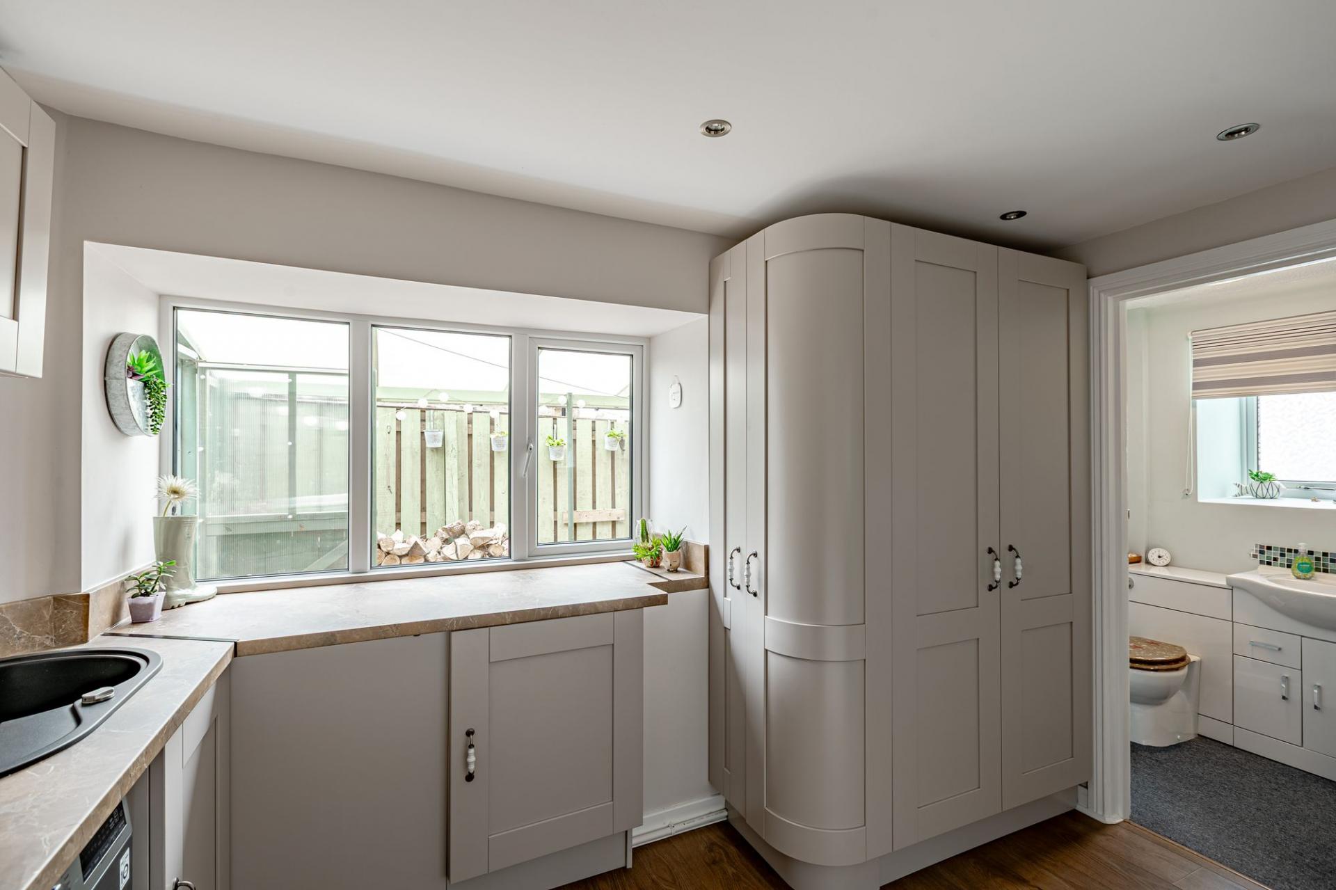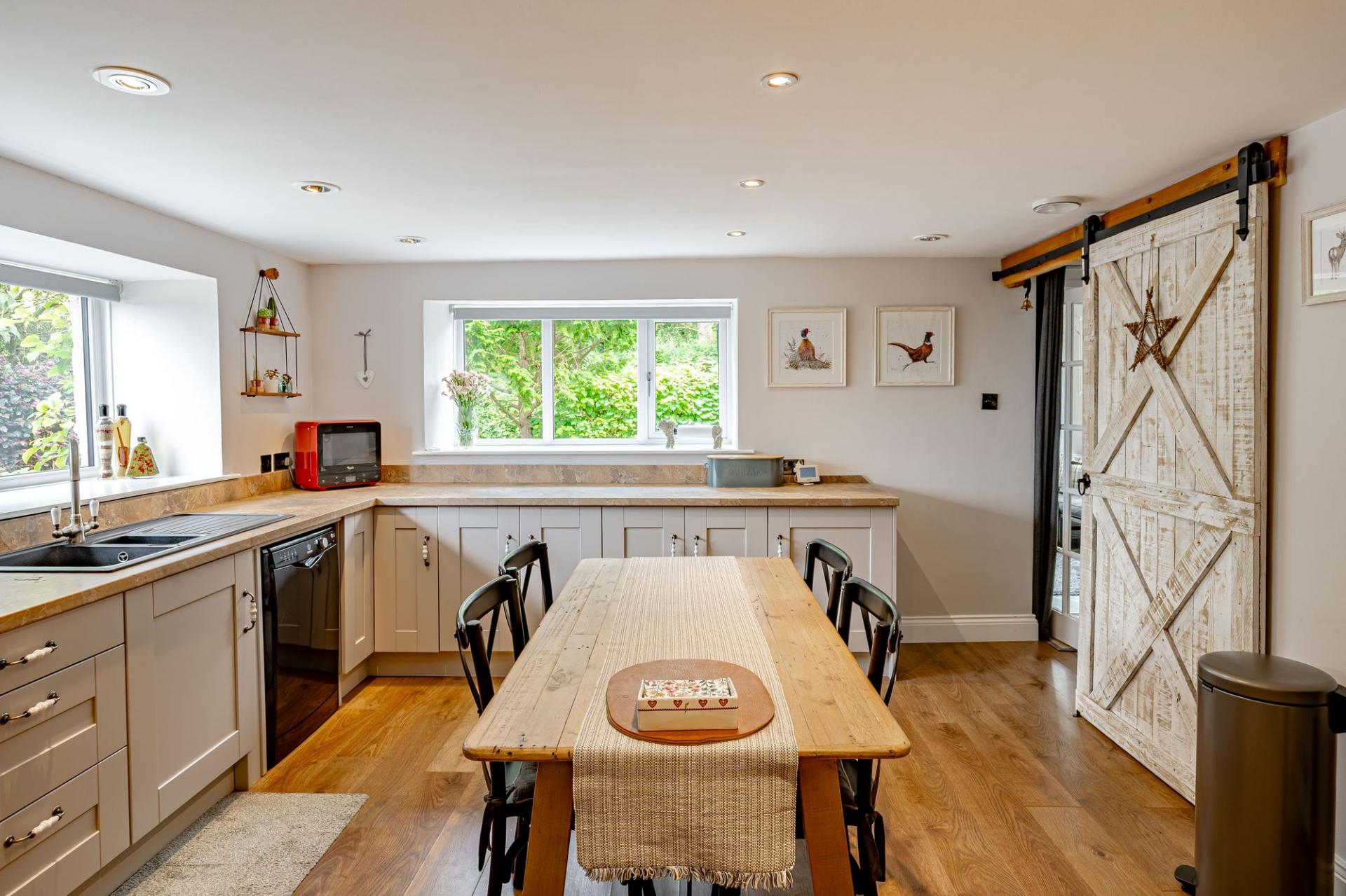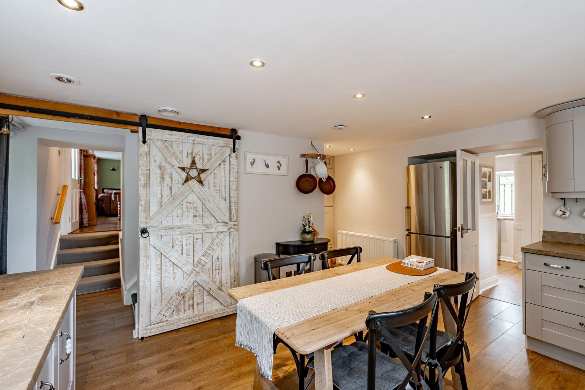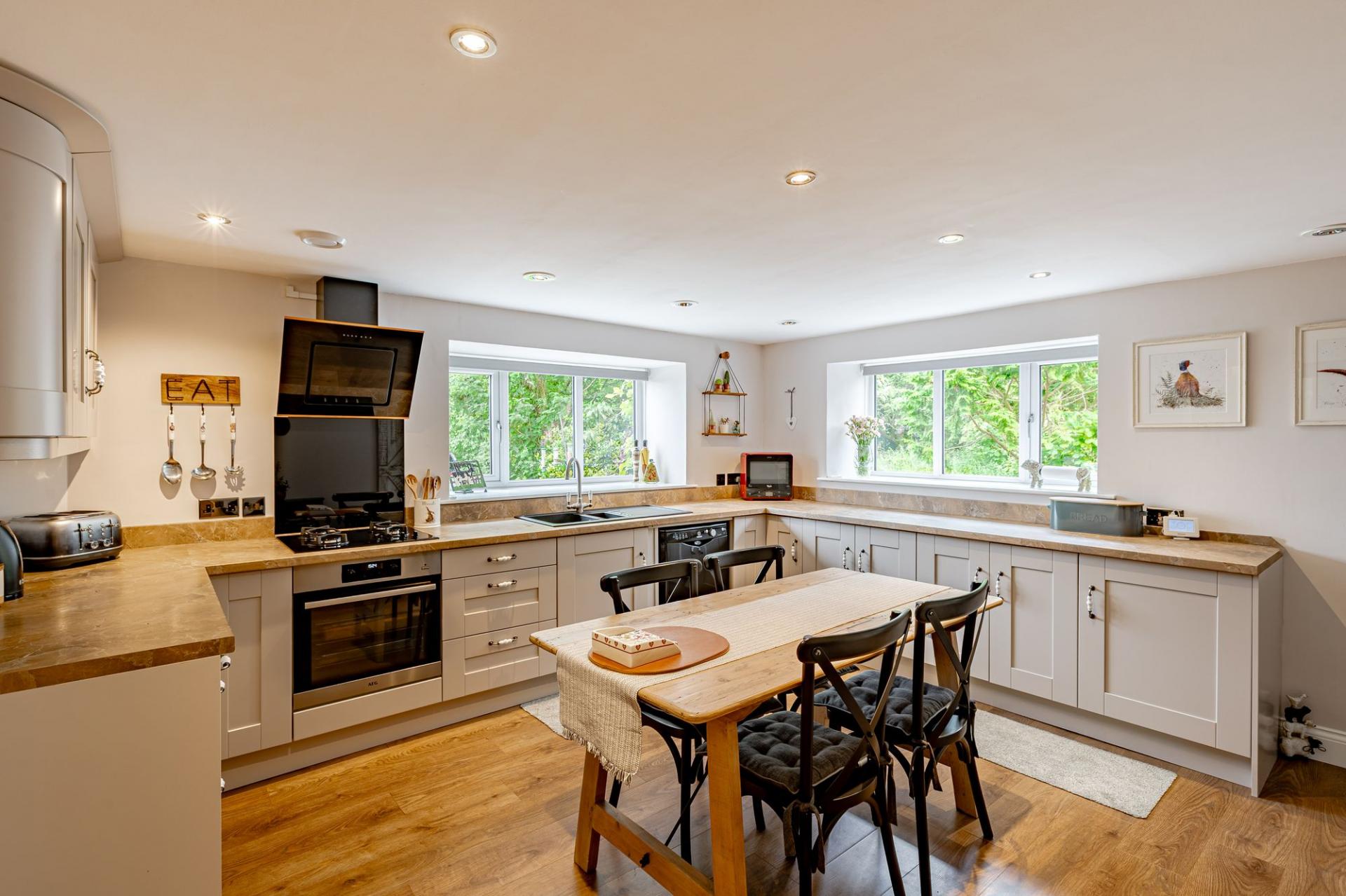 The utility leads seamlessly into the kitchen which is fitted with a continuation of Shaker style floor and wall mounted units. There is an integrated electric AEG cooker, an LPG gas hob and an extractor fan. There is a free-standing dishwasher and fridge freezer and useful understairs storage cupboard.