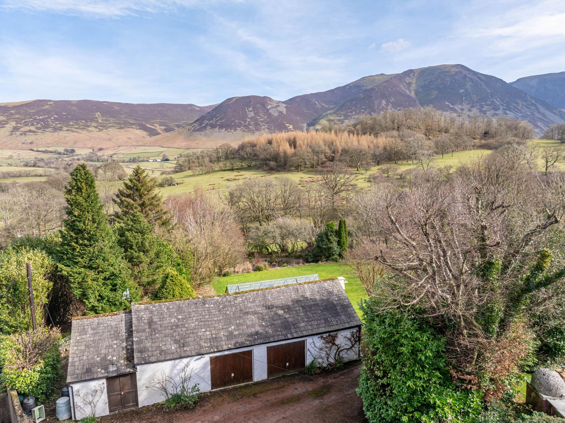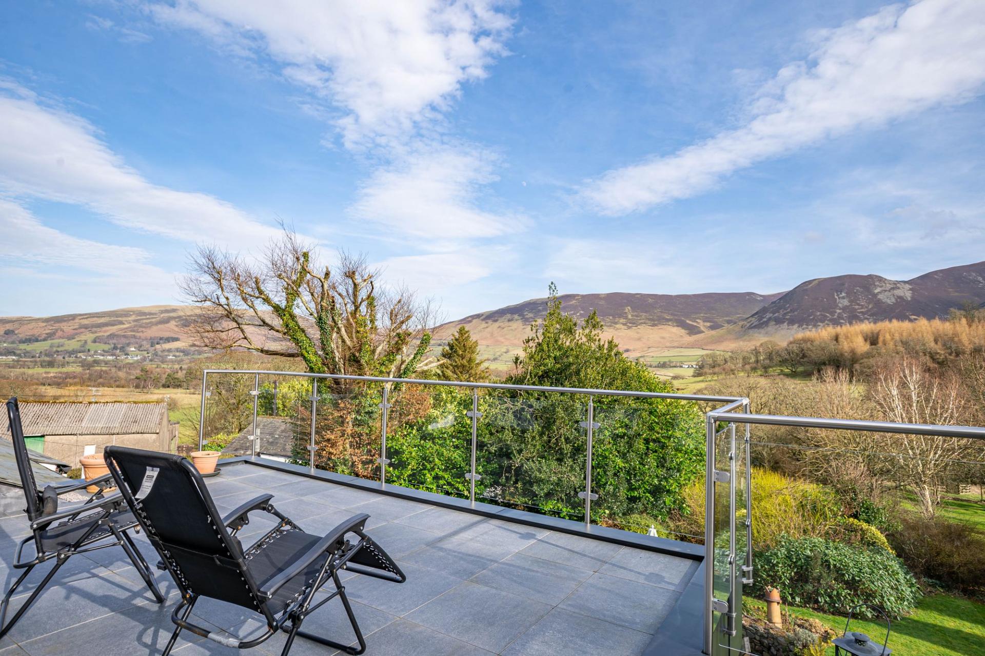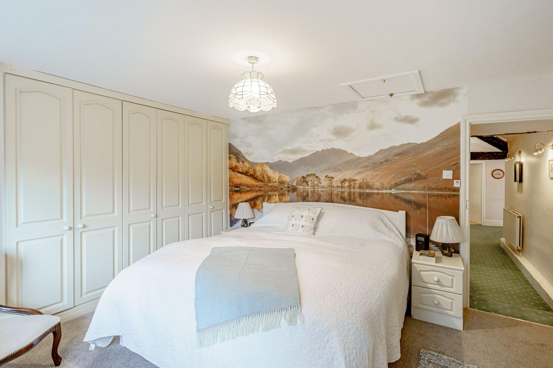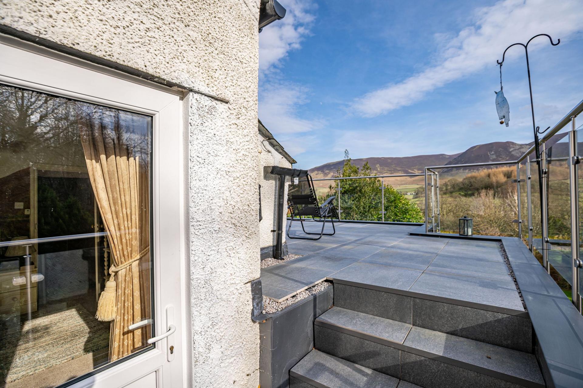 Upstairs in the main house, there are three generous double bedrooms. Both guest bedrooms are spacious and offer low level, recently replaced double glazed sash windows. A large family bathroom features a spacious walk-in shower, generous vanity unit and storage and additional storage / linen cupboard. The main bedroom is a delight, boasting built-in storage, a large window and glazed door providing access to the roof terrace and views of the gardens below. The fully paved roof terrace was added as part of the construction of the garden room and is a real sun trap. It offers the opportunity to relax and appreciate the stunning landscape, with views of the surrounding fells from Kirk Fell to the north, past Whinlatter, Grisedale Peak, Dodd, Whiteside and then Grasmoor down towards the Crummock hills.