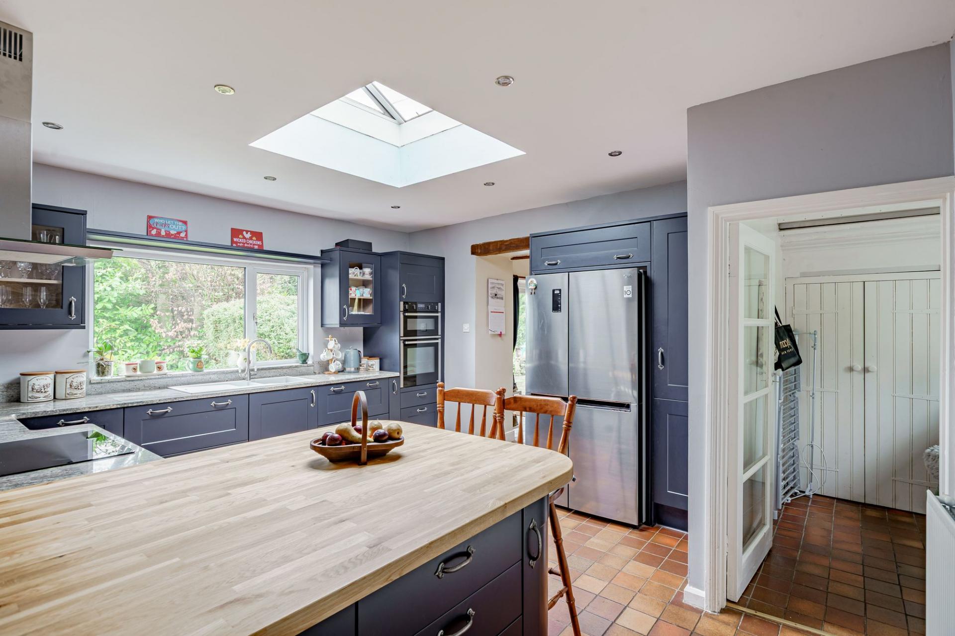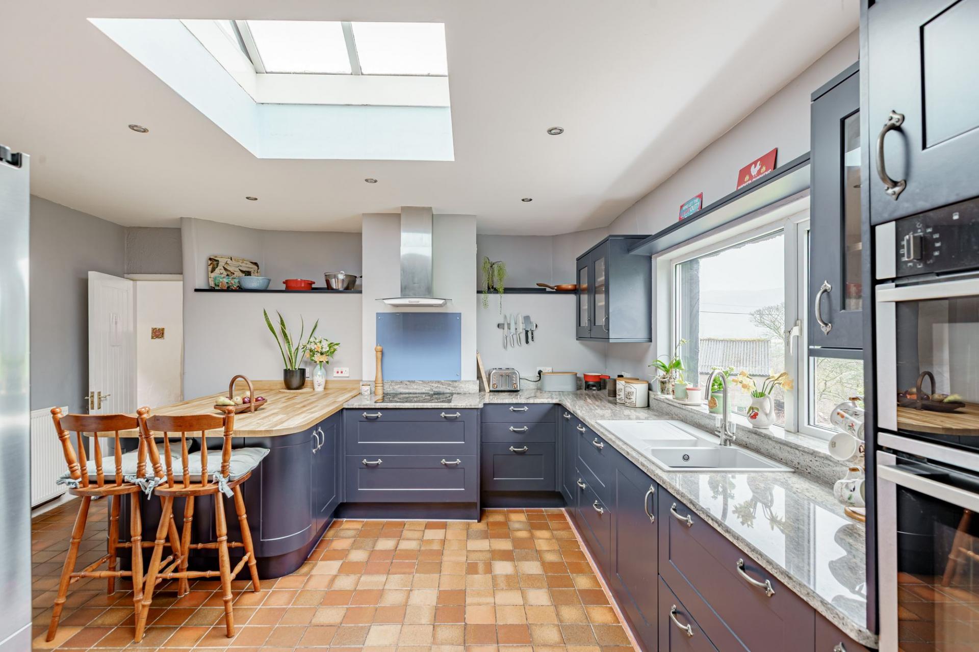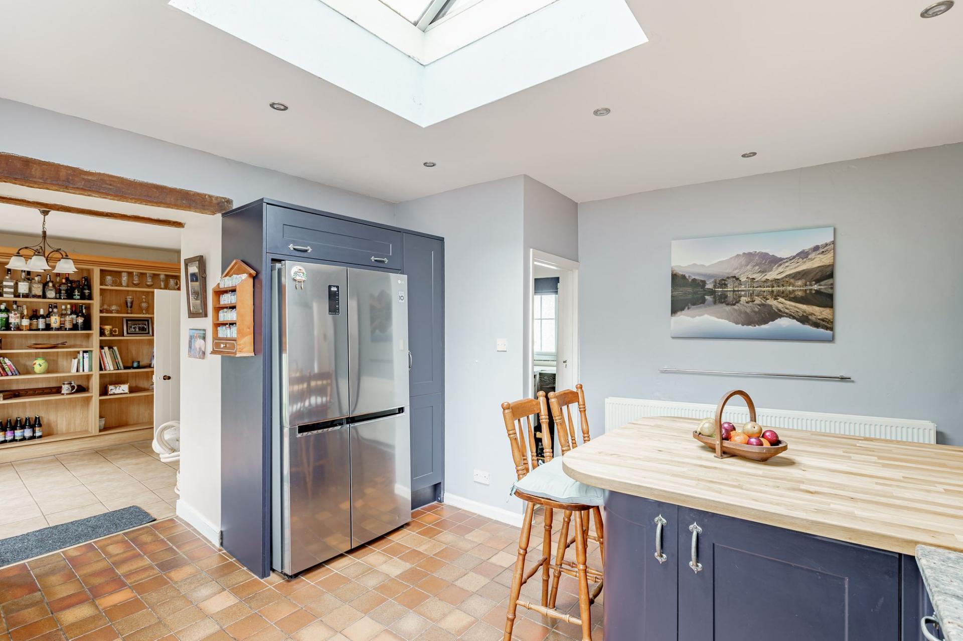 The kitchen has been recently updated and offers fabulous, stylish units finished in navy blue with contrasting granite worktops. A large roof light floods the area with natural light and the views from the windows are expansive. The spacious kitchen island, with solid oak worktop acts as a breakfast bar and offers additional storage. High end NEFF appliances feature throughout, including separate oven, grill and induction hob plus a large fridge freezer is built into additional, custom, storage units. A useful utility / laundry room is accessed directly from the kitchen providing additional storage and a traditional pantry.