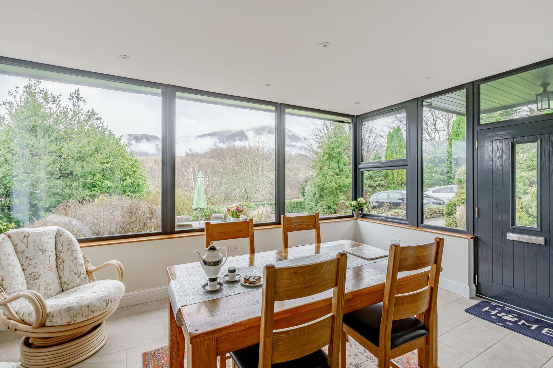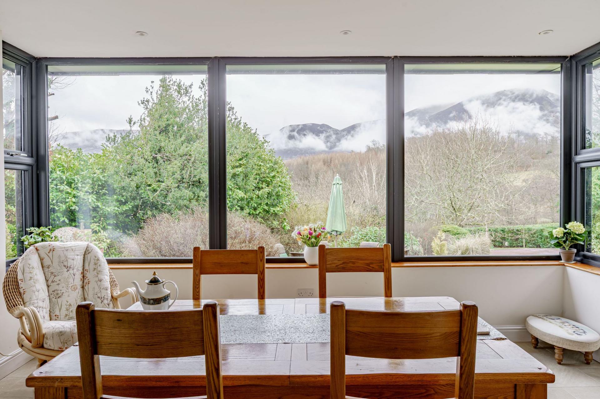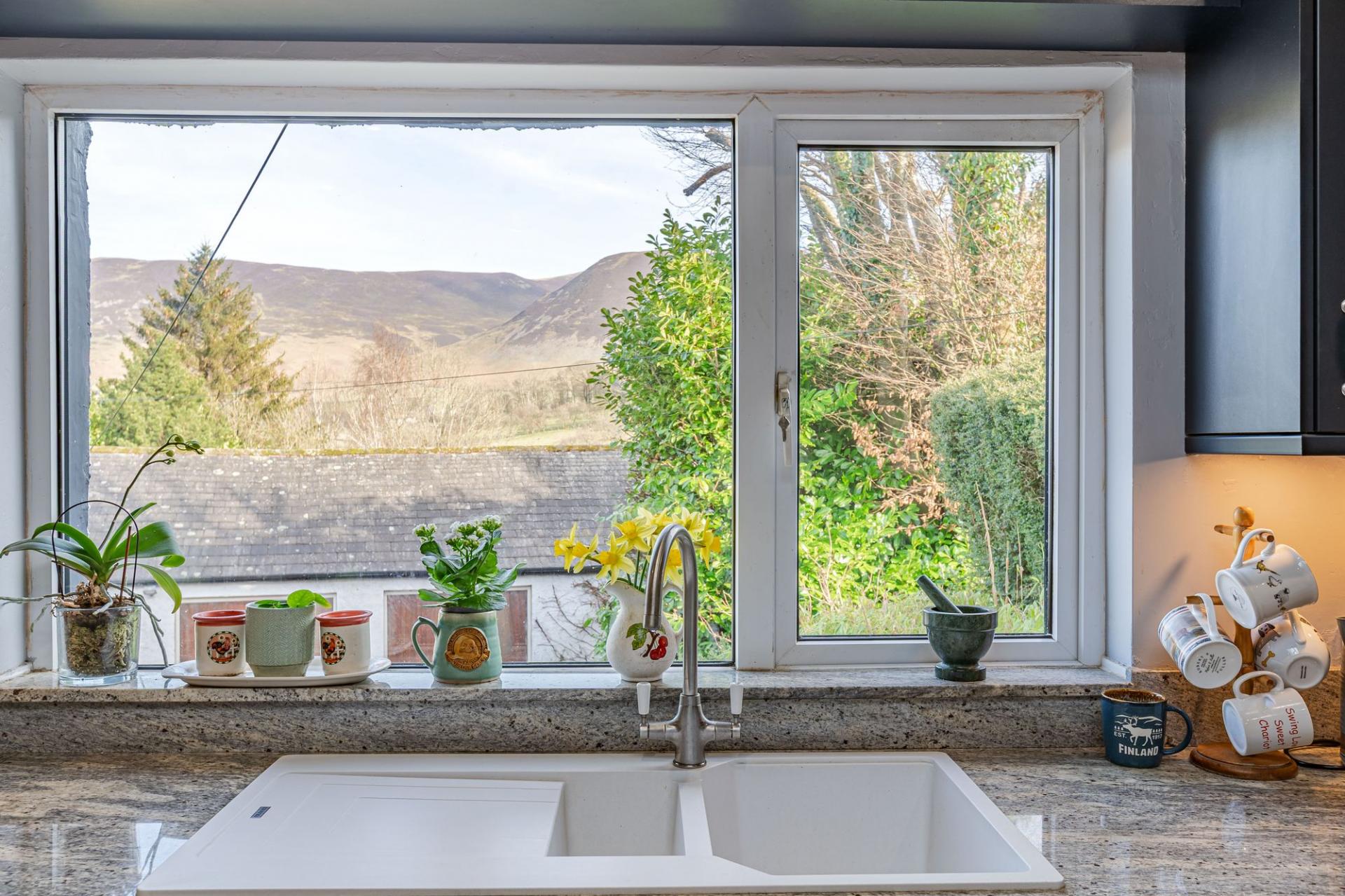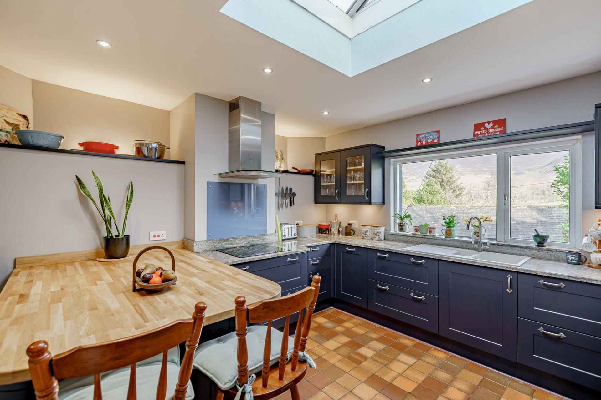 Entering the property via the main door to the garden room, the eye is immediately drawn to the stunning view across the valley. The high windows were designed to ensure that the tops of the mountains would be visible from all parts of the combined garden room and original house lounge area. The garden room is currently used as a dining room but will also make a spectacular reading and relaxing lounge itself. The main lounge is provided with a log burning stove. The entire combined lounge was subject to a major renovation in 2023 with additional high specification insulation and the entire room is provided with underfloor heating derived from a standalone boiler. A picture window to the side of the lounge looks onto the gardens and rockery area where bird feeders hang, welcoming various species as well as red squirrels.