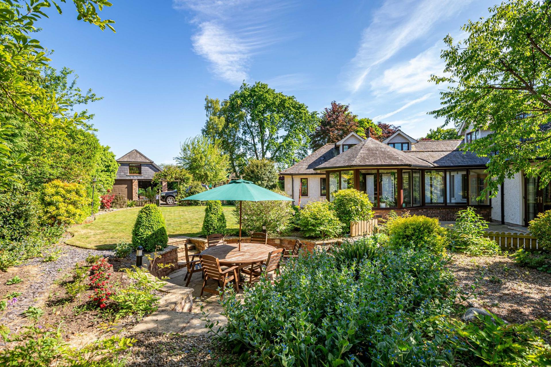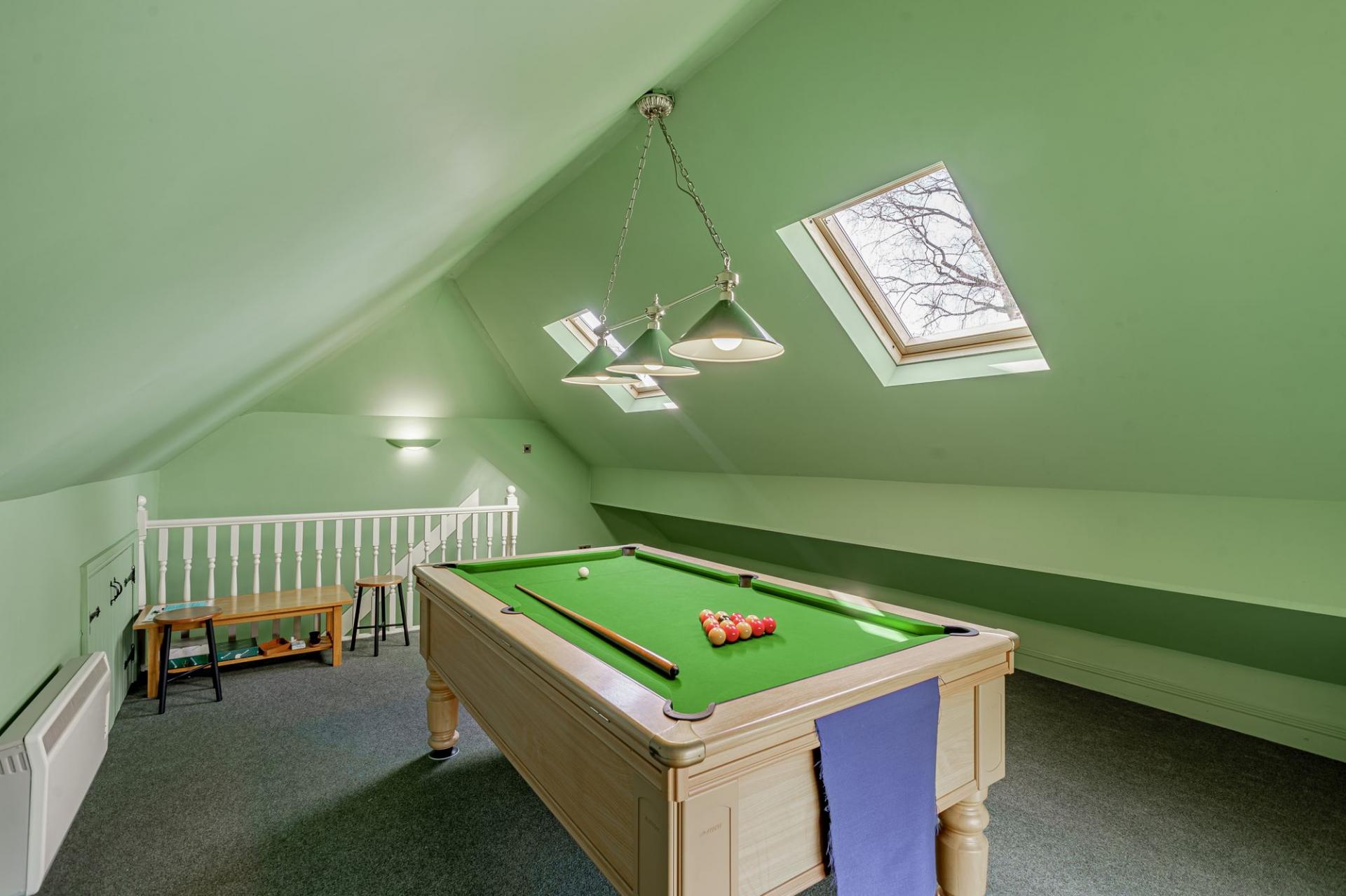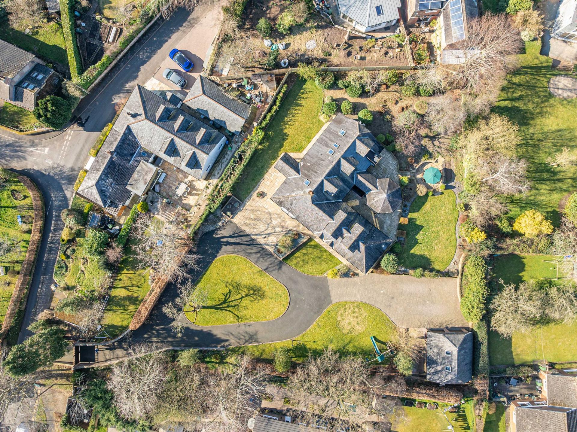 Hunters Croft is approached by private circular driveway with electric gates and has a detached double garage with games room over. Private and secluded gardens surround the property and give this home an exceptional feeling of privacy, unusual for such a central village location. The garden has an excellent range of mature trees and plants with dining and patio areas and formal lawns. There is also a double garage, with one electric door and one manual, ample storage and an external EV charging point. Separate power and water. There is a WC and sink to the rear of the garage and stairs lead to the games room, this useful and flexible space and could easily be repurposed as a home office or studio to suit the new owners needs.