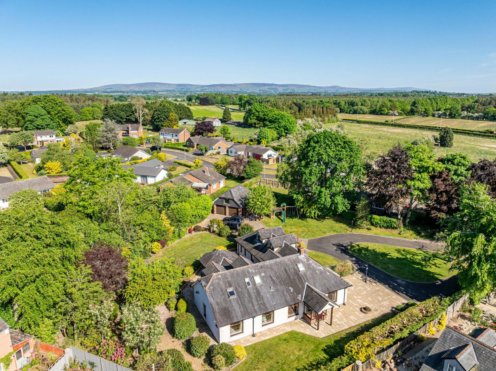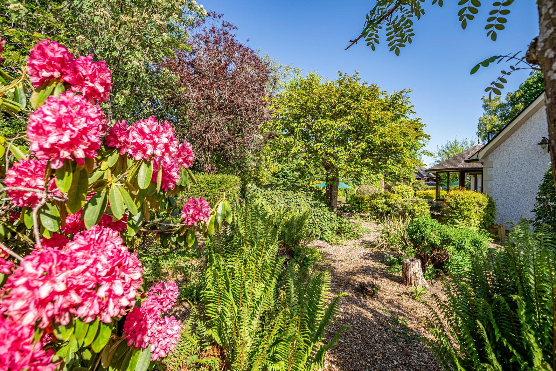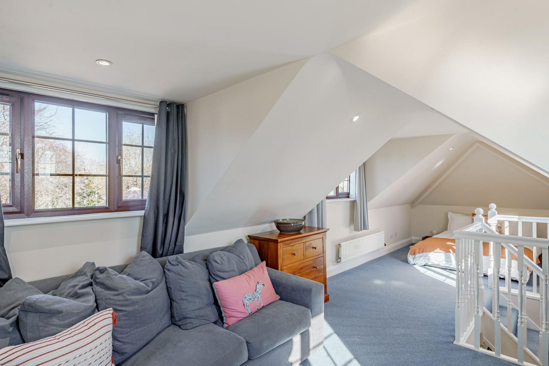 Hunters Croft is approached by private circular driveway with electric gates and has a detached double garage with games room over. Private and secluded gardens surround the property and give this home an exceptional feeling of privacy, unusual for such a central village location. The garden has an excellent range of mature trees and plants with dining and patio areas and formal lawns. There is also a double garage, with one electric door and one manual, ample storage and an external EV charging point. Separate power and water. There is a WC and sink to the rear of the garage and stairs lead to the games room, this useful and flexible space and could easily be repurposed as a home office or studio to suit the new owners needs.