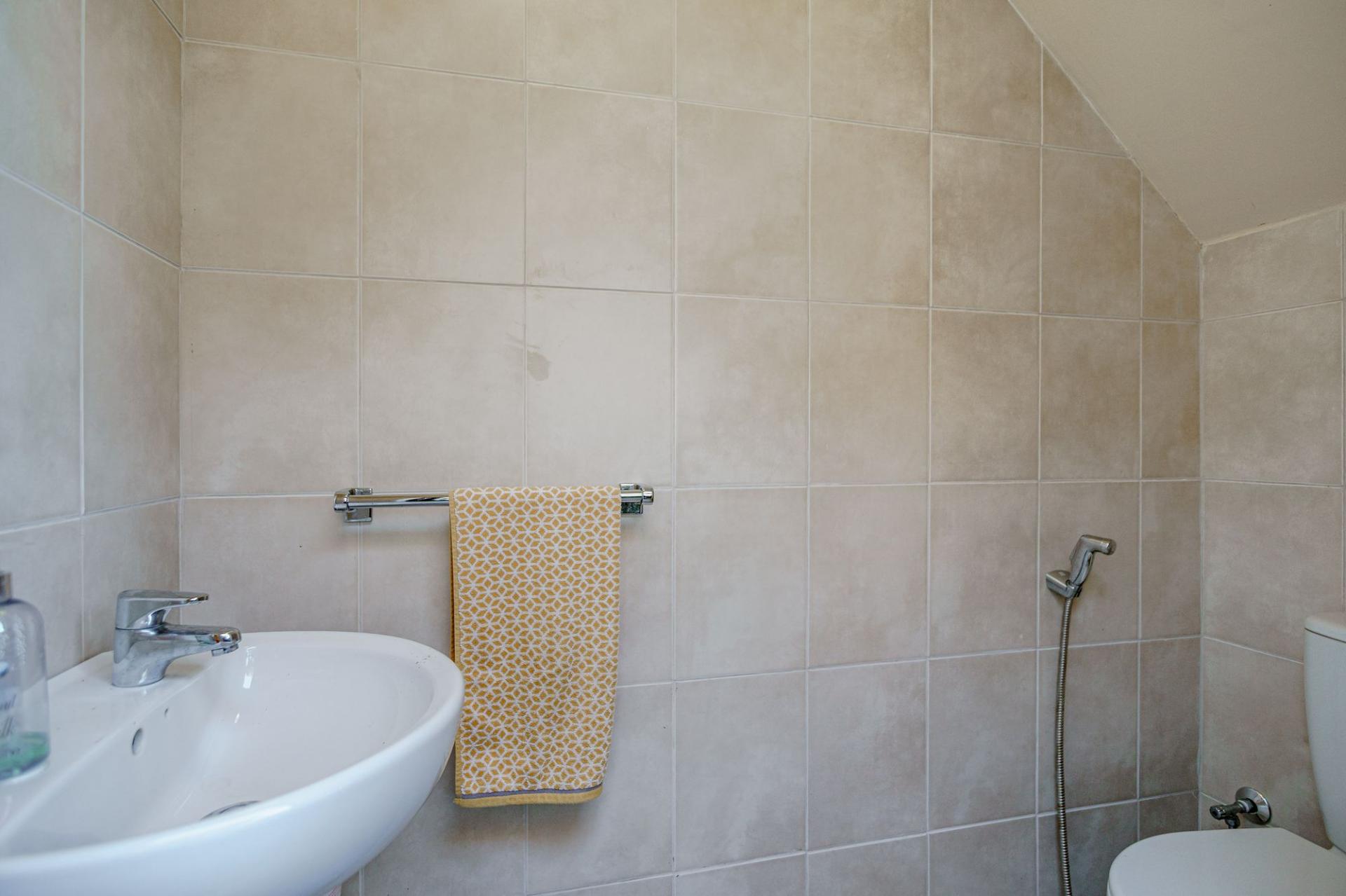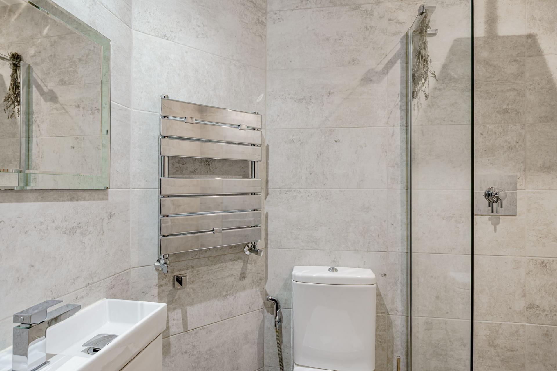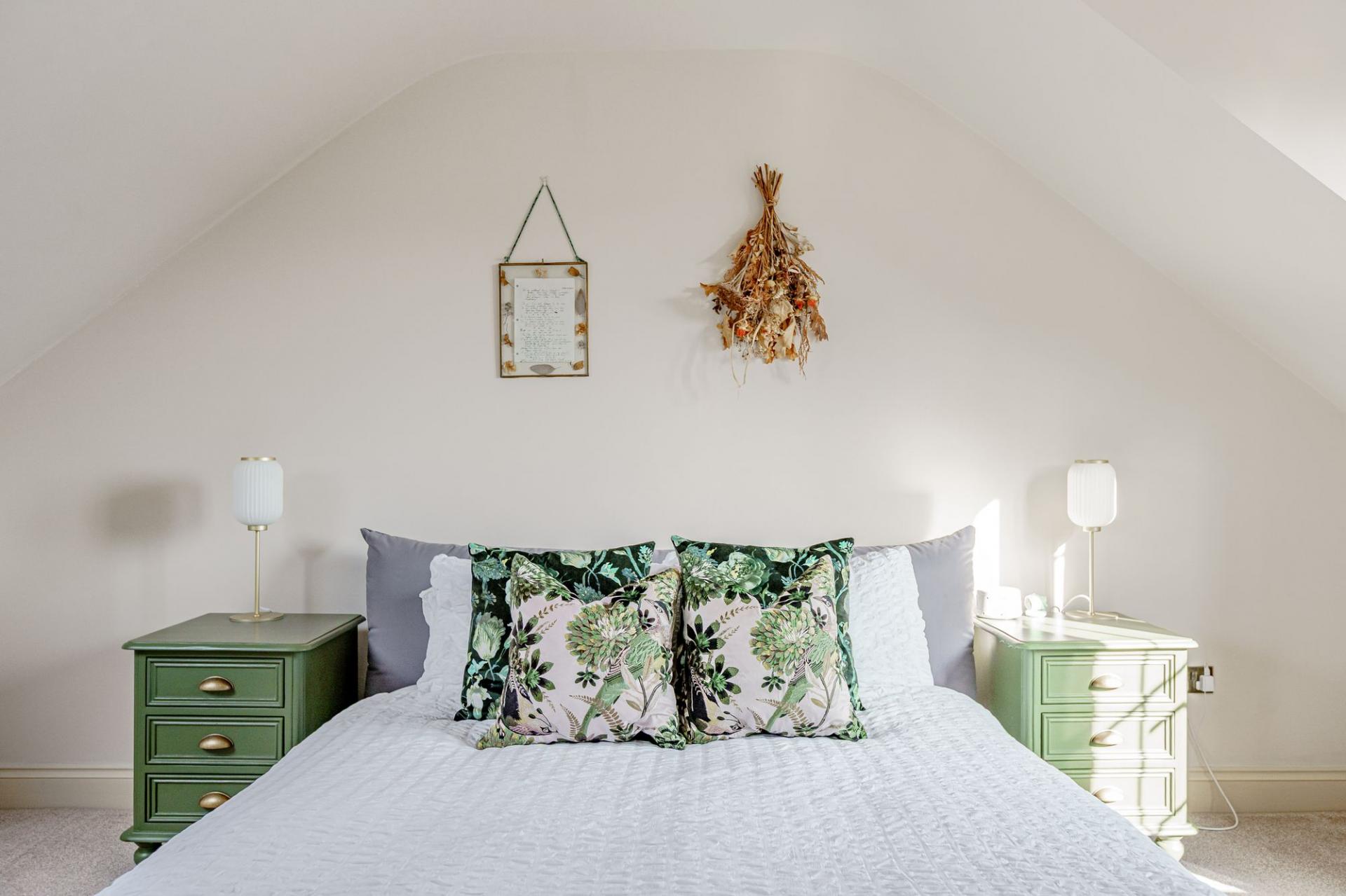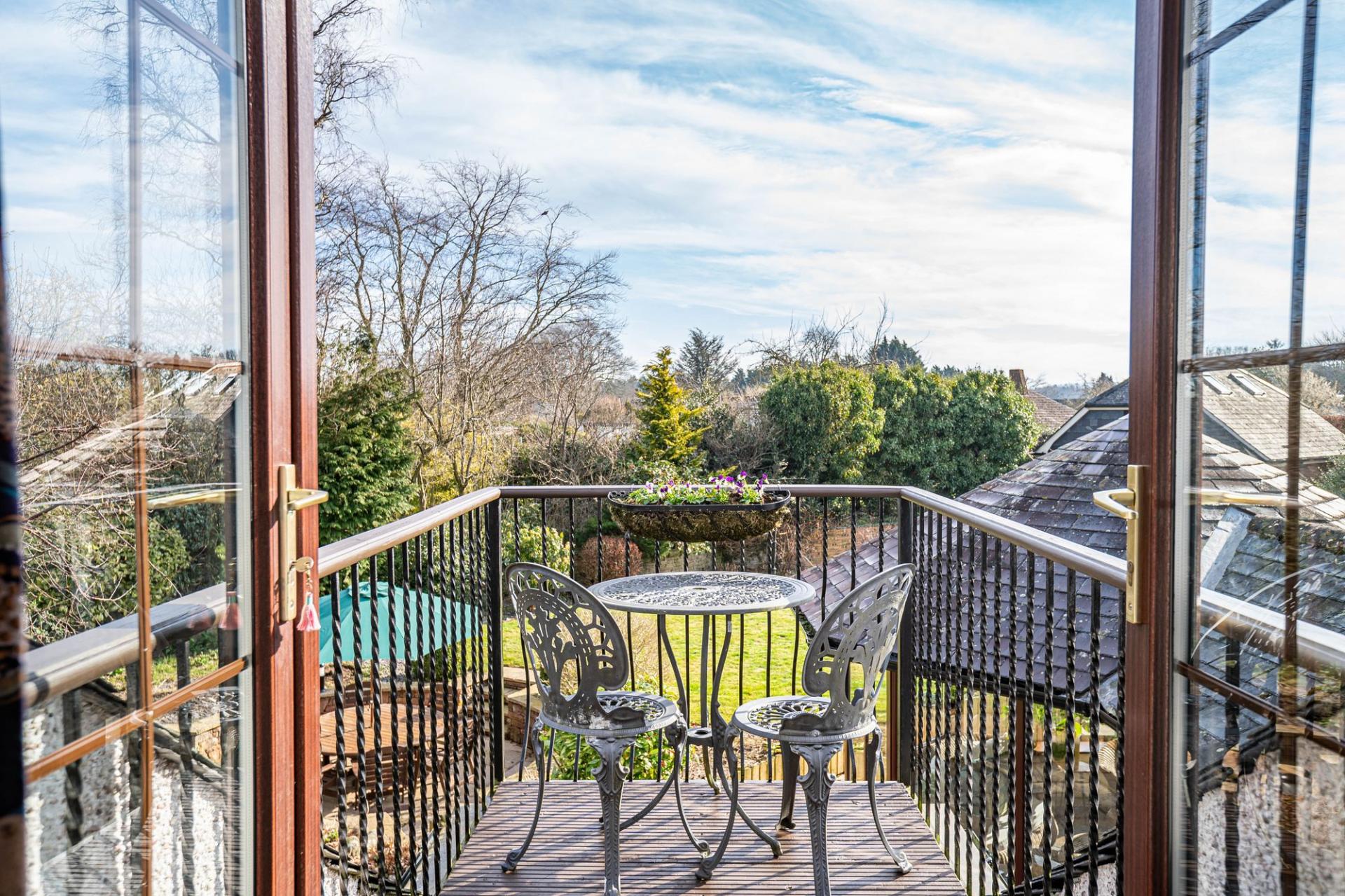 The staircase leads to two further bedrooms. To the right, the bedroom is large with a useful under eaves store which houses the water tank. To the left is the master suite which has a generous dressing area and bathroom, accessible to both the bedrooms and finished to a very high standard with walk in shower WC and built in hand painted cabinetry. The dressing room has bespoke built in cupboards maximising the storage there and the adjoining master bedroom is a delightful bright space with patio doors onto a charming balcony.