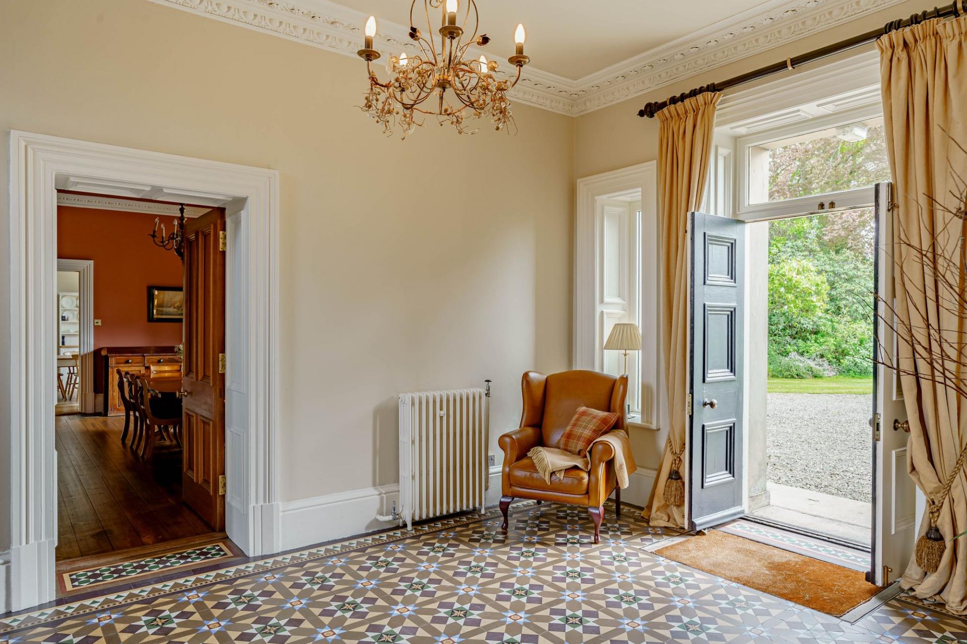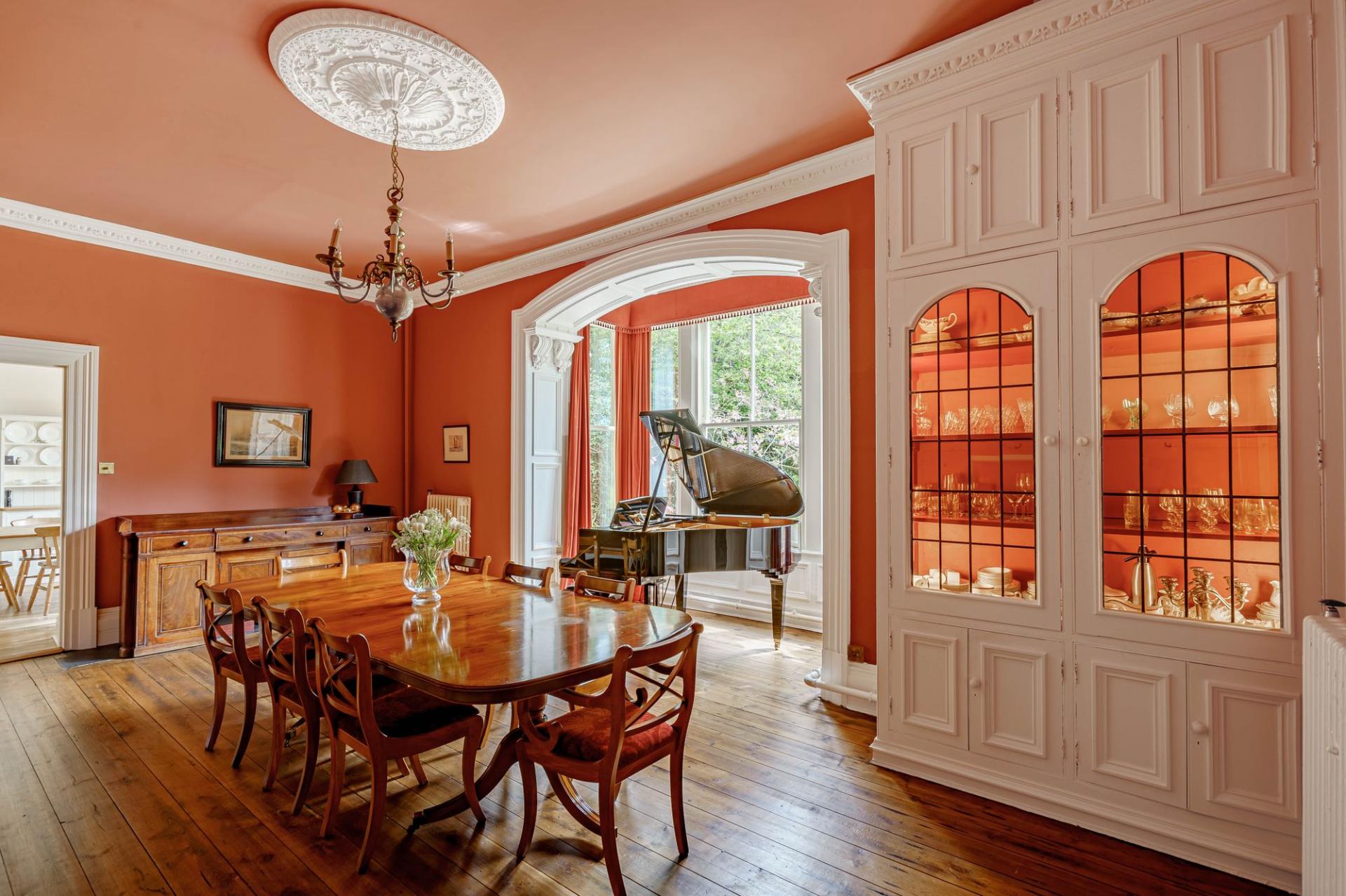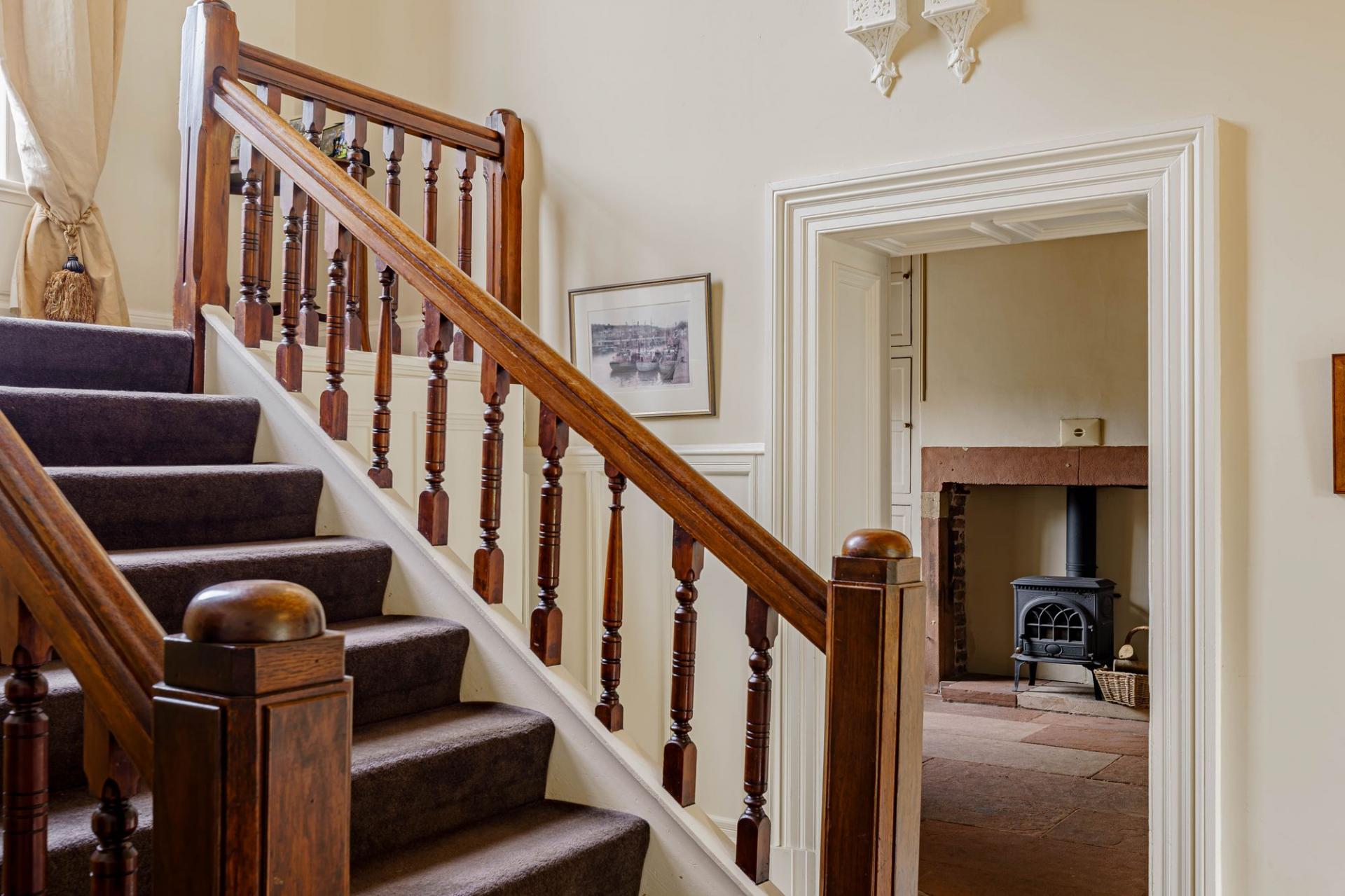 The front entrance leads directly on to a grand and elegant reception hall with period staircase, radiators and original Victorian tiled floor leading to the half landing and stained-glass window. From the hall are three main reception rooms. The drawing room is tastefully decorated, sizeable with a generous bay window looking onto the front lawn with quality ornate mouldings and period features including fireplace and Jotul wood burner. There is a generous and elegant formal dining room with a second bay window and original built in display cabinets and solid oak floor. From the hall is an additional reception room, currently as a tv/snug and a tastefully fitted downstairs cloakroom/WC. From the grand hallway there are steps down into the cellar. The rear entrance to the property opens into the original back kitchen now a practical boot room full of delightful period features including a stone flagged floor, meat hooks and original press cupboards either side of the sandstone fireplace complete with a second Jotul wood burner.Leading from here is the utility room, also with sandstone flags,ample work surface, shelving and built in cupboards, there is plumbing for white goods and a generous Belfast sink. The kitchen is characterful, bright and spacious with oak floor and windows to both the front and rear of the property. It has a range of floor and wall mounted cupboards with mixture of Kirkstone Slate and wooden worksurfaces. There is also an integrated fridge, dishwasher and a four oven, oil fired Aga with two cooking plates and a warming plate. The kitchen opens into a bright and airy informal dining room with window onto the garden.