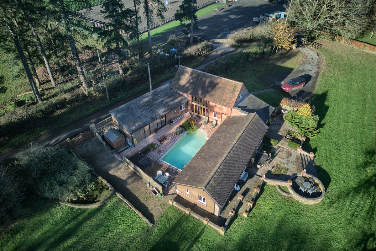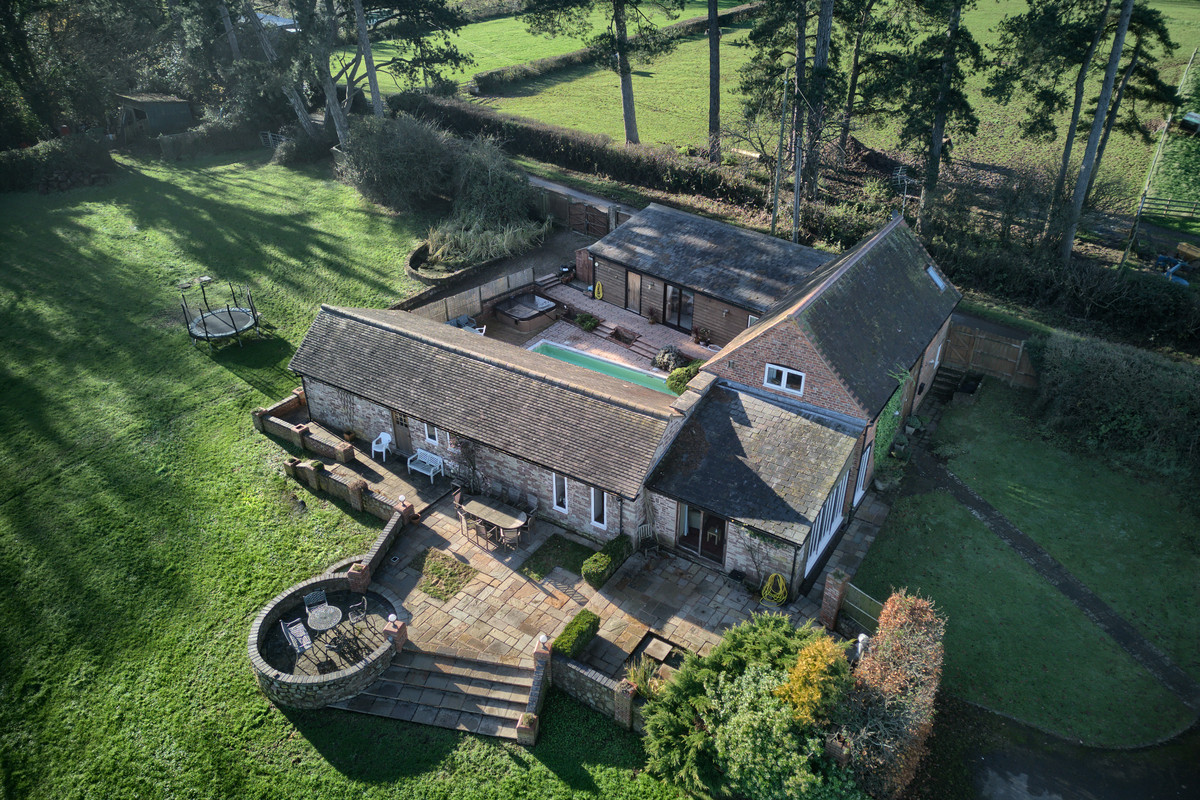 Churchlands is a stunning, detached, barn conversion set within approximately 2.5 acres of serene countryside. Extensively extended and beautifully renovated, this 4-bedroom (with an opportunity for a 5th bedroom), 3-bathroom home offers spacious family living with 2 reception rooms. The dining room, with its vaulted ceiling and grand proportions, serves as a true focal point of the home. The property boasts breath-taking, uninterrupted views and features a central courtyard, complete with an outdoor heated swimming pool and hot tub, embraced by the u-shaped layout of the house. With planning consent (Ref: DMN/110316/FH) already in place for a triple-bay garage including tractor and implement store, there is further potential for future development. Additional highlights include a lovely entrance hall with full-height windows that frame the exceptional surrounding views. The setting is rural and tranquil, located on a quiet no-through road, offering the perfect peaceful retreat. Featured on Escape to the Country, this property combines residential charm with business potential, if desired.