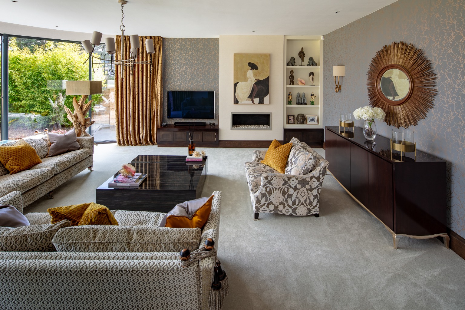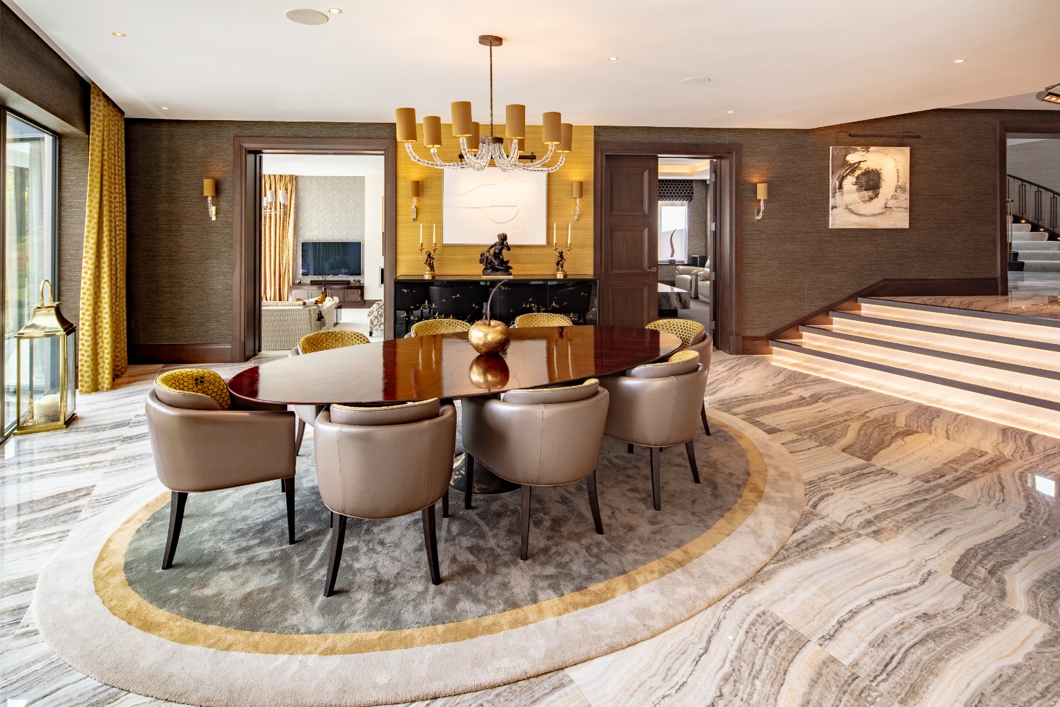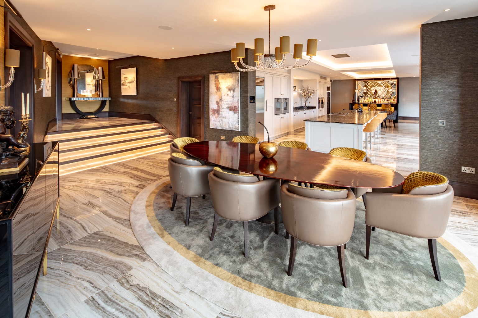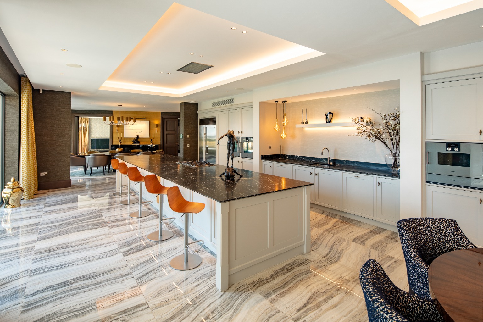 The entrance is a showstopper, with a grand galleried design and an impressive sweeping staircase, setting the tone for the rest of the home. The layout has been thoughtfully planned to take full advantage of the spectacular views, with wide steps leading down to an open-plan dining area that flows seamlessly into the kitchen and living spaces. The kitchen is a culinary enthusiast’s dream, fitted with top-of-the-line Gaggenau appliances and Sub Zero fridges. The living area features a 20-foot span of bi-fold doors, allowing natural light to flood the space while providing access to a sunny terrace.