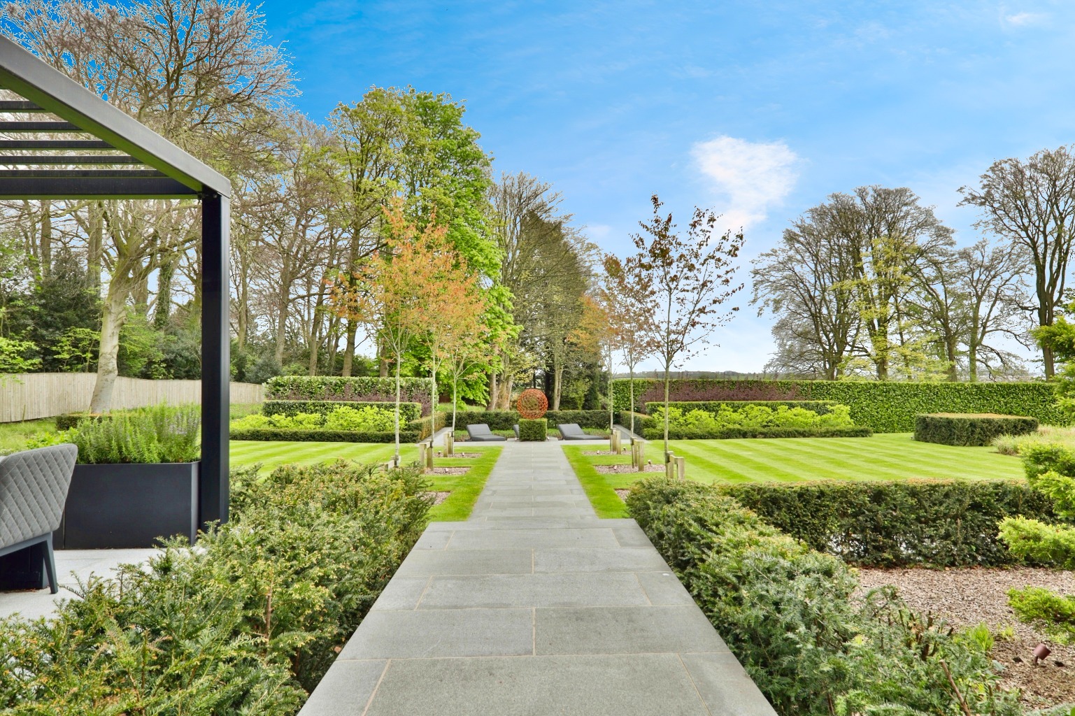 The exterior of the property is equally impressive, with contemporary electric gates leading to a spacious parking area. The outdoor entertaining area spans the full width of the house, featuring a pergola and a central pathway leading to a sunken sun terrace. The landscaped grounds extend to a large lawn with mature specimen trees, creating a perfect setting for outdoor enjoyment. This home is a truly remarkable find, combining luxury, functionality, and spectacular views in one exceptional package.