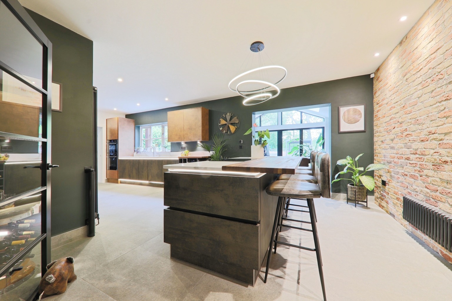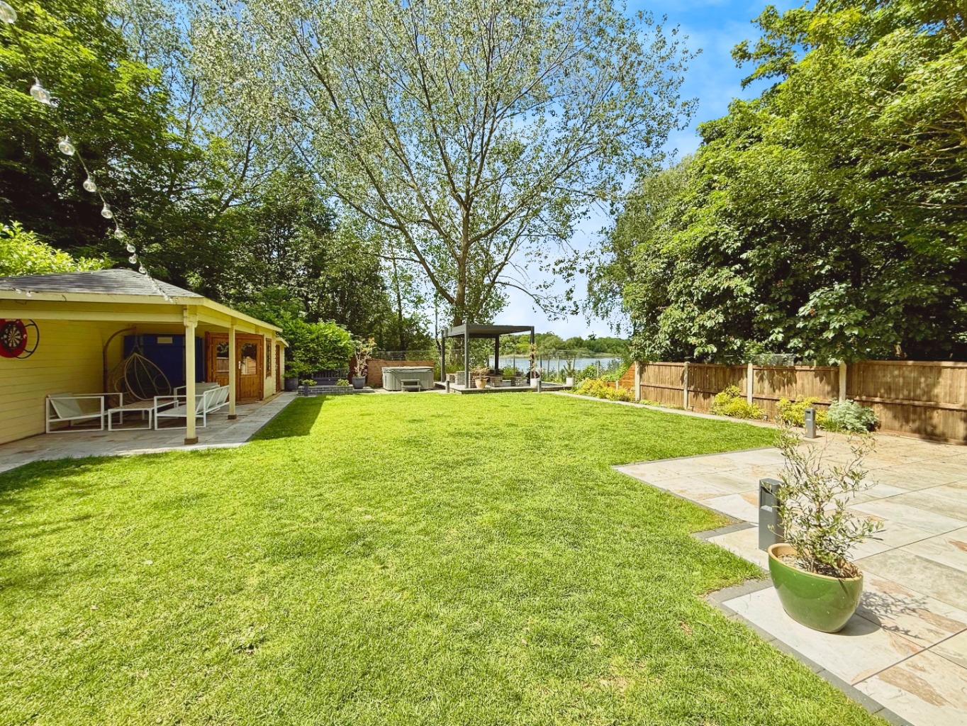 The living room is spacious and welcoming, with a walk-in bay window that brings in lots of natural light. It has double doors opening into the superb dining kitchen, which is over 25 feet wide. This space has been designed for both family life and entertaining, with a centre island unit, integrated appliances, and stylish finishes throughout. The open-plan layout continues into a vaulted garden room with bi-fold doors that open right out to the lake view, creating a seamless indoor-outdoor feel.