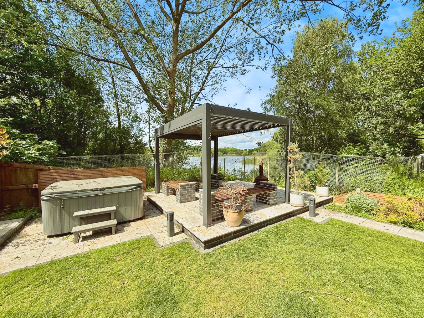 Outside, the garden has been planned with entertaining in mind. There’s a large covered terrace, perfect for barbecues in all weathers, a smart gazebo by the lakeside, and a summerhouse attached to the terrace. It’s a lovely spot to relax with friends and family.