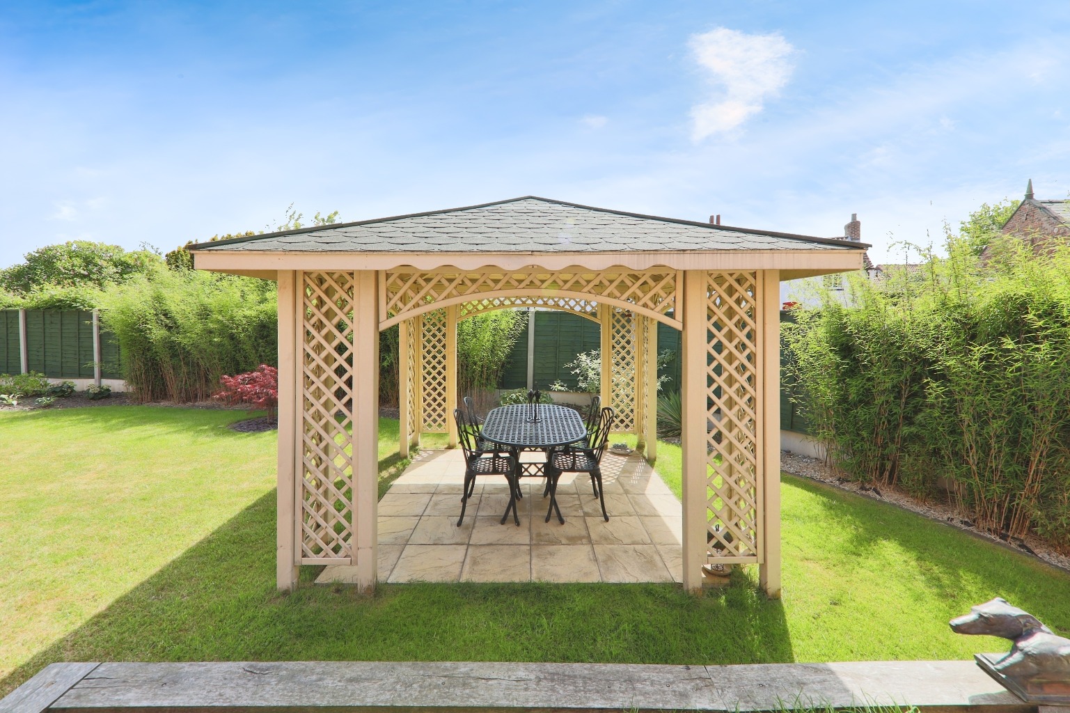 Outside, the house sits on a wide plot with an in-and-out driveway and a double brick garage. The rear garden is private and mainly laid to lawn, with a gazebo and seating area for outdoor entertaining.
