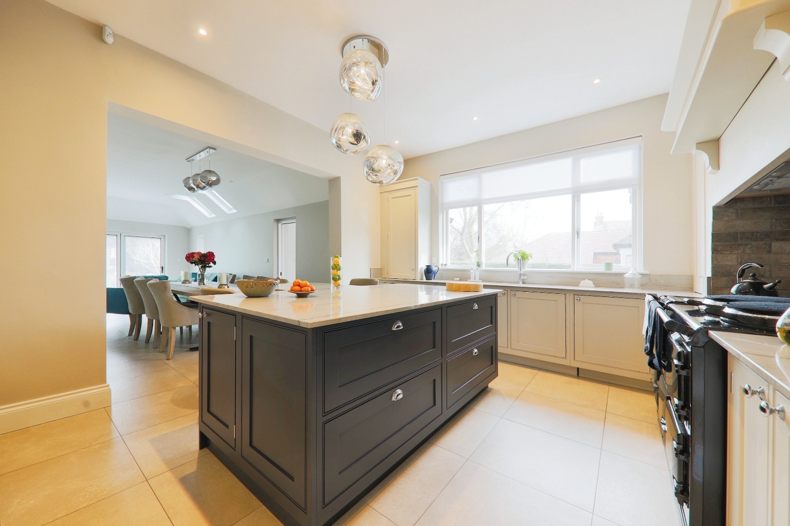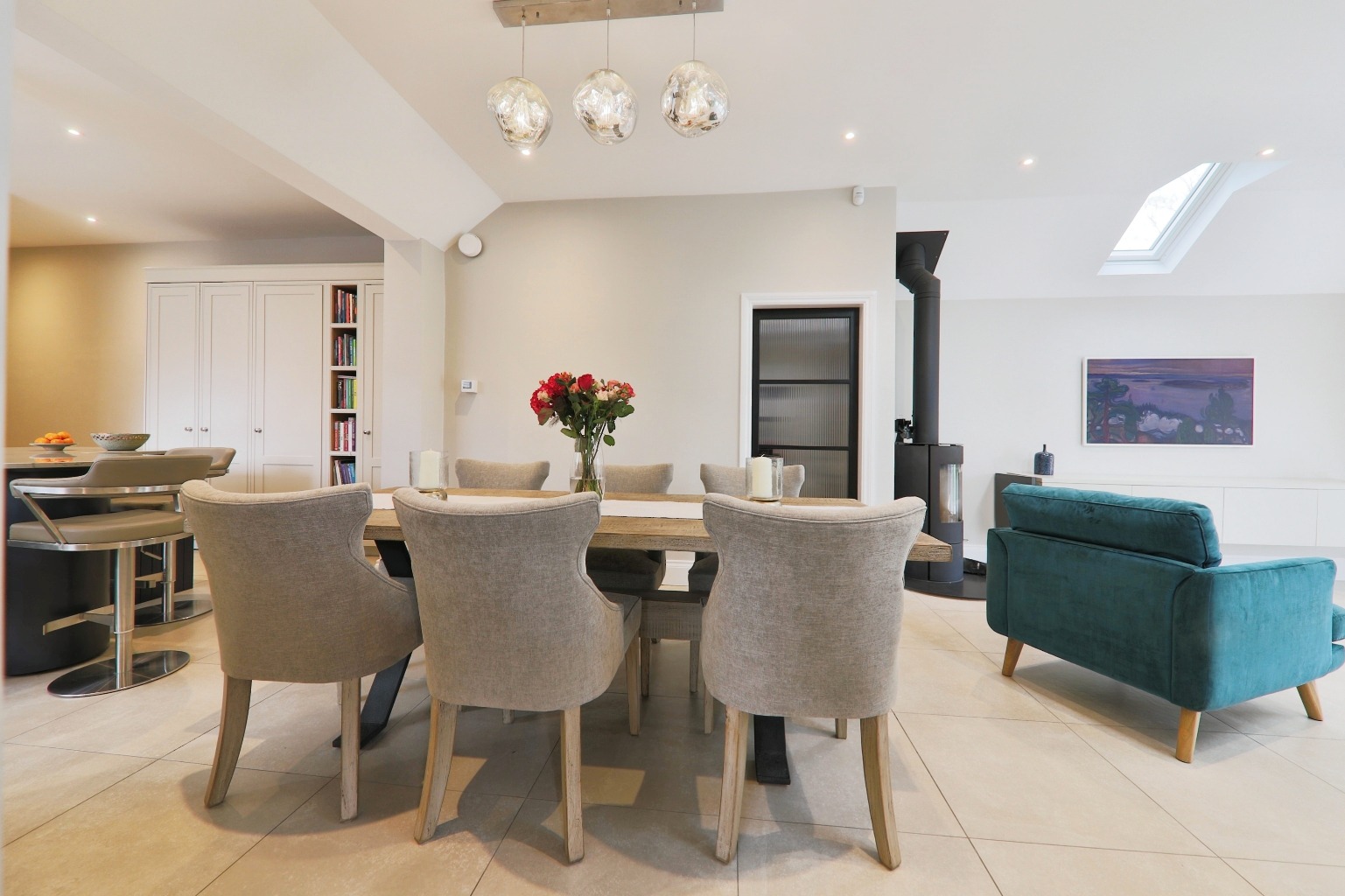One of the real highlights is the incredible open-plan kitchen, dining, and living space. Measuring an impressive 37’6” x 13’6”, it has been finished to a high specification, seamlessly blending classic style with contemporary features. Bi-fold doors open directly onto the garden, creating a fantastic indoor-outdoor flow—perfect for family gatherings or entertaining guests.