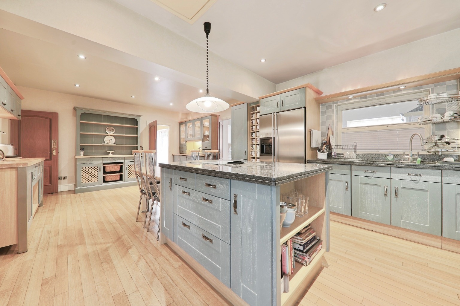 At the centre of the house is the standout kitchen – over 30ft long – with granite tops, a large island, integrated appliances, and open plan access to the orangery.