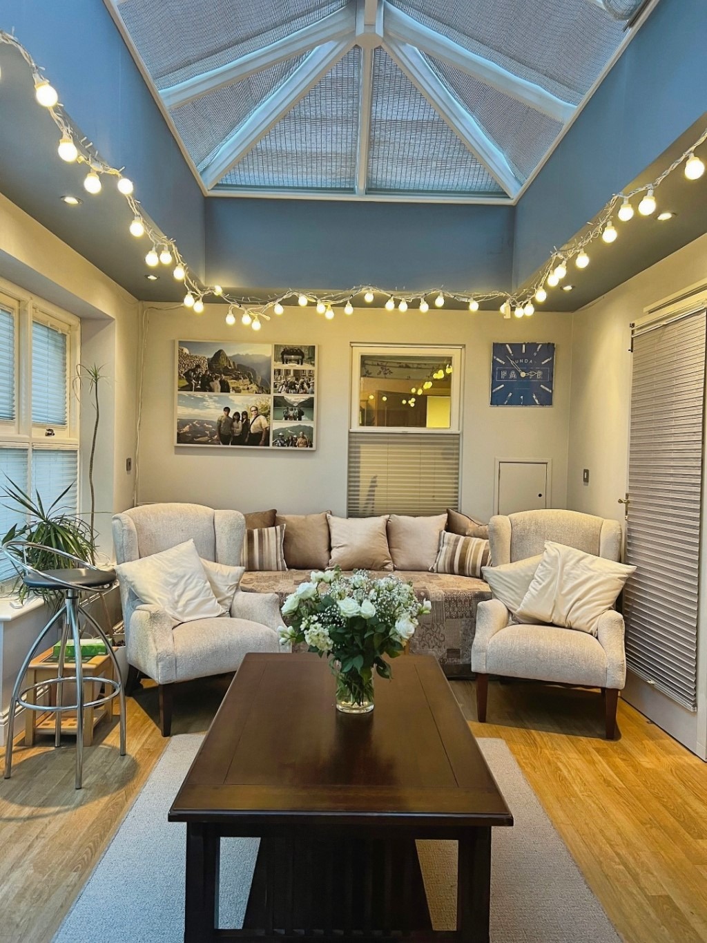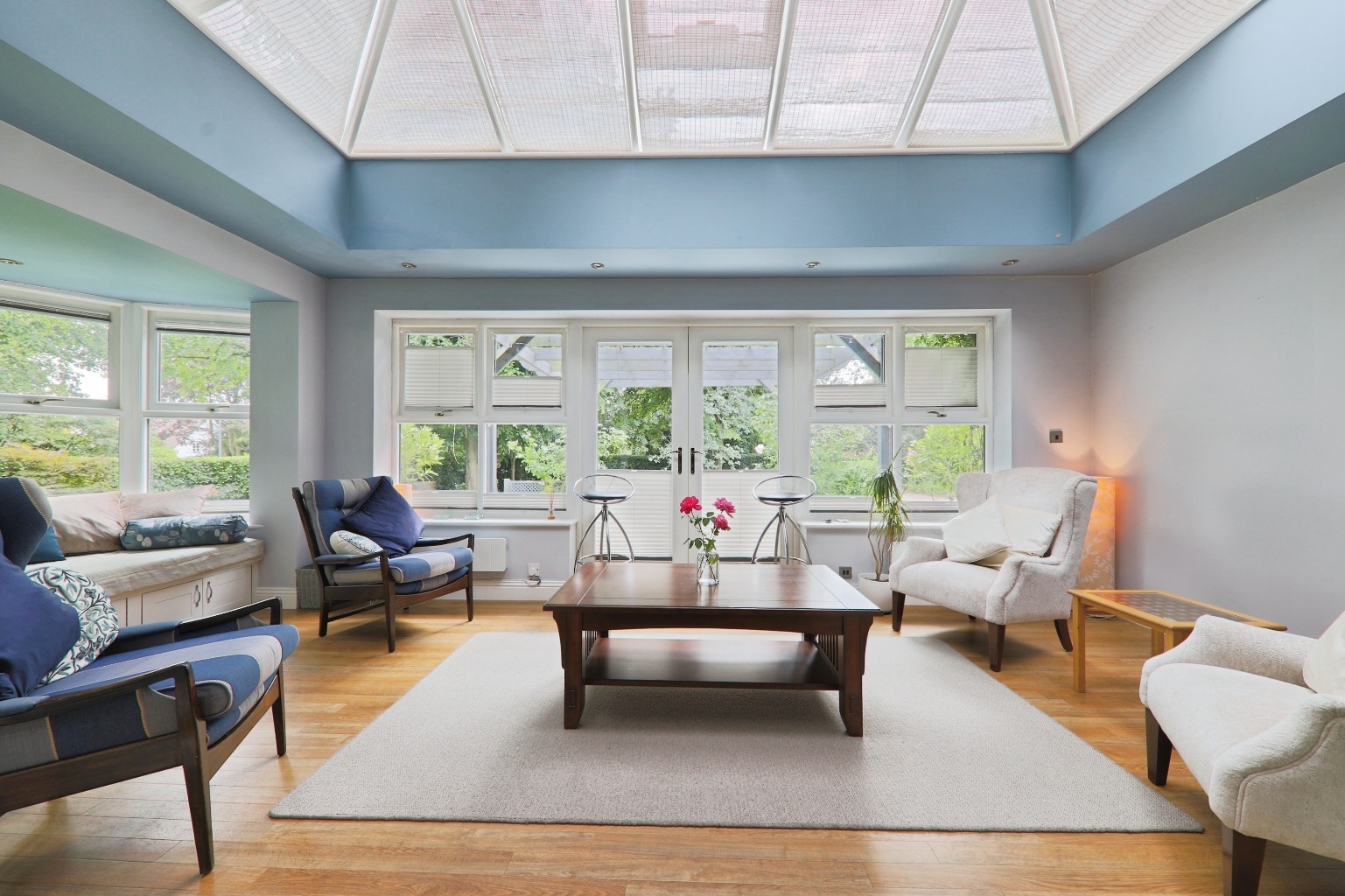The orangery has a lovely vaulted rooflight and a deep walk-in bay window looking out over the south-facing garden. It's a bright, comfortable space that works well as an extra sitting or dining area.