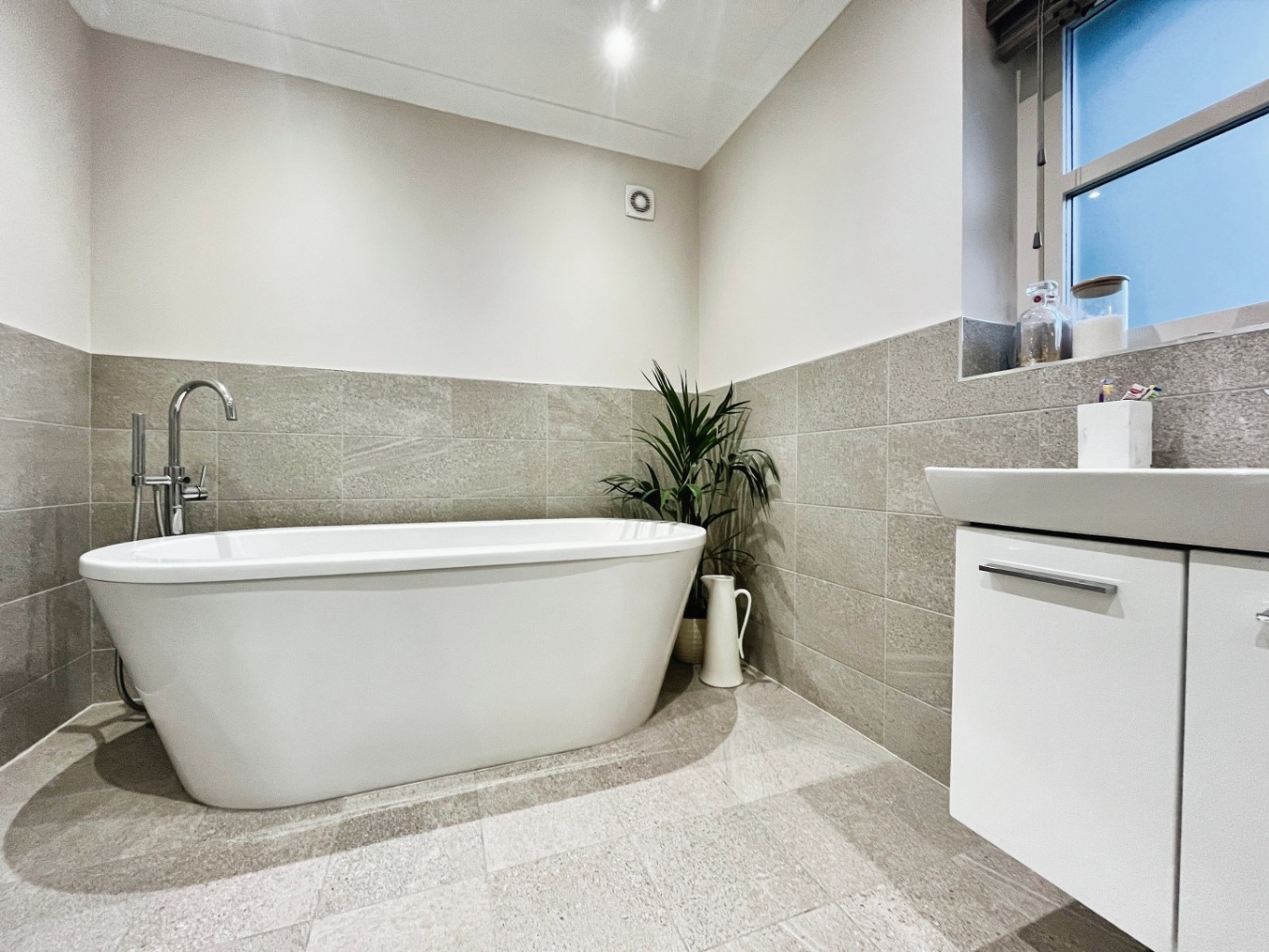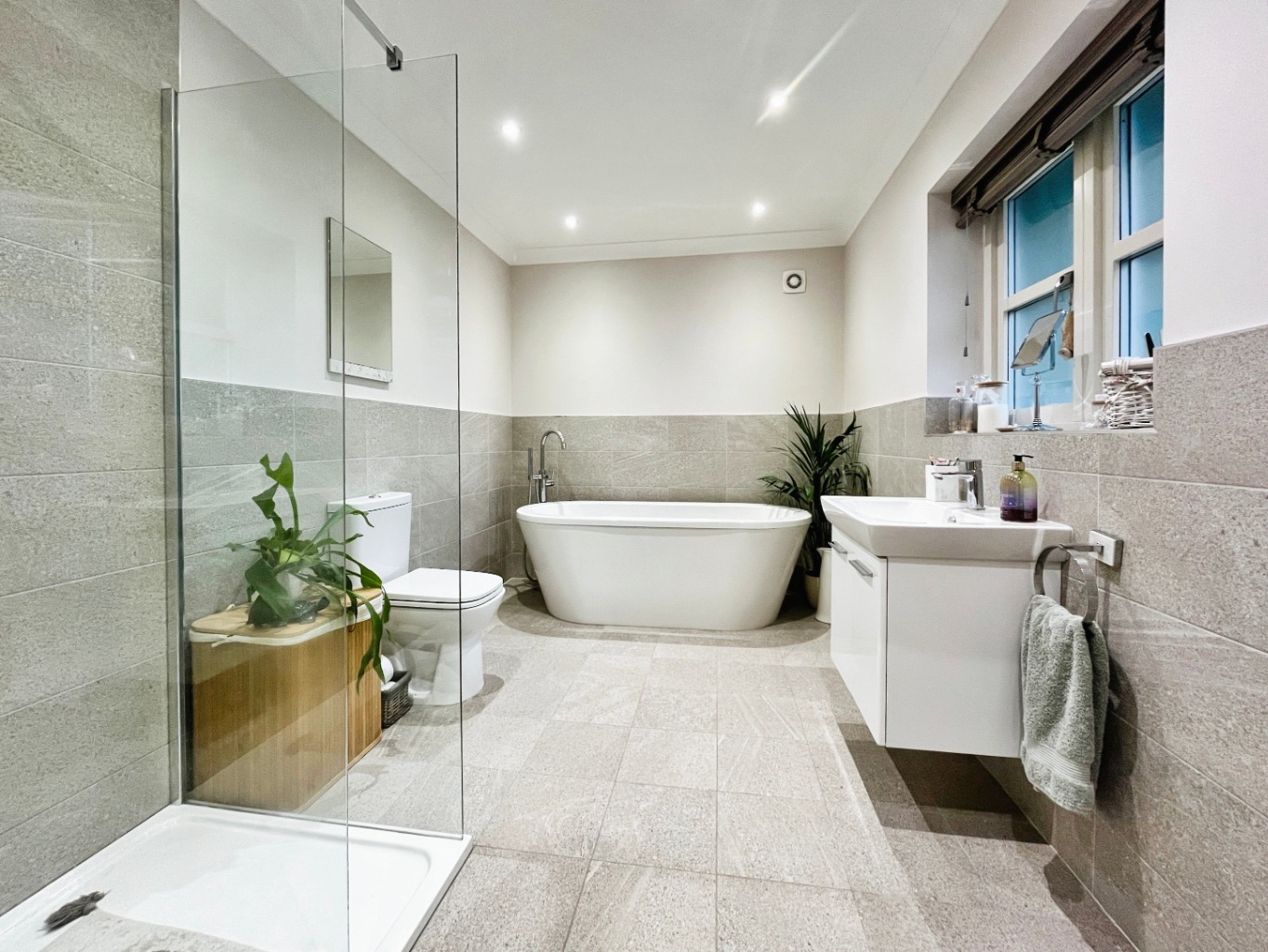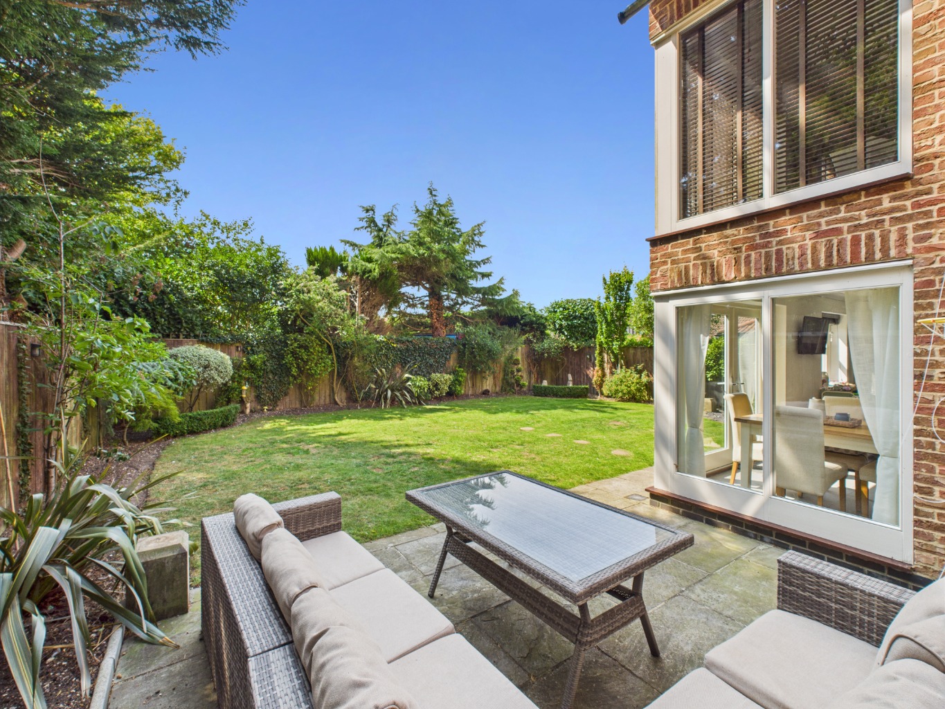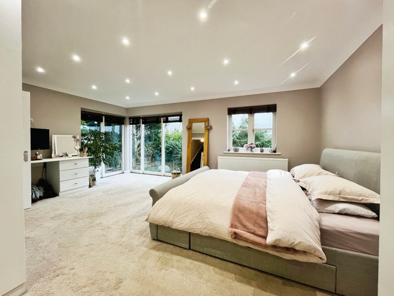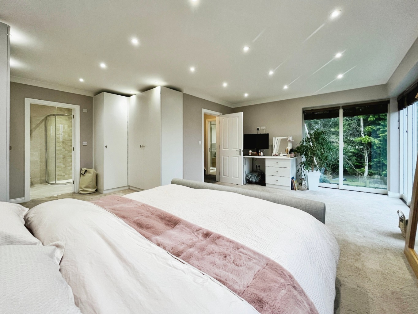 The first floor hosts a fabulous principal suite with an eye-catching floor-to-ceiling corner window, extensive fitted furniture, and a stylish en-suite. Two additional double bedrooms and a spacious family bathroom with both a large shower enclosure and freestanding bath complete this level. On the top floor, there is a generous guest bedroom with an en-suite facility, plus a fifth double bedroom currently used as a home office.