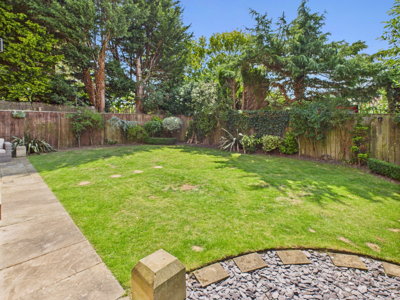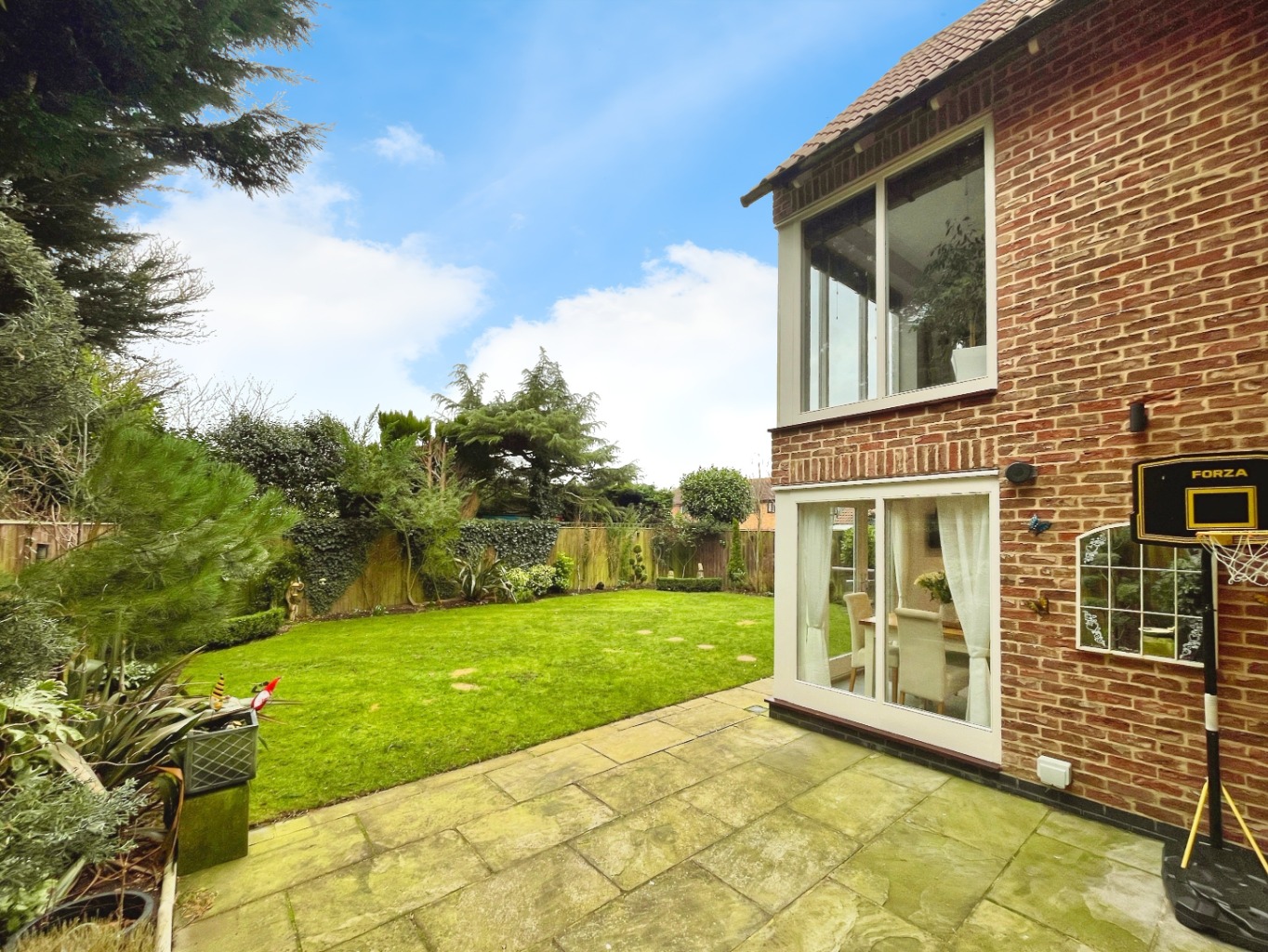 Externally, a generous block-paved frontage offers ample vehicle space in front of the detached double garage, with attractive landscaping extending to the rear garden. The garden enjoys a sunny south-westerly aspect, providing enviable privacy with its lawn, established borders, and paved patio terrace.