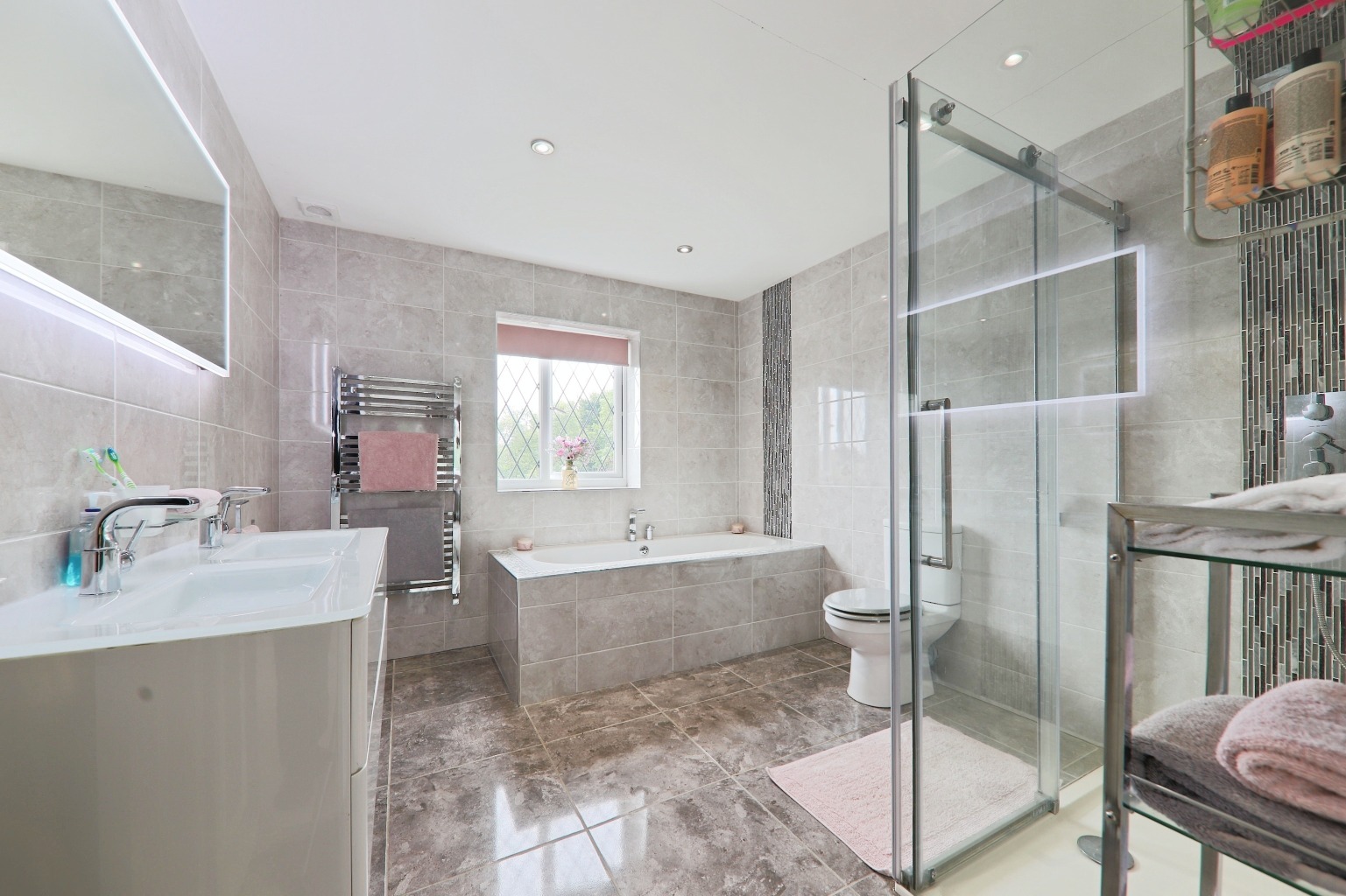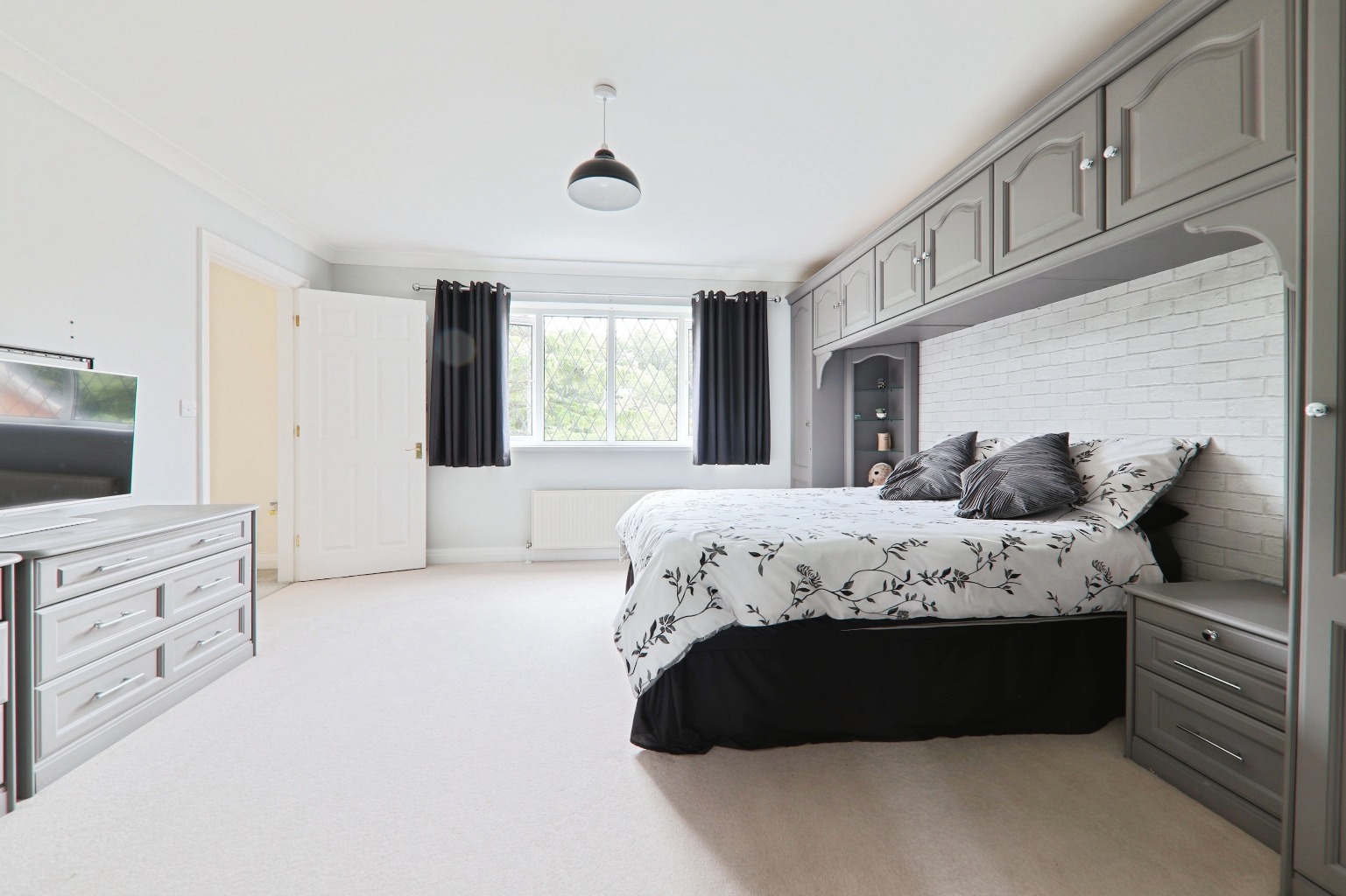 Upstairs, the master suite is spacious and fully fitted, with a luxurious five-piece en-suite. The guest bedroom also has its own en-suite, shared via Jack and Jill access with the third bedroom. Two further doubles and a family bathroom complete the first floor.